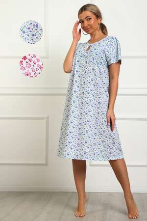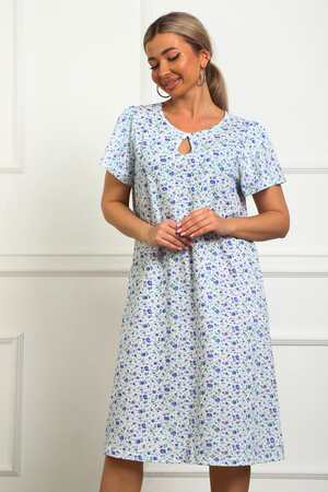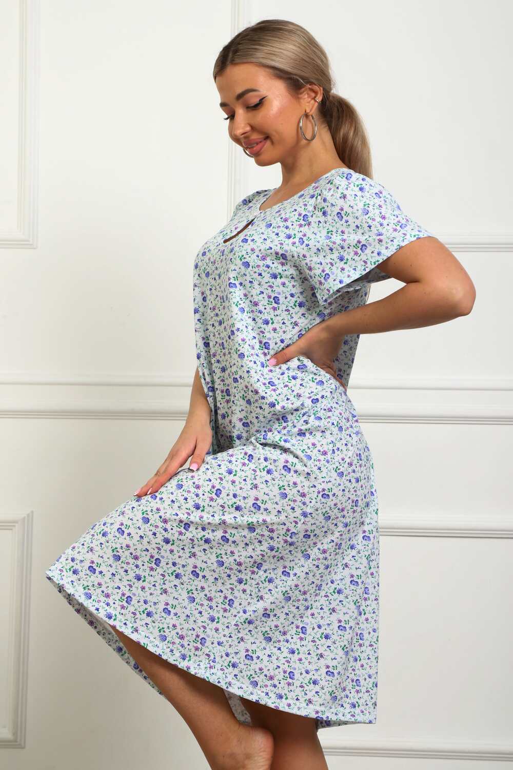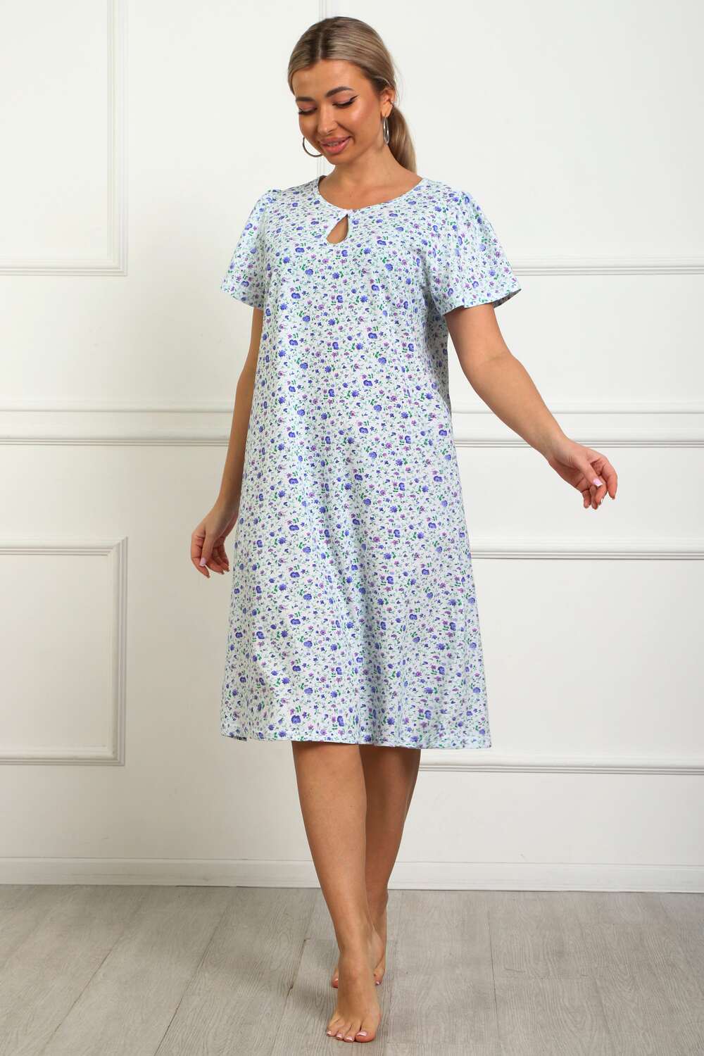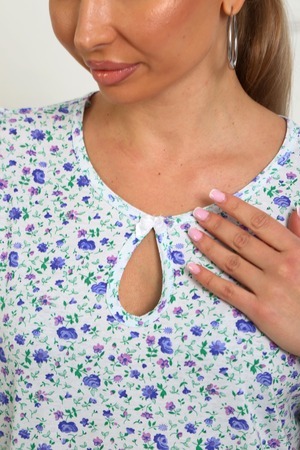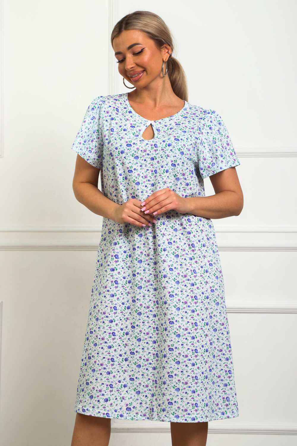 Сорочка женская из натурального набивного трикотажа, хлопок 100%. Силуэт свободный, расширенный к низу. Горловина круглой формы с капелькой по центру. Обработана окантовкой. Отделкой служит бантик. Рукав короткий, свободный. В верхней части оката выполнена небольшая сборка. Низ изделия прямой. Длина ниже колена.