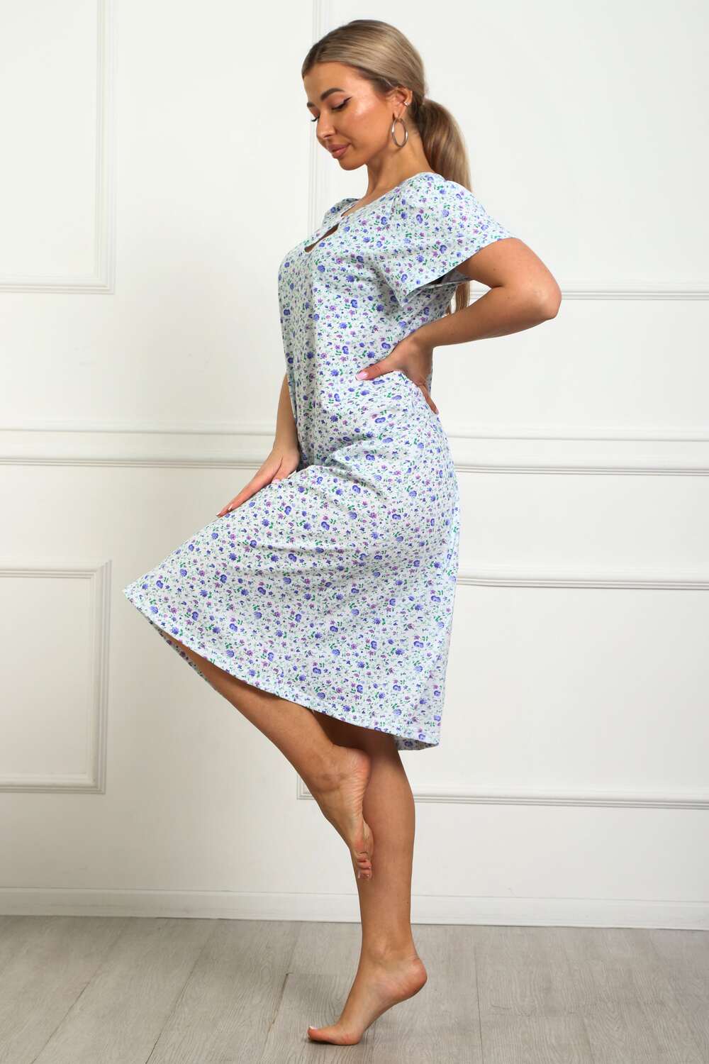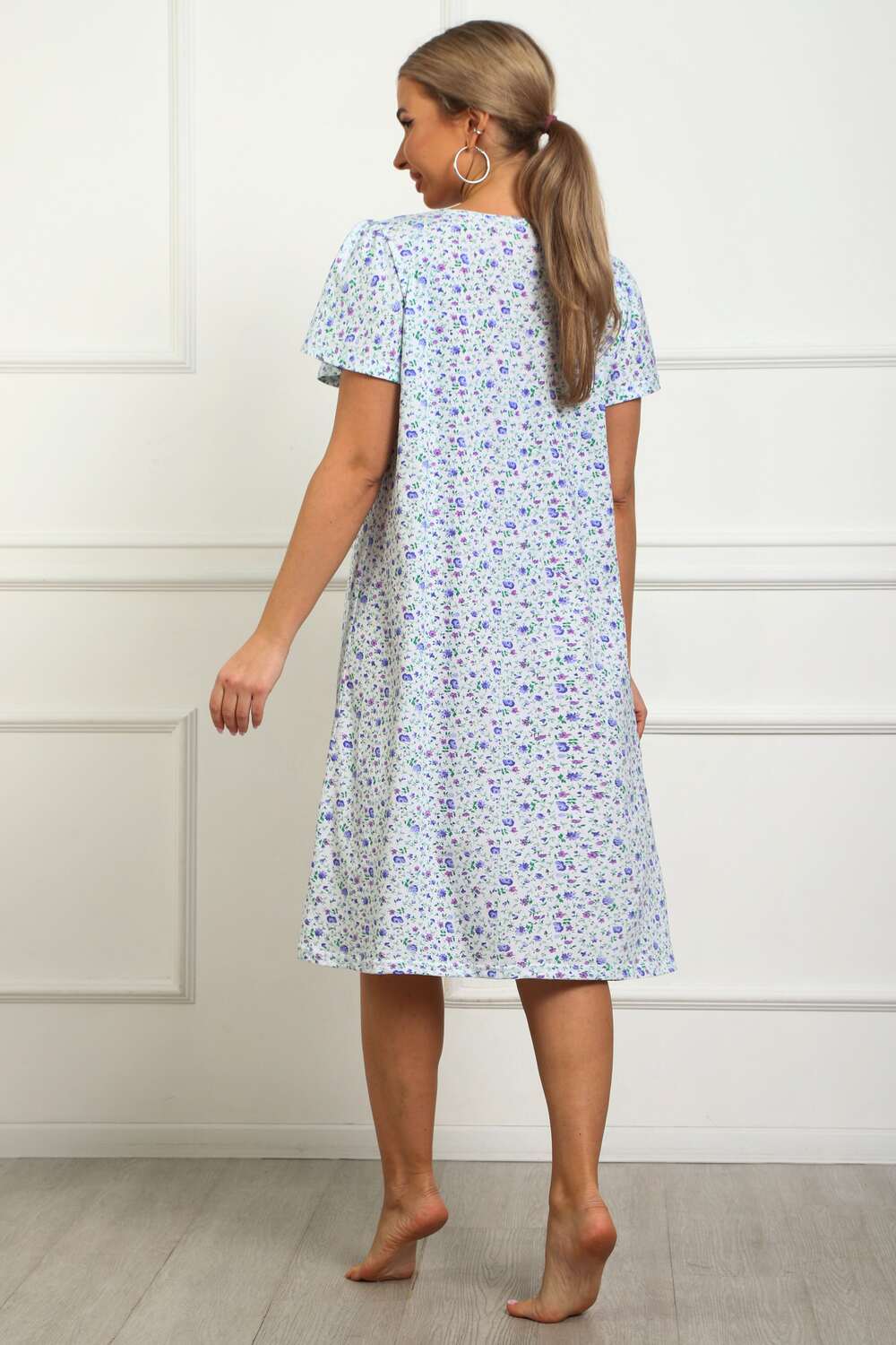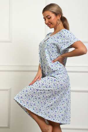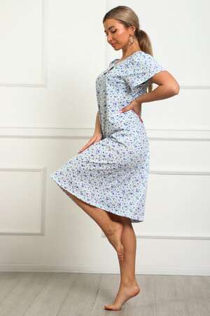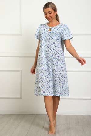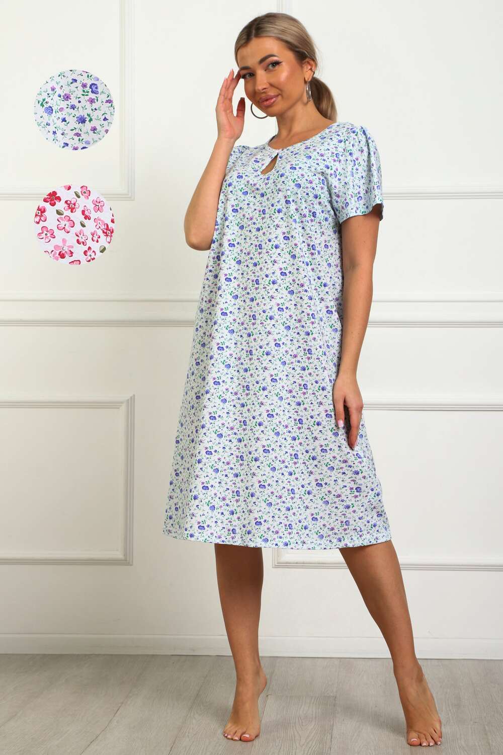 Сорочка женская из натурального набивного трикотажа, хлопок 100%. Силуэт свободный, расширенный к низу. Горловина круглой формы с капелькой по центру. Обработана окантовкой. Отделкой служит бантик. Рукав короткий, свободный. В верхней части оката выполнена небольшая сборка. Низ изделия прямой. Длина ниже колена.