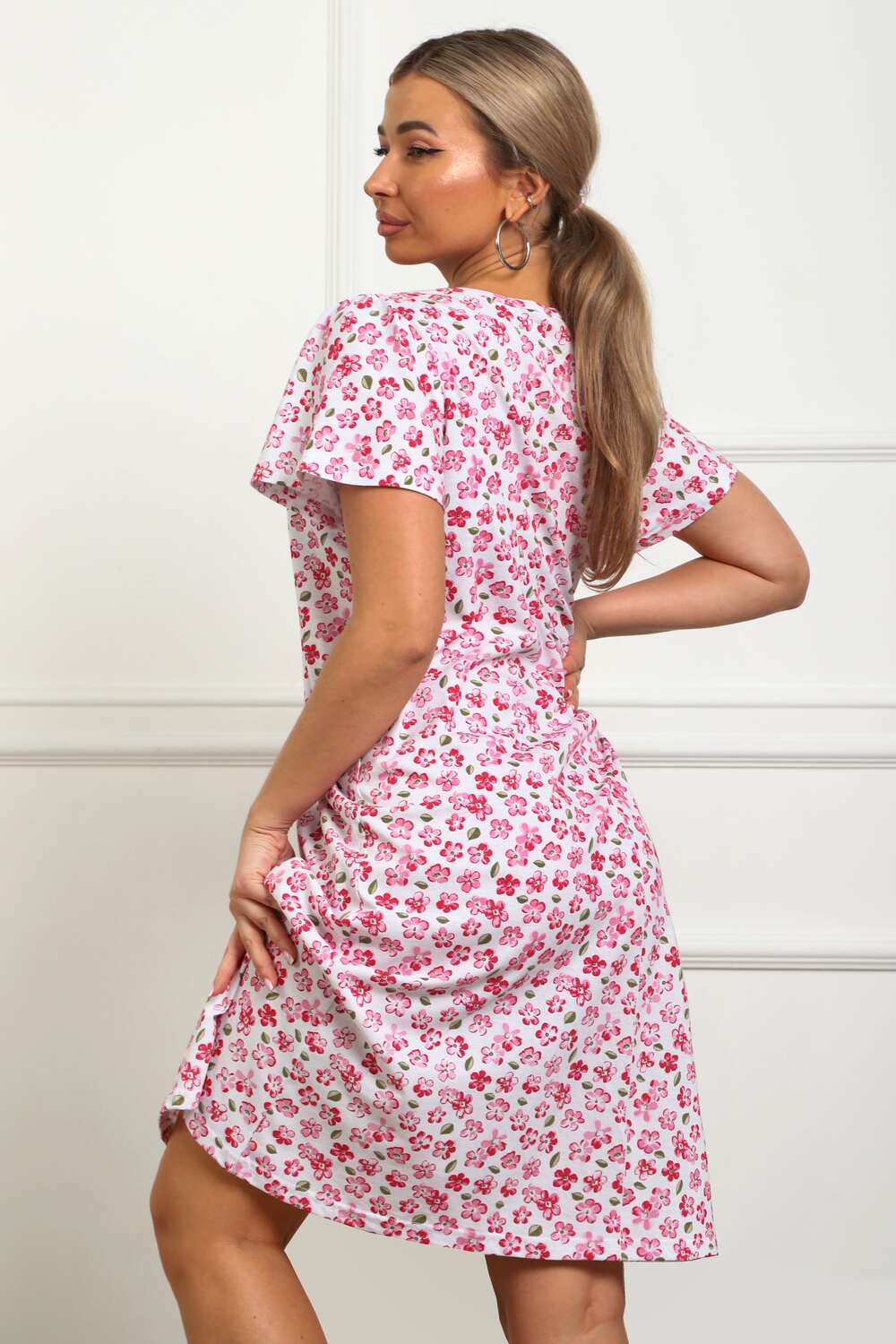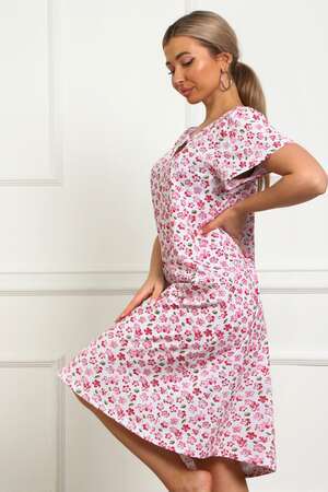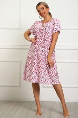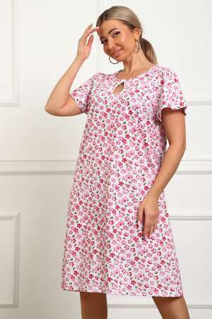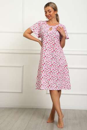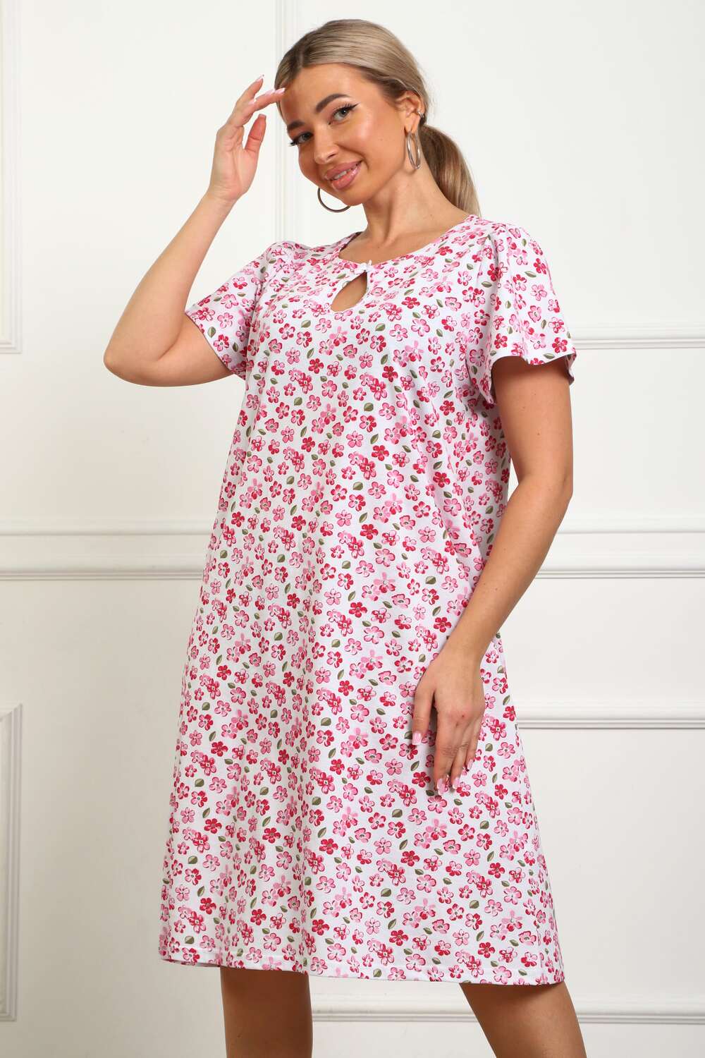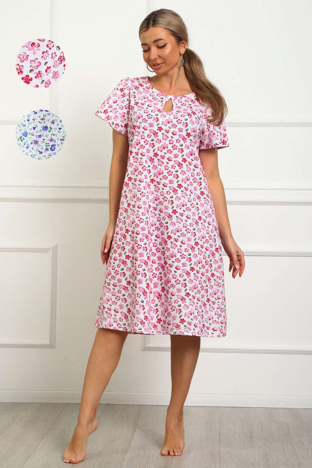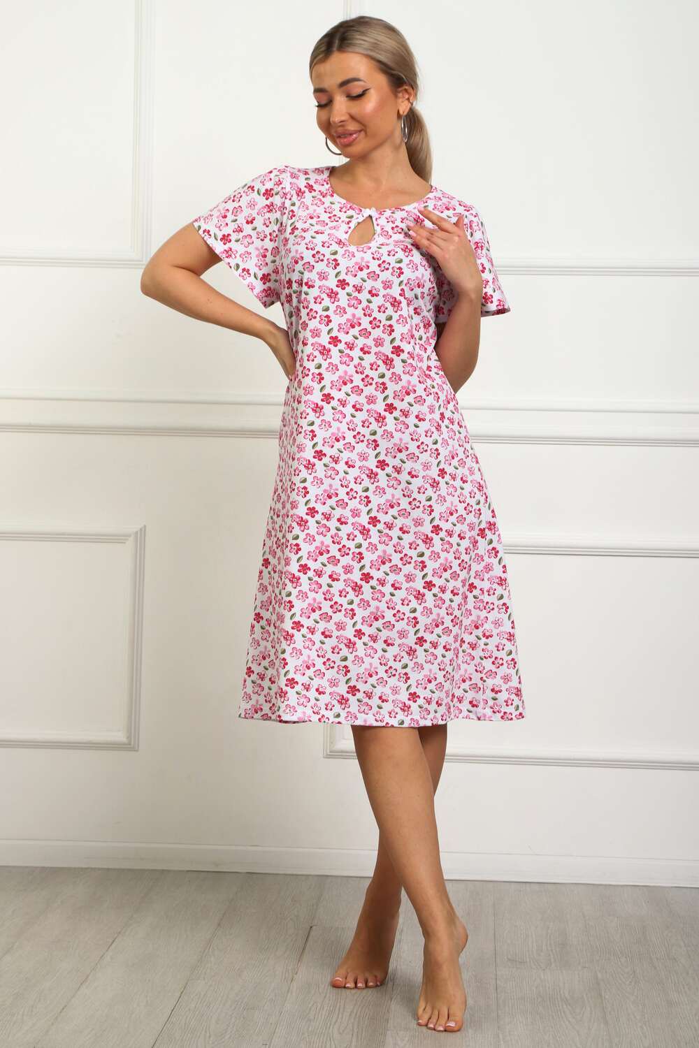 Сорочка женская из натурального набивного трикотажа, хлопок 100%. Силуэт свободный, расширенный к низу. Горловина круглой формы с капелькой по центру. Обработана окантовкой. Отделкой служит бантик. Рукав короткий, свободный. В верхней части оката выполнена небольшая сборка. Низ изделия прямой. Длина ниже колена.