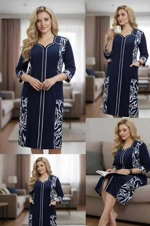 Этот элегантный халат — идеальный выбор для женщин, которые ценят комфорт, не забывая о стиле. Модель выполнена в глубоком темно-синем цвете, который гармонично сочетается с контрастной белой отделкой и эффектным растительным орнаментом. Вертикальная застежка-молния и боковые вставки с белым принтом визуально вытягивают силуэт, делая фигуру более стройной и изящной. На спинке предусмотрен вшитый пояс-завязка, который позволяет аккуратно приталить модель точно по вашей фигуре. Рукав длиной 3/4 не мешает домашним делам, а глубокие накладные карманы позволяют всегда держать под рукой телефон или другие мелочи. Фигурное каре с аккуратным кантом подчеркивает зону декольте, сохраняя при этом сдержанный и достойный вид. Халат выполнен из мягкого велюра, приятного на ощупь материала, который отлично пропускает воздух и дарит ощущение уюта в любое время года. В такой одежде приятно начинать утро за чашкой кофе или отдыхать после рабочего дня, оставаясь при этом женственной и ухоженной.