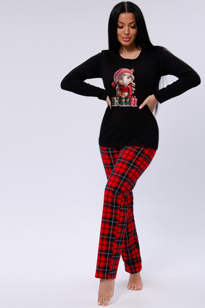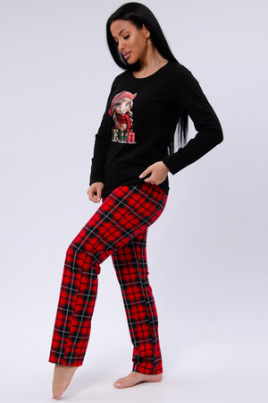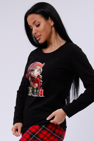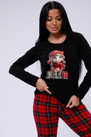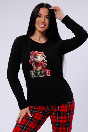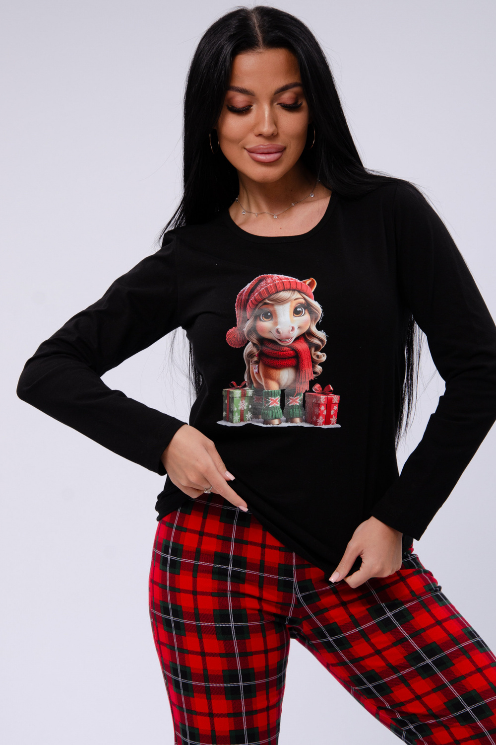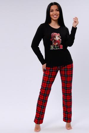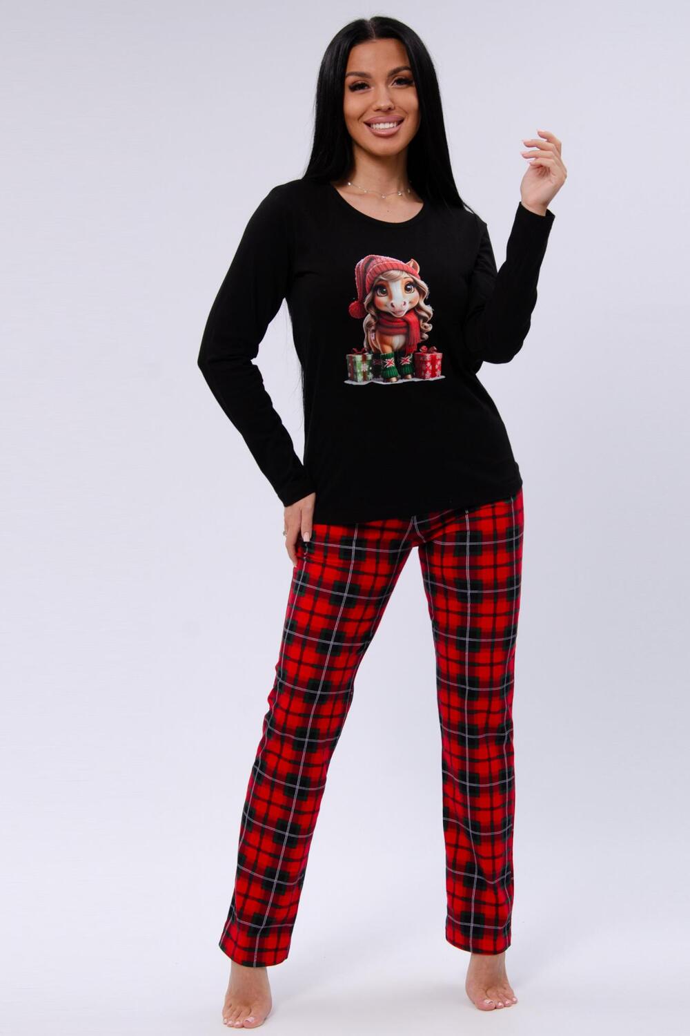 Пижама женская со штанами изготовлена из мягкой ткани (100 % хлопка), которая обладает дышащими и влаговпитывающими свойствами, идеально подходит для сна, обеспечивает максимальную практичность и воздухопроницаемость, облегчая сон даже в самые жаркие и холодные ночи. Женский домашний костюм состоит из тонкого хлопкового лонгслива и легких брюк, которые создают комфортный домашний уют дома. Милая женская пижамка украшена новогодним принтом (символ нового года). Пижама женская яркая и в тоже время нежная, идеальна для беременных, будущих мам или в роддом, ведь в этой пижаме для беременных удобно весь день. Носить можно в любое время года: осенью или даже зимой под согревающим одеялом.