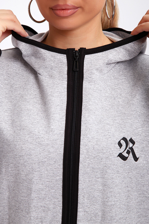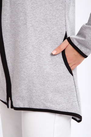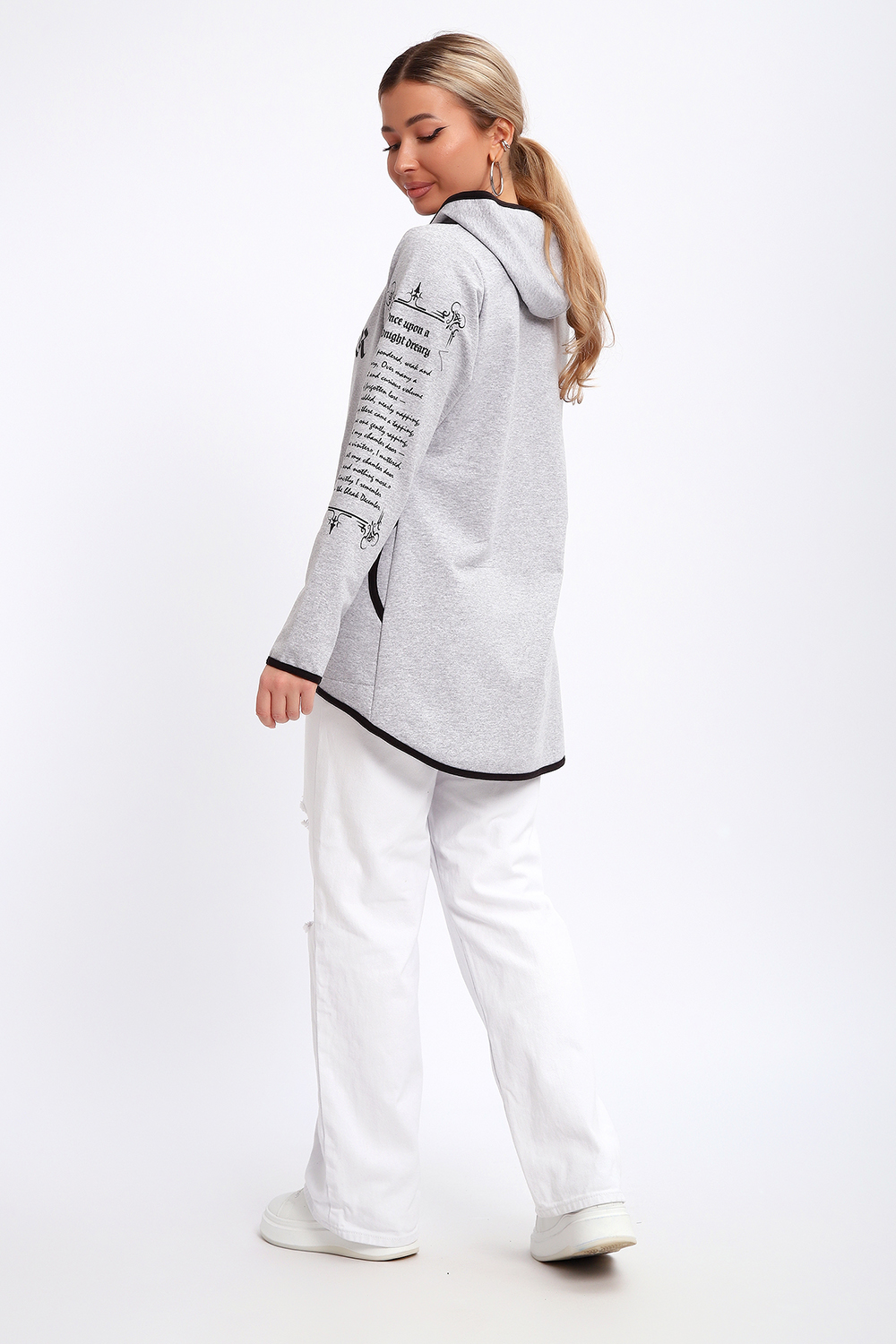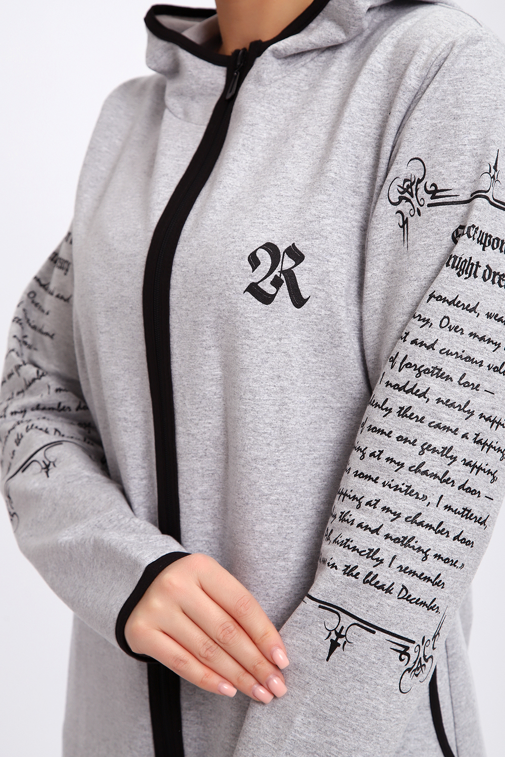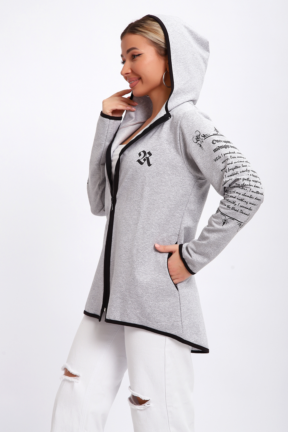 Туника необычного кроя на молнии, с капюшоном. Рукава длинные без манжетов, спинка длиннее переда. Карманы, рукава, капюшон и низ изделия обработан отделочной тканью. Принт на рукавах и полочке. Идеальное решение для прогулок, спорта или повседневного использования. Туника станет незаменимым элементом вашего гардероба.