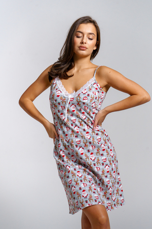 Женственная сорочка на бретелях из мягкого кулирного полотна с новогодним принтом. Чашки сорочки отрезные, верх которых обработан белым кружевом. Низ сорочки подшит специальным швом.