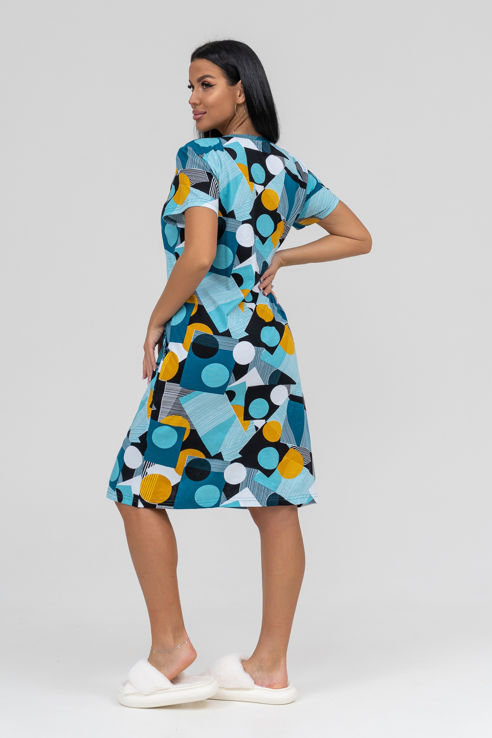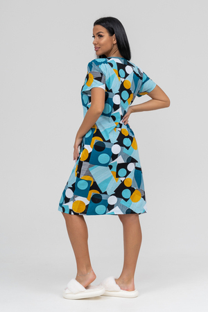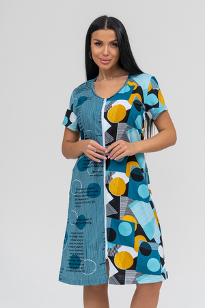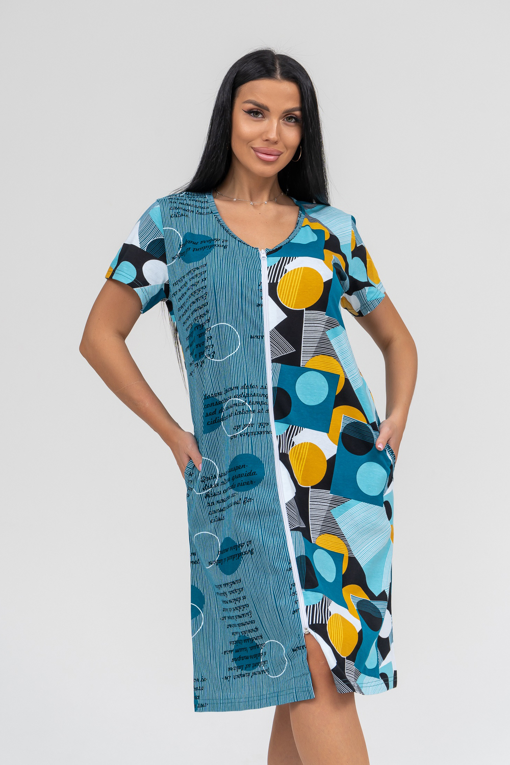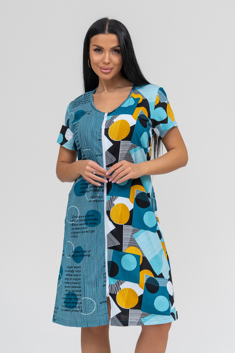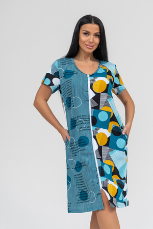 Халат женский с коротким рукавом на молнии, в боковых швах карманы.
