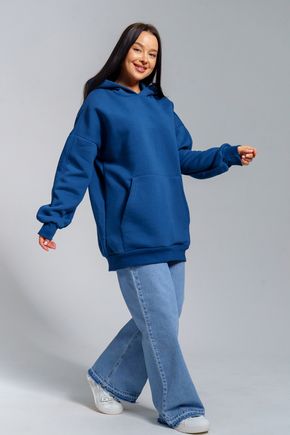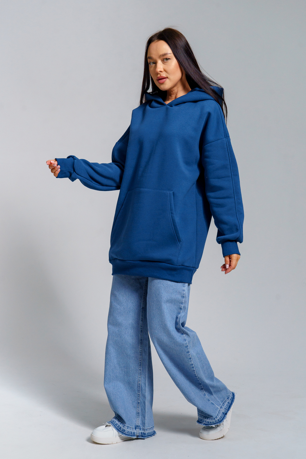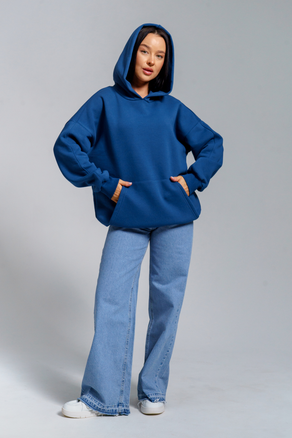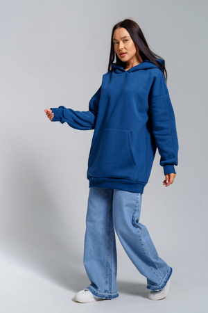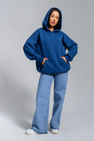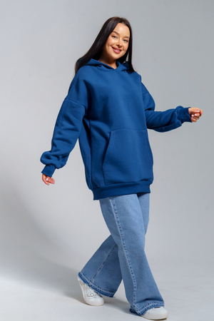 Толстовка из футера с начесом объемного покроя. Двойной капюшон, карман-кенгуру. Срезы обработаны кашкорсе в цвет основной ткани.