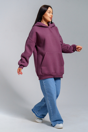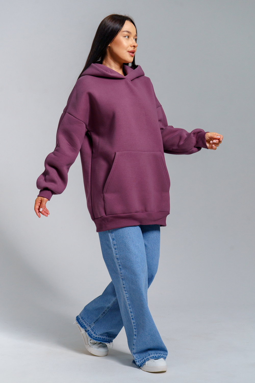 Толстовка из футера с начесом объемного покроя. Двойной капюшон, карман-кенгуру. Срезы обработаны кашкорсе в цвет основной ткани.
