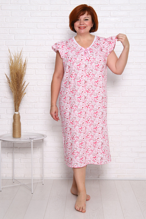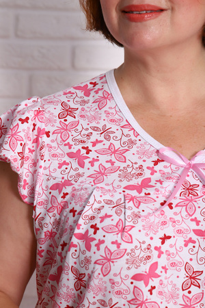 Женская сорочка свободного покроя с кокетками и рукавом - крылышком. Горловина сорочки окантована. Низ крылышек и сорочки обработаны декоративной строчкой.