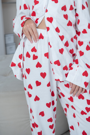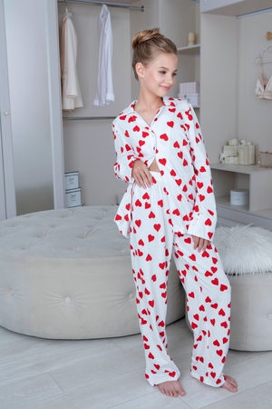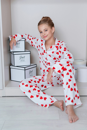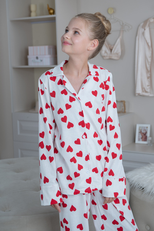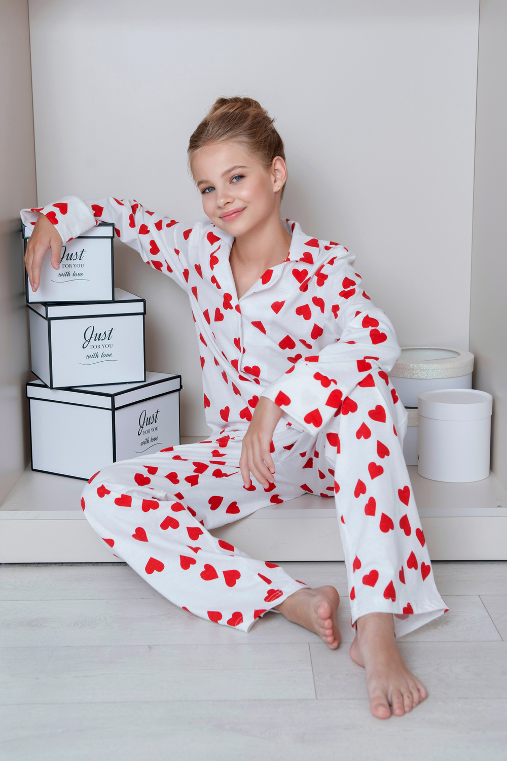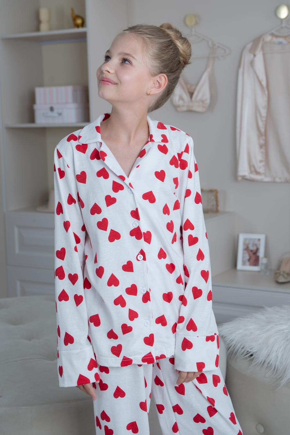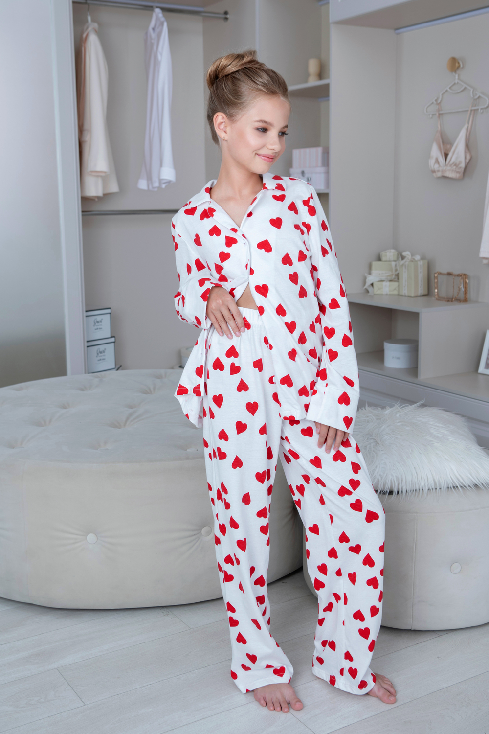 Нежная детская пижама из мягкого хлопка с забавным принтом в красные сердечки. Свободный крой и пуговицы создают комфорт и удобство при носке. Ткань дышит и приятна к телу. Отличный выбор для сна и домашних вечеров в уютной обстановке.