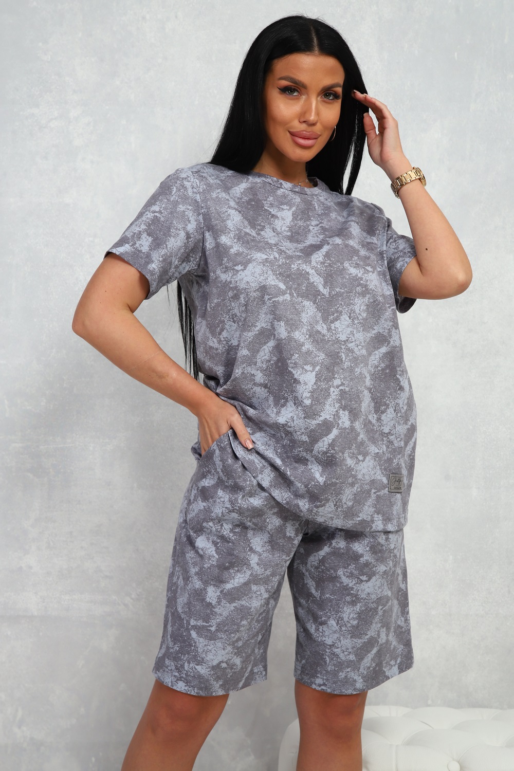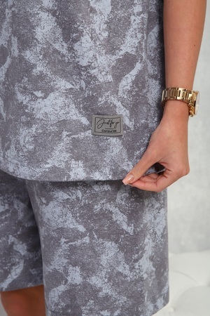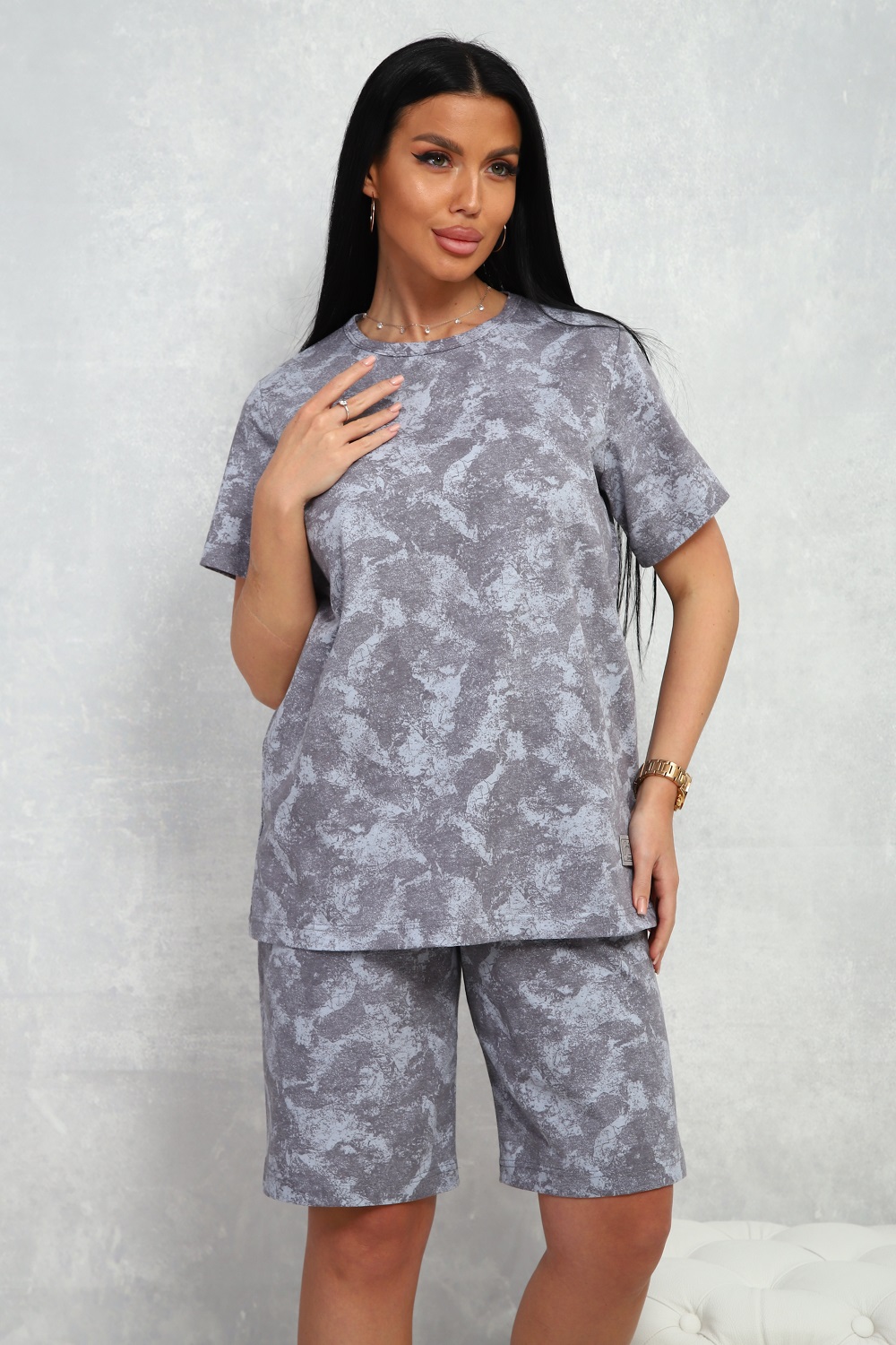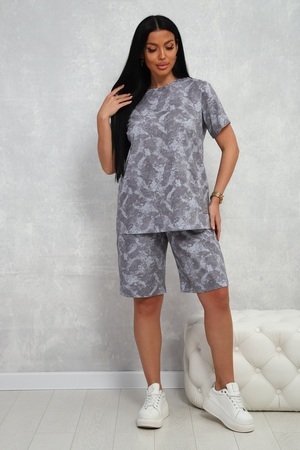 Костюм женский из 100% хлопка, стильная трендовая немаркая расцветка, футболка с короткими рукавами, шорты на эластичном поясе, с боковыми карманами. Универсальный выбор для дома, прогулок, занятий спортом.