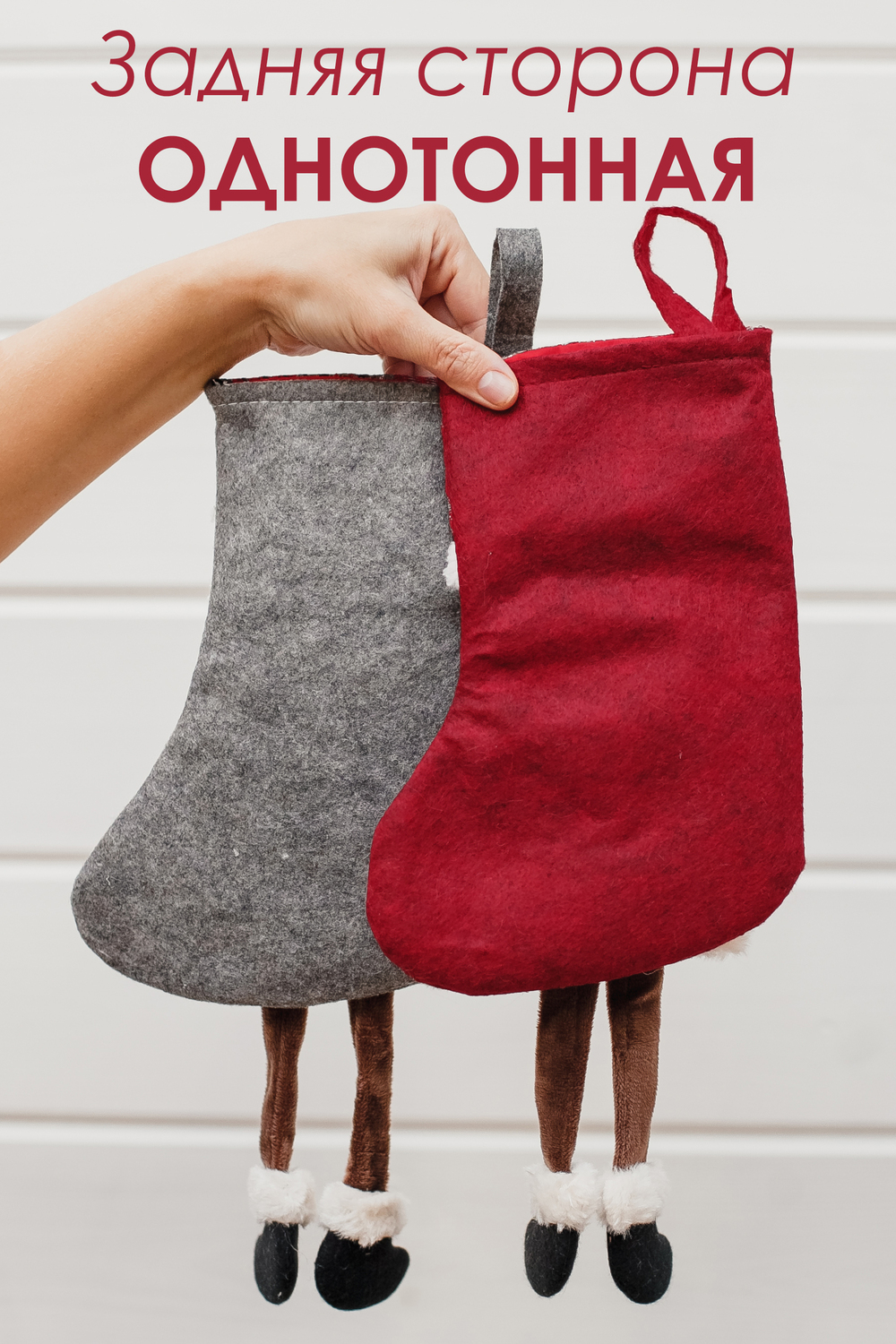 Подарочный носок‑сапожок — это одновременно милый декор и удобная, экологичная упаковка для новогодних презентов. Корпус выполнен из плотной ткани. Аппликация — олень или мишка — вырезана и сшита из фетра, дополнена декоративной строчкой, помпонами и элементами, придающими лицам животных выразительность и объём.