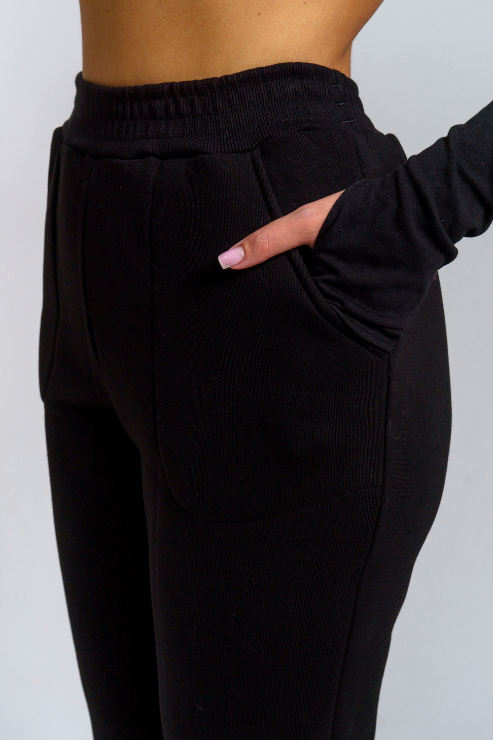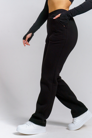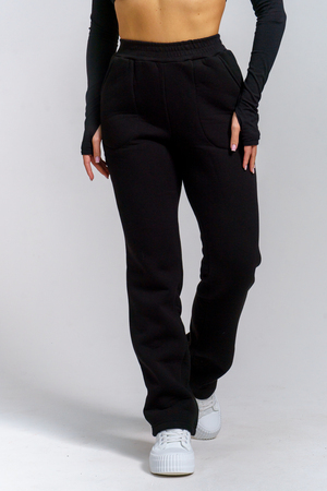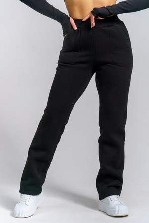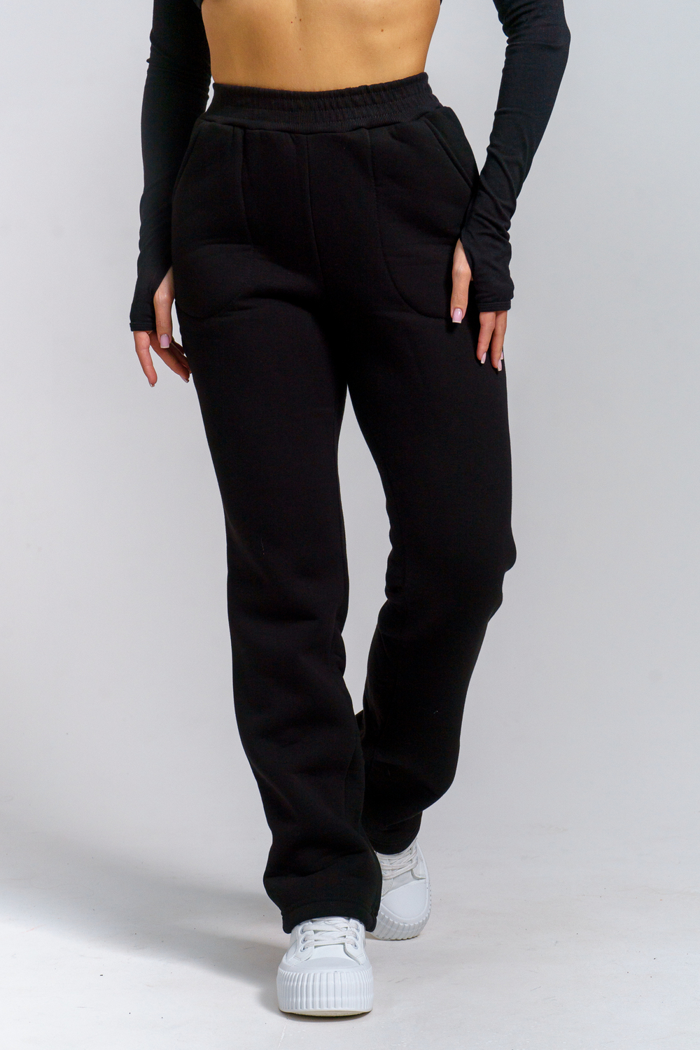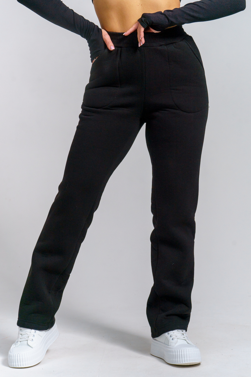 Брюки женские прямого силуэта с карманами из футерного полотна с начесом. Пояс из кашкорсе в цвет основной ткани отстрочен вместе с резинкой.
