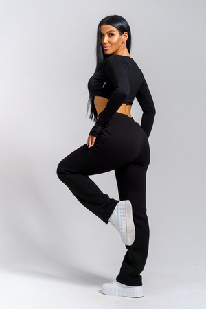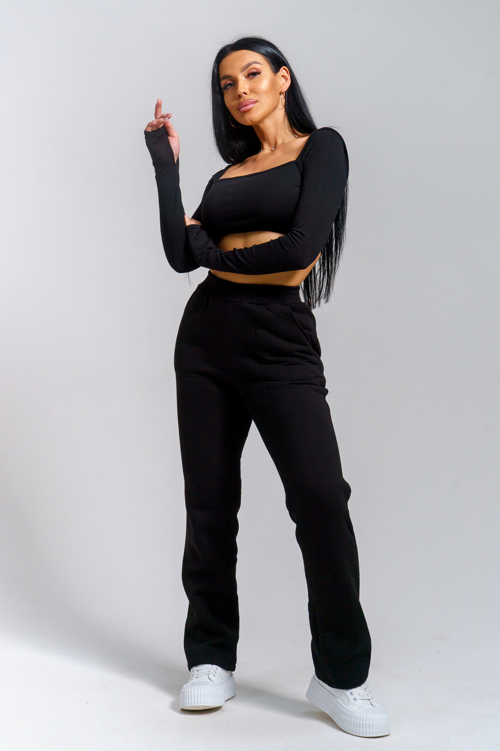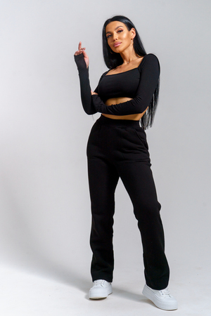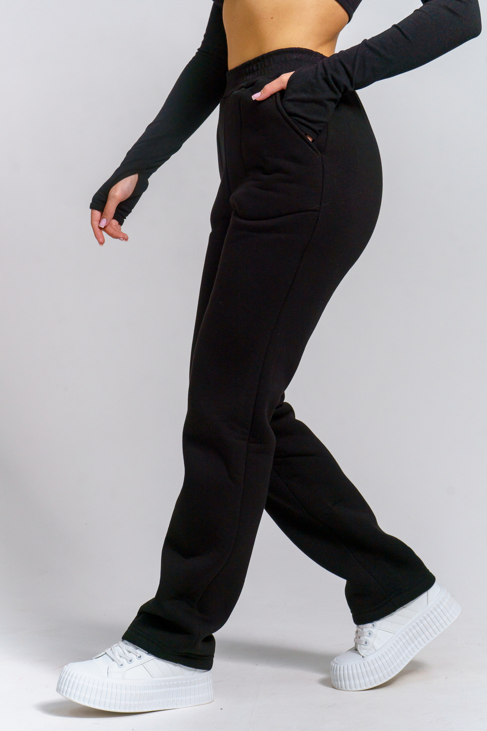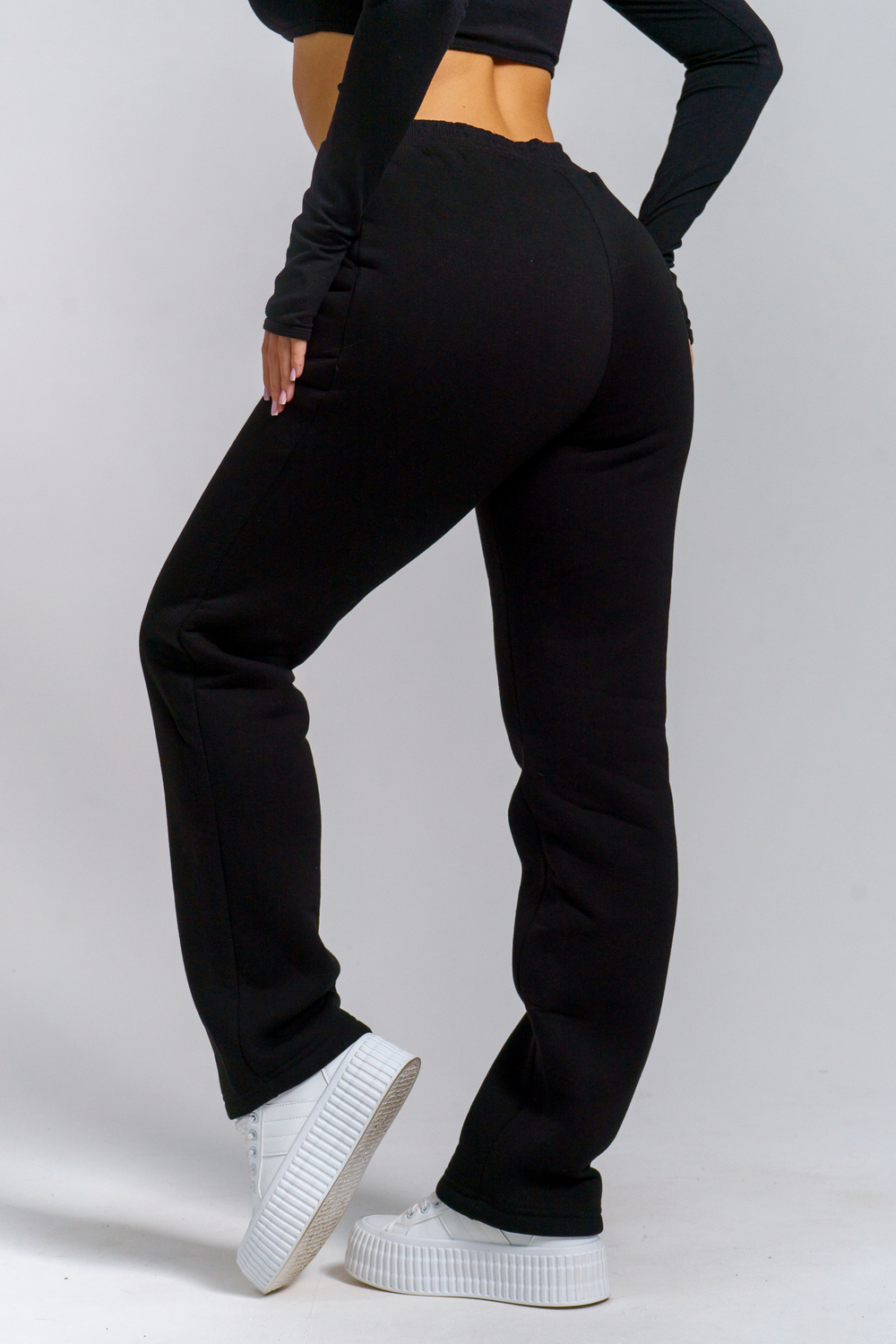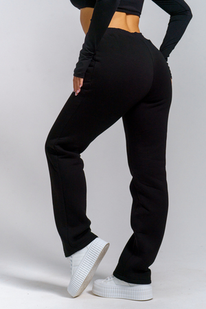 Брюки женские прямого силуэта с карманами из футерного полотна с начесом. Пояс из кашкорсе в цвет основной ткани отстрочен вместе с резинкой.