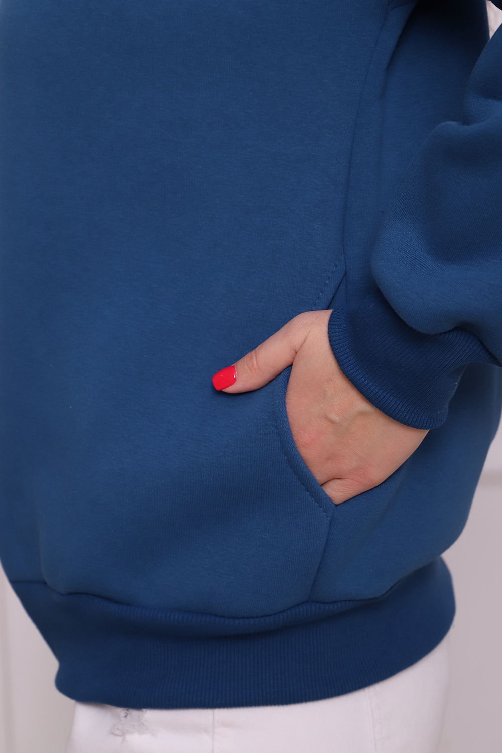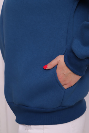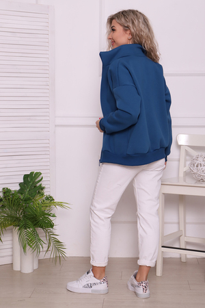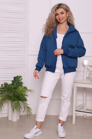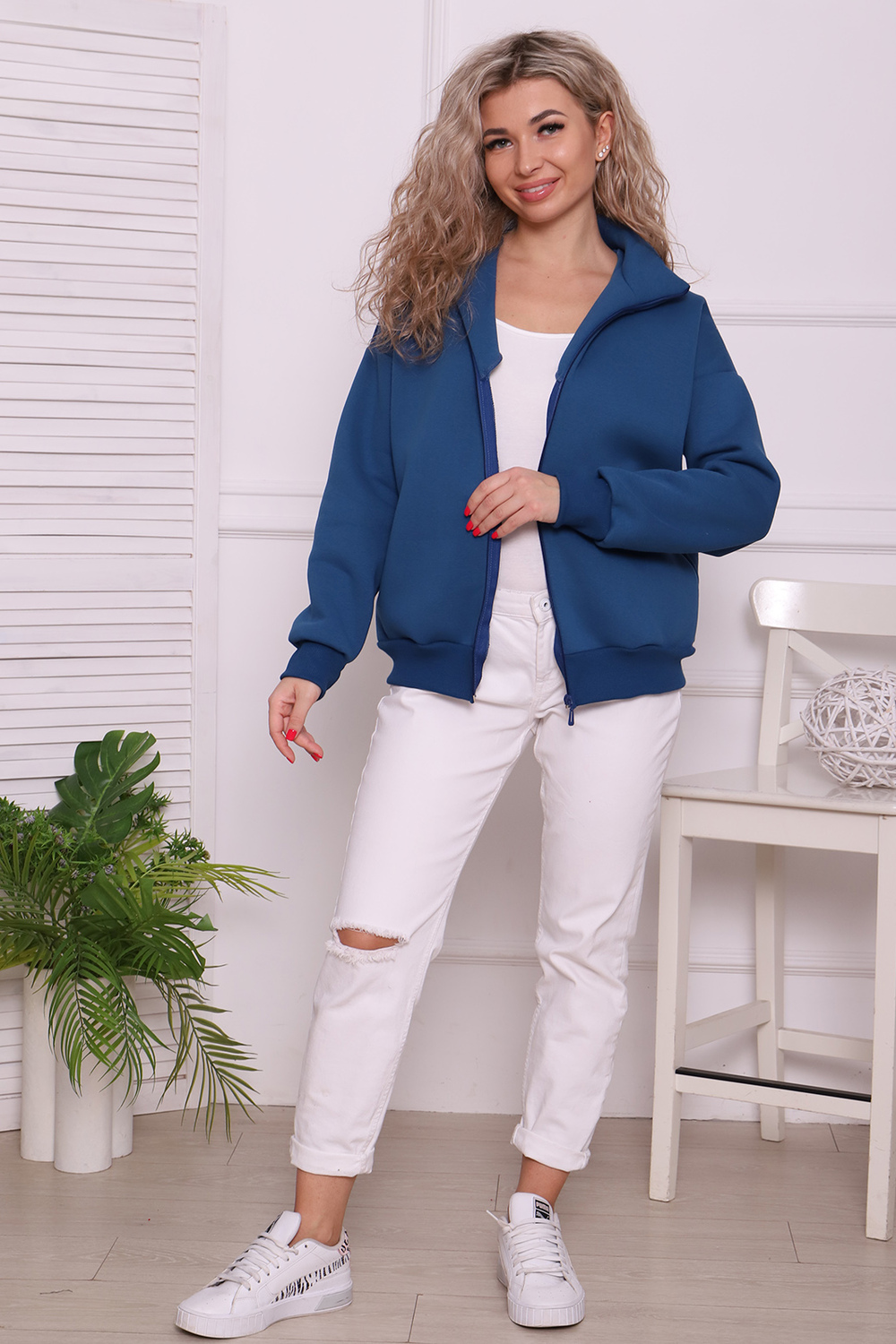 Толстовка женская с длинным рукавом на манжете, с воротником стойка, застежкой на тесьму-молнию. На детали переда карман. Манжеты и низ изделия выполнены из кашкорсе в цвет основной ткани.
