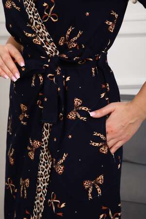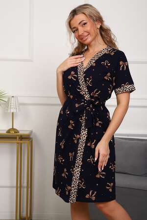 Комплект женский, из двух видов ткани, основной и компаньон,  халат с сорочкой. Халат прямого силуэта, на запах. Рукав короткий. В боровых швах карманы, низ прямой. Сорочка на бретелях. Расклешённая к низу. Спинка гладкая. Перед с подрезом под грудью. Лиф с защипами по линии груди, и двумя декоративными пуговицами. Низ изделия прямой