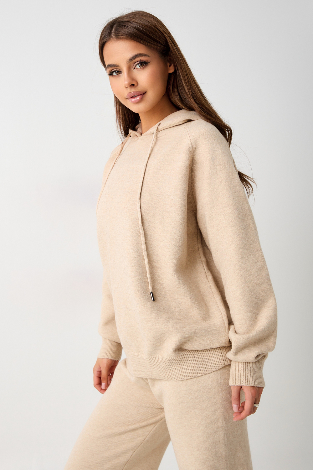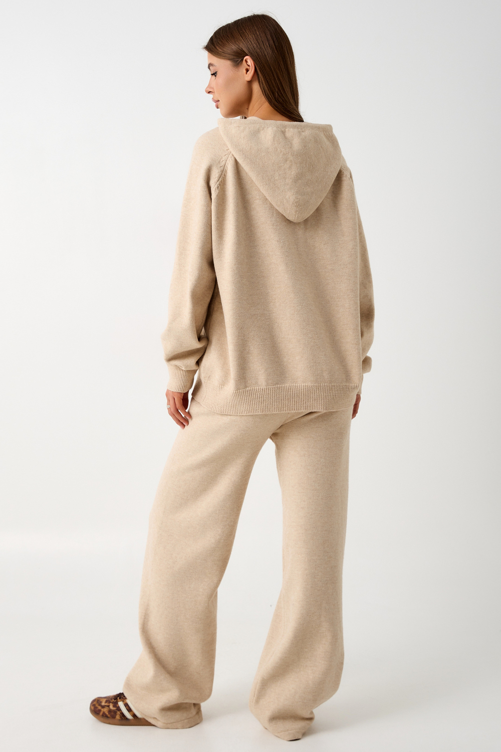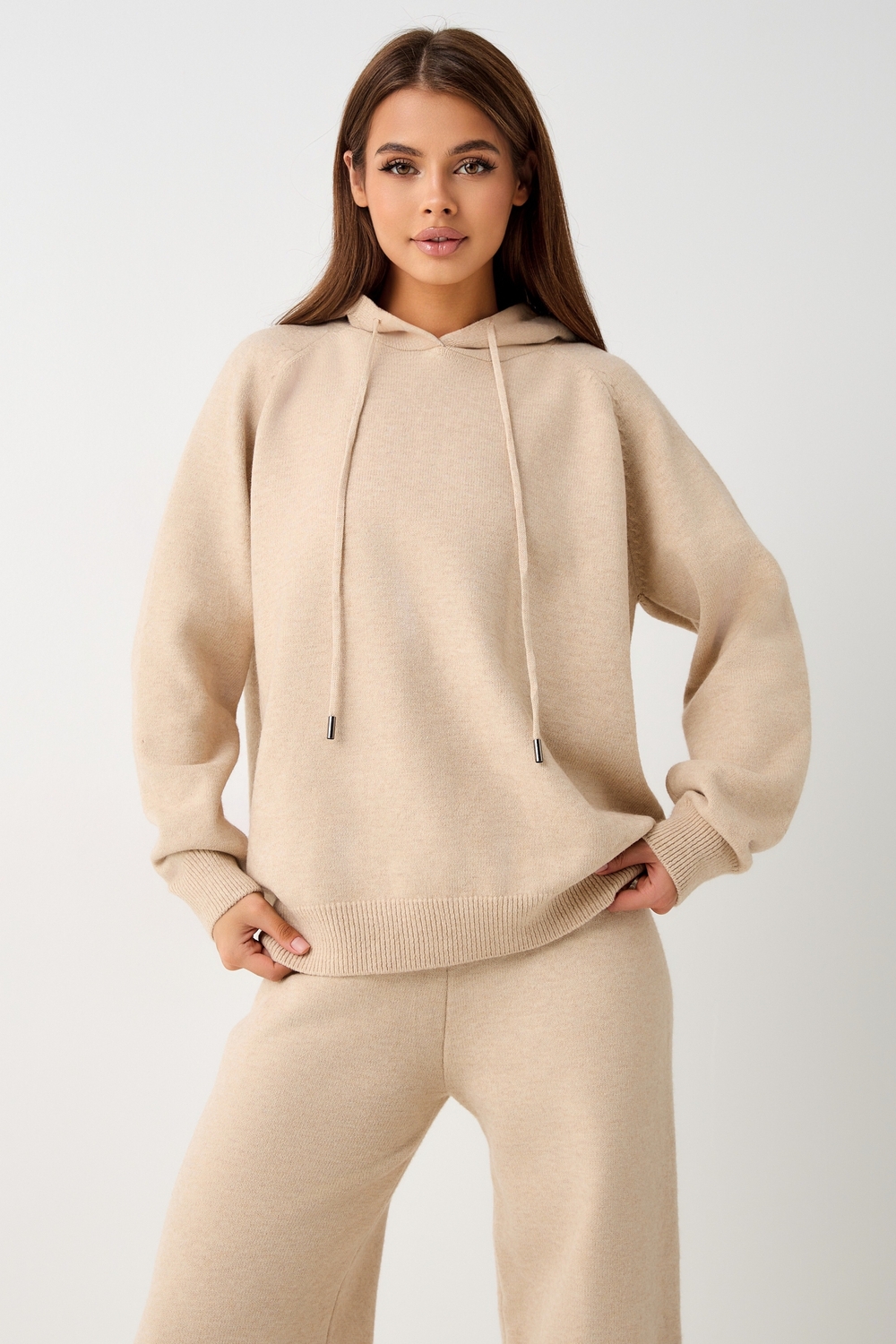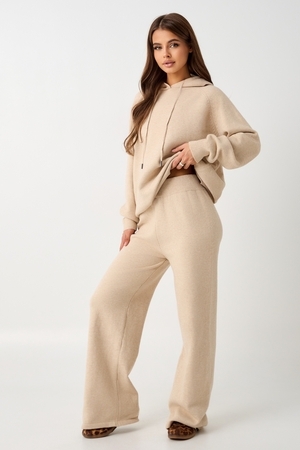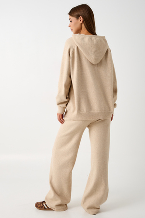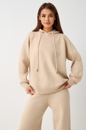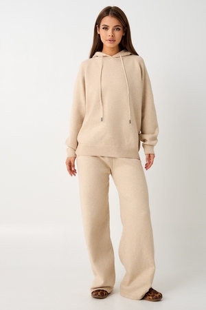 Вязаный костюм станет незаменимой основой женского гардероба для прохладной погоды, комфортным способом утепления. Он сшит из мягкой, приятной к телу пряжи с шерстяными волокнами, которая надолго сохраняет насыщенность цвета и свою форму, выдерживая интенсивное ношение и частые стирки. Стильный дизайнерский комплект отличается продуманным дизайном. Брюки - спортивки с широким поясом - резинкой, длинными штанинами, подчеркивают силуэт, не сковывая движений. Универсальность классической пастельной палитры и лаконичного дизайна позволяет легко включать комплект в коллекцию вещей для осенне - весеннего демисезонного и зимнего периода. Он идеально сочетается с однотонными вариантами обуви и нарядными праздничными аксессуарами для создания элегантного и собранного образа.
