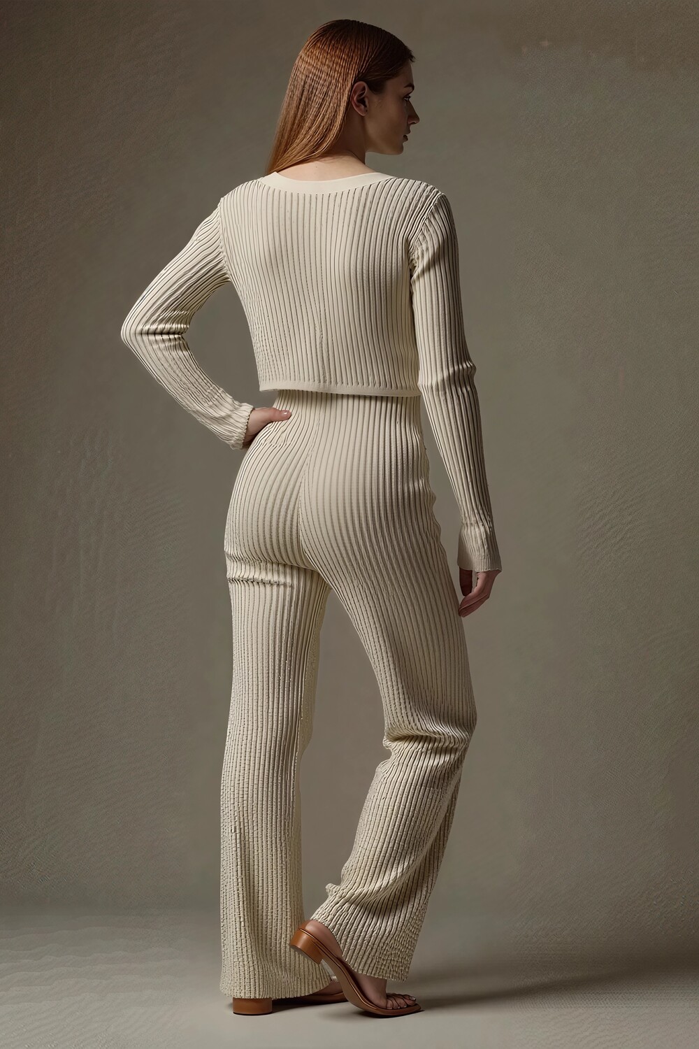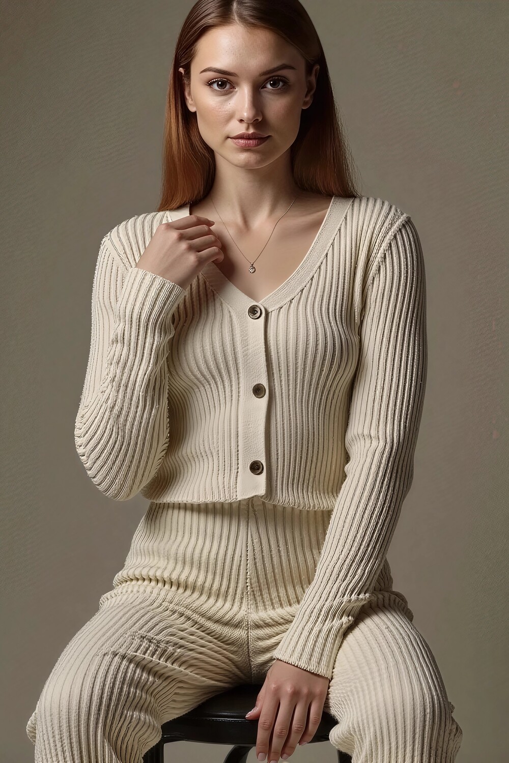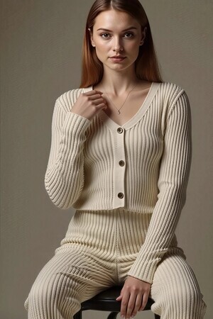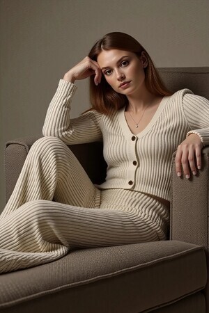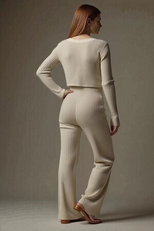 Вязаный костюм станет незаменимой основой женского гардероба для прохладной погоды, комфортным способом утепления. Он сшит из мягкой, приятной к телу пряжи с выразительной рифленой фактурой «в полоску». Вертикальные рельефные линии, проходящие сверху вниз по всему костюму, визуально вытягивают силуэт, делая его более стройным и изящным. Такая вязка придает ткани особую мягкость и объем. Стильный дизайнерский комплект отличается продуманным дизайном: кофточка с V-образным вырезом горловины на пуговицах обеспечивает комфорт, а брюки - спортивки с высоким поясом - резинкой, длинными штанинами подчеркивают силуэт, не сковывая движений. Универсальность классической пастельной палитры и лаконичного дизайна позволяет легко включать комплект в коллекцию вещей для осенне - весеннего демисезонного и зимнего периода. Он идеально сочетается с однотонными вариантами обуви и нарядными праздничными аксессуарами для создания элегантного и собранного образа.