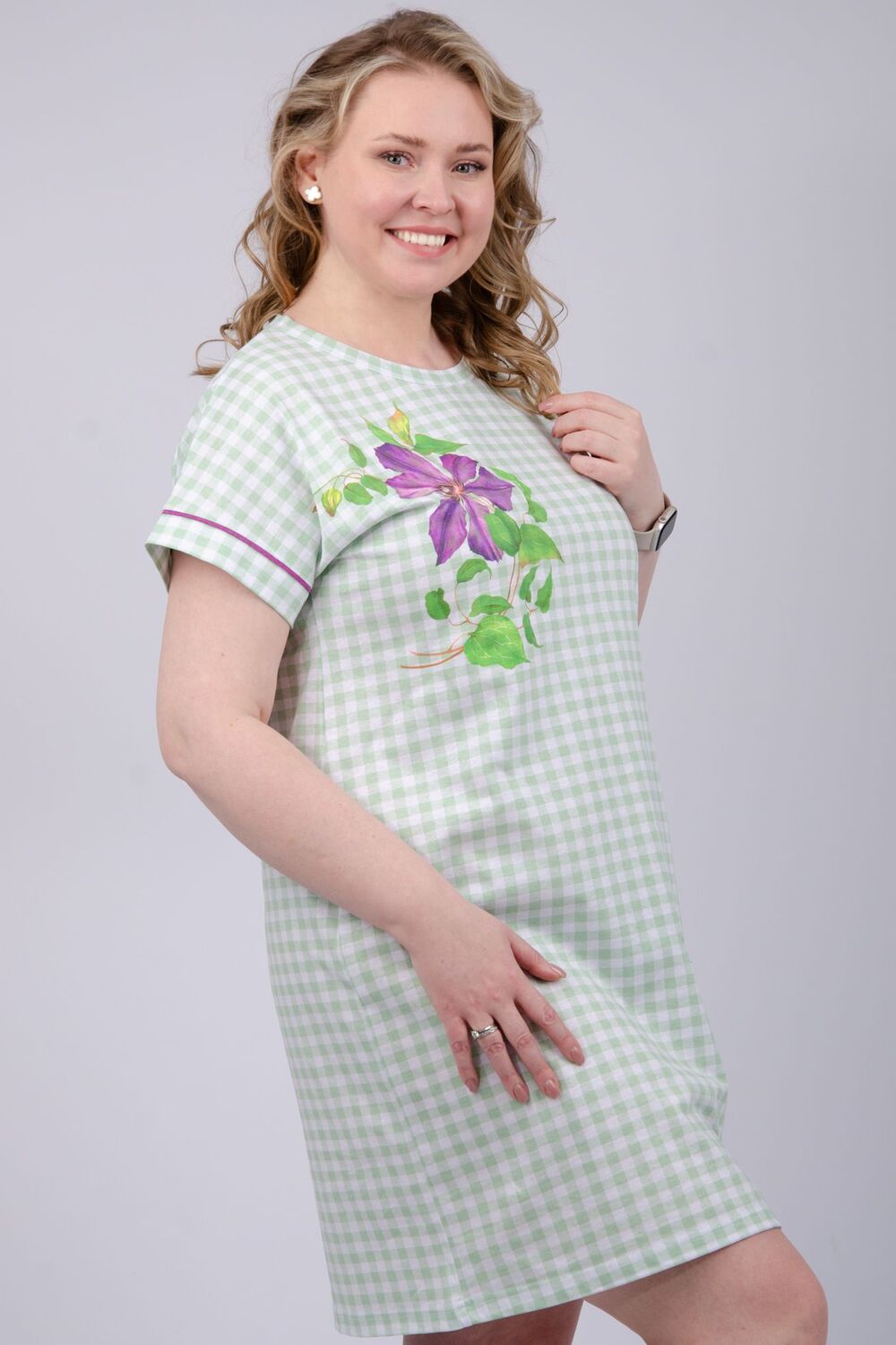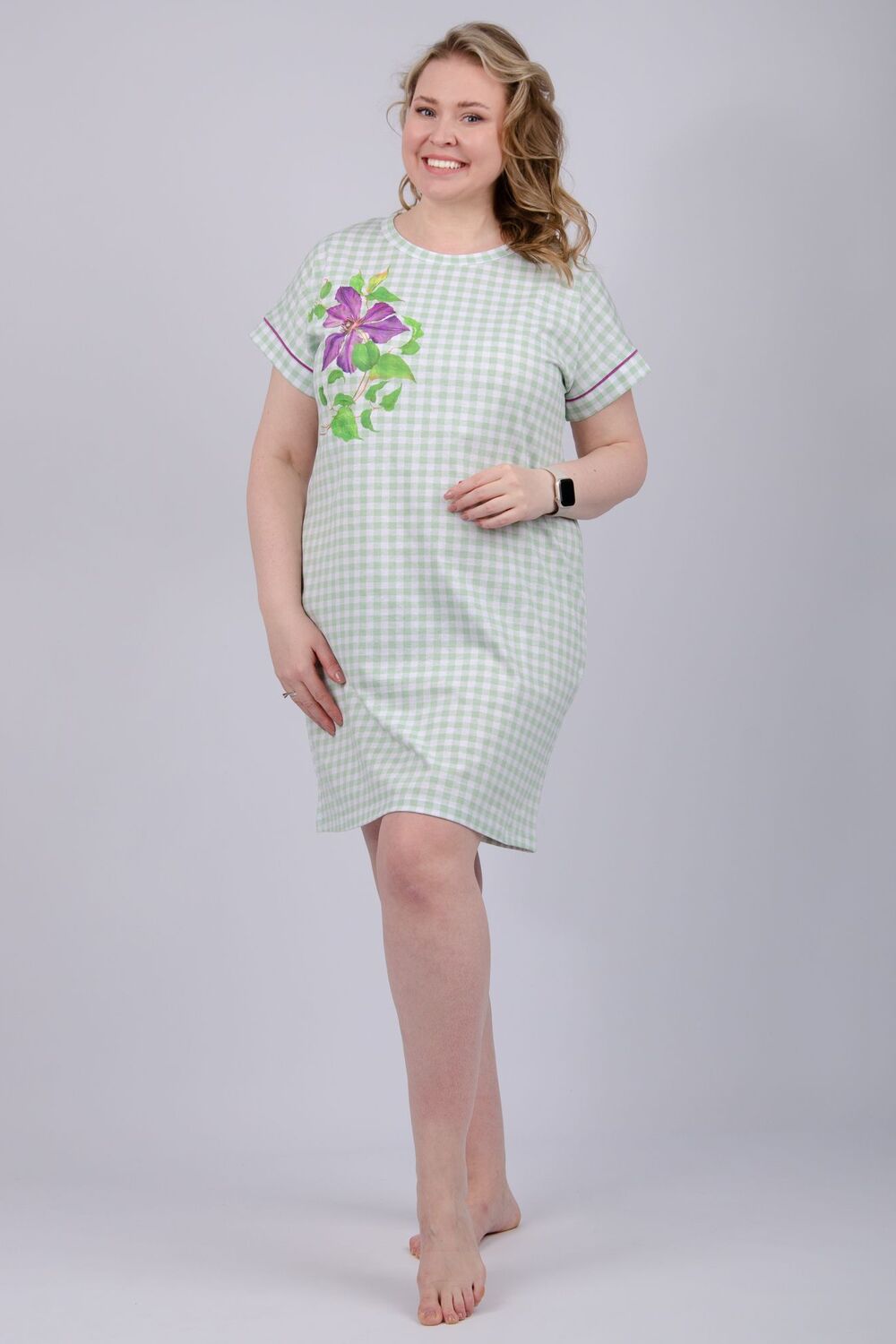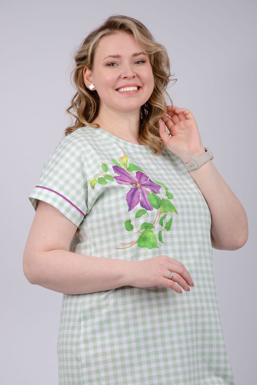 Ночная сорочка женская, хлопок 100% сшита из кулирного полотна. Трикотажная ночнушка средней длины максимально комфортна, благодаря свободному и простому крою. Спинка и перед цельные, прямые без вытачек и швов. Хлопковая базовая сорочка с коротким рукавом украшена принтом с изображением фиалки, гипоаллергенна, позволяет коже дышать во время сна, всесезонная подойдет для любого времени года.