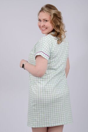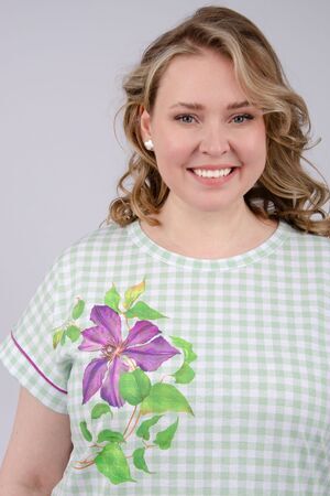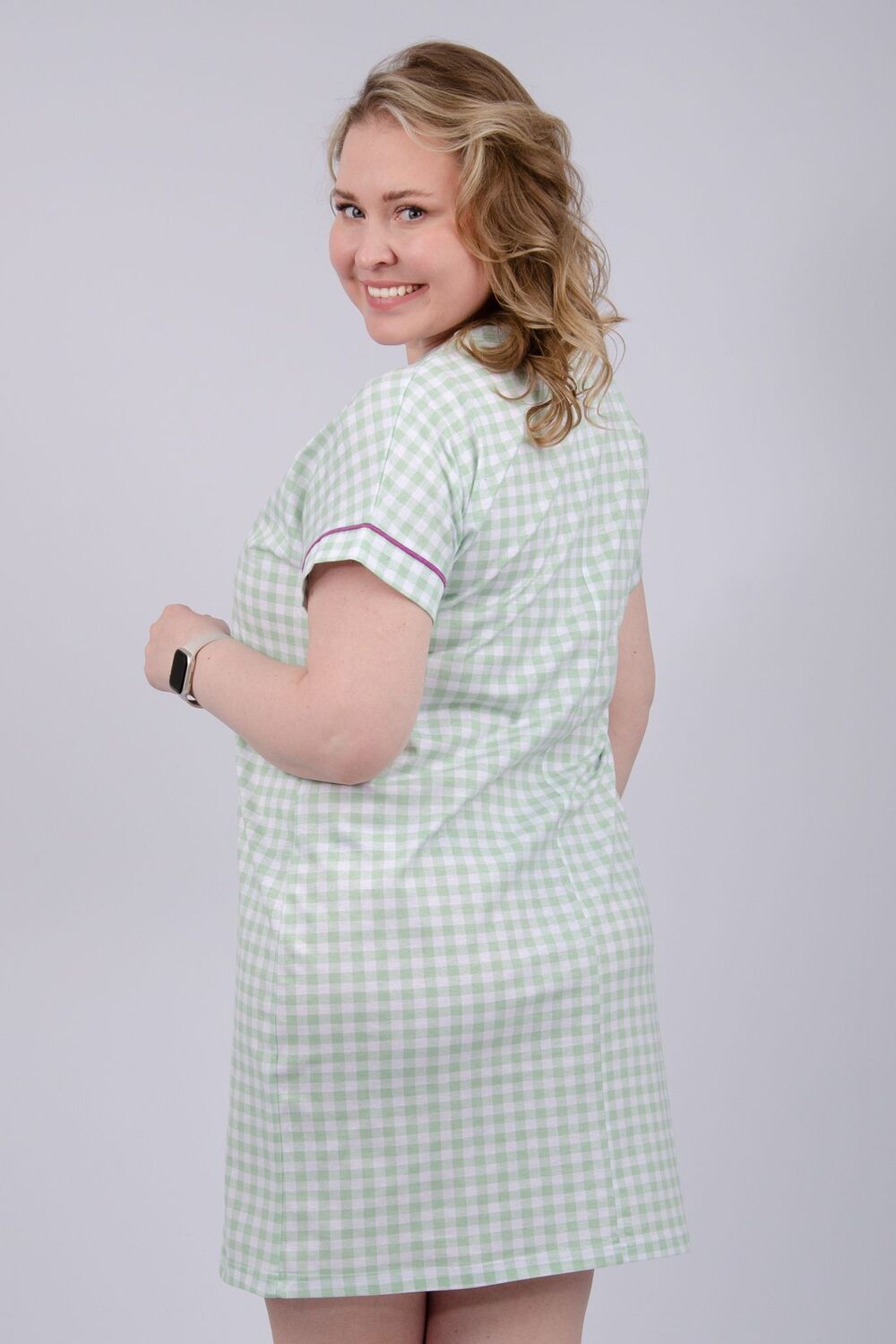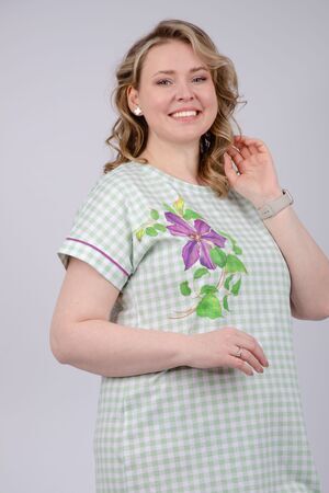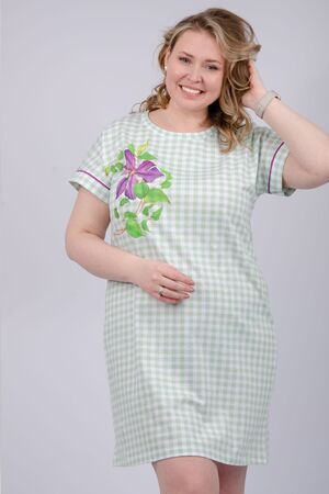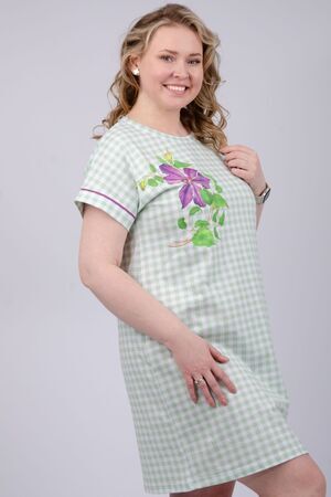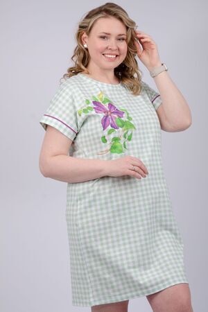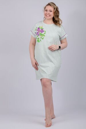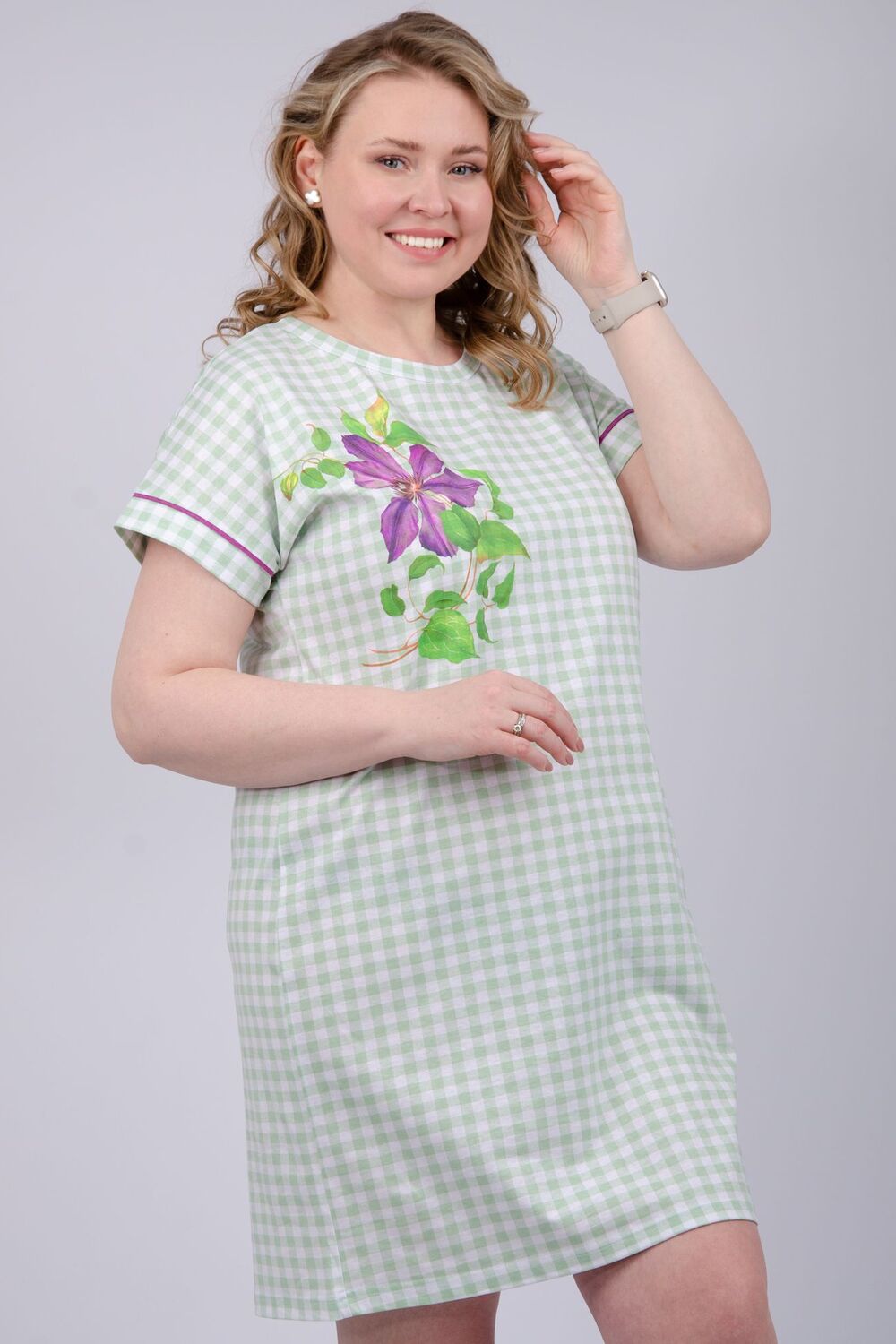 Ночная сорочка женская, хлопок 100% сшита из кулирного полотна. Трикотажная ночнушка средней длины максимально комфортна, благодаря свободному и простому крою. Спинка и перед цельные, прямые без вытачек и швов. Хлопковая базовая сорочка с коротким рукавом украшена принтом с изображением фиалки, гипоаллергенна, позволяет коже дышать во время сна, всесезонная подойдет для любого времени года.