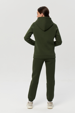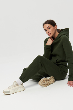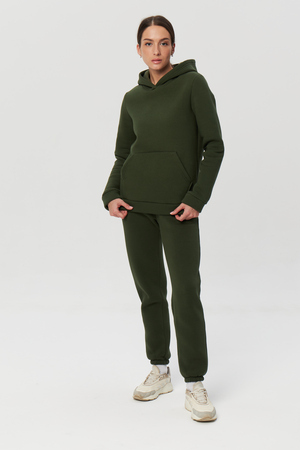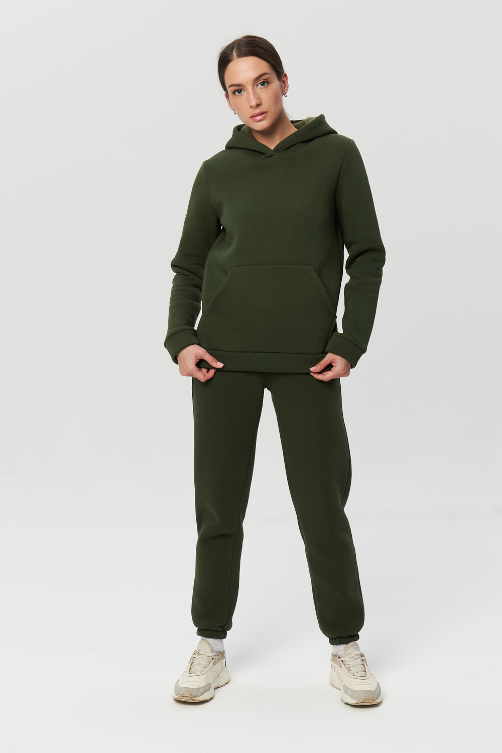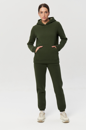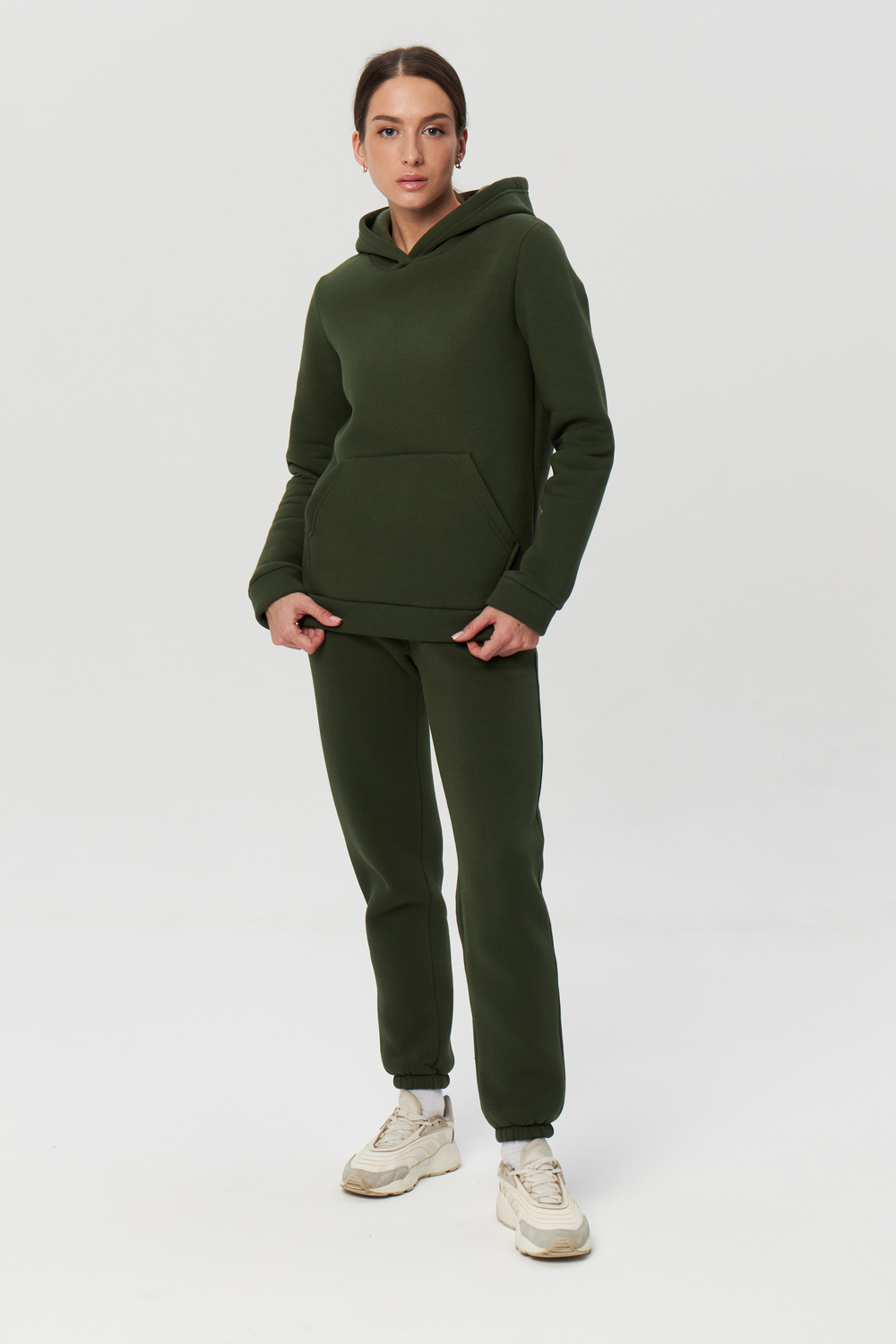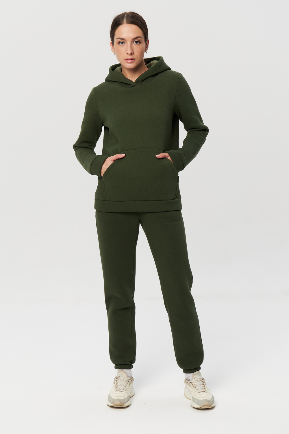 Костюм с начёсом -прекрасный вариант повседневной одежды для осени и зимы. Толстовка прямого кроя, имеет классическую пройму с втачным рукавом с притачными манжетами и поясом из ткани верха. На полочке расположен карман –кенгуру. Капюшон однослойный, он прекрасно защитит голову в прохладную погоду. Брюки на резинке, с боковыми наклонными карманами, по низу штанины вшита внутрь резинка.