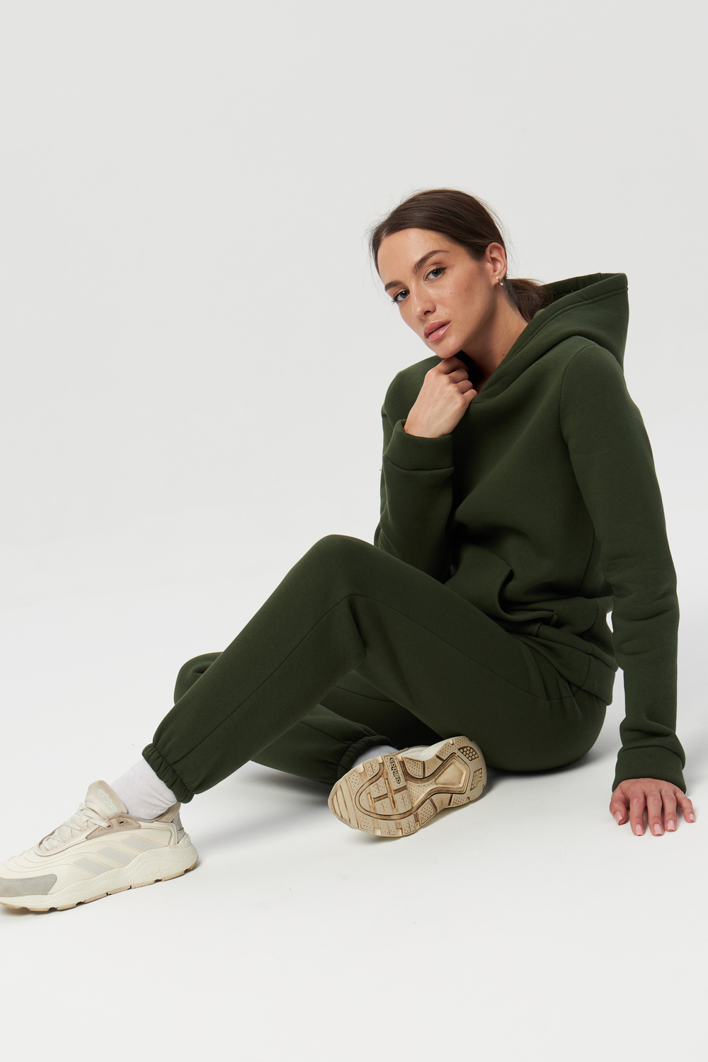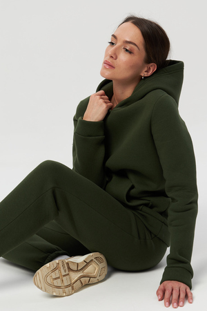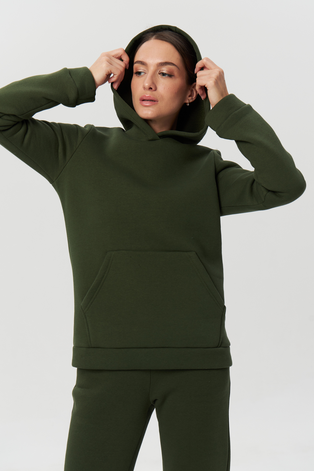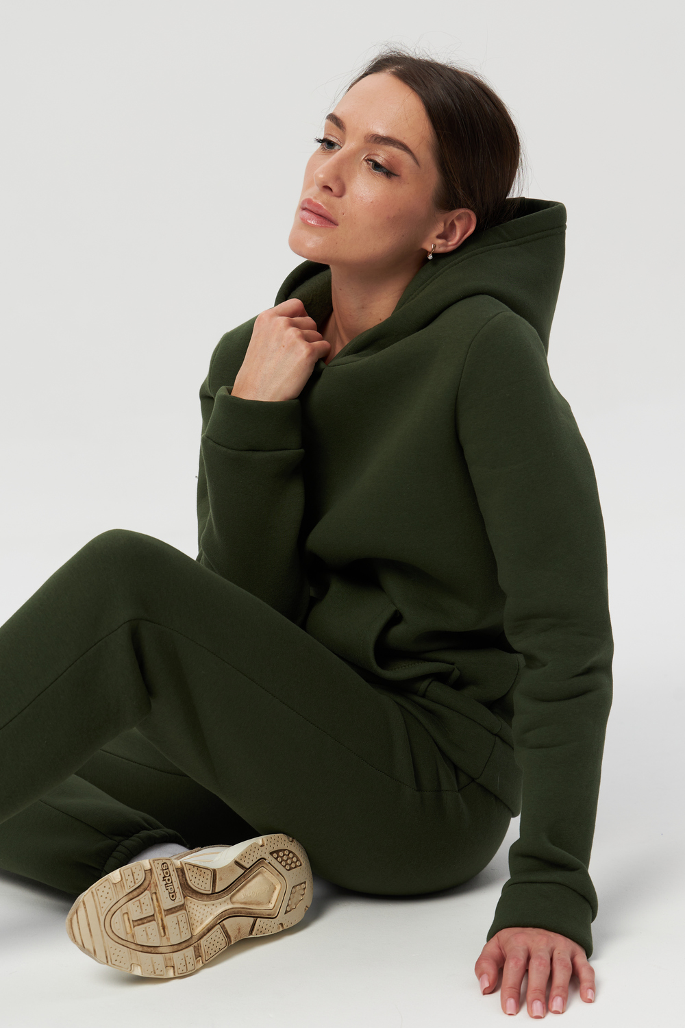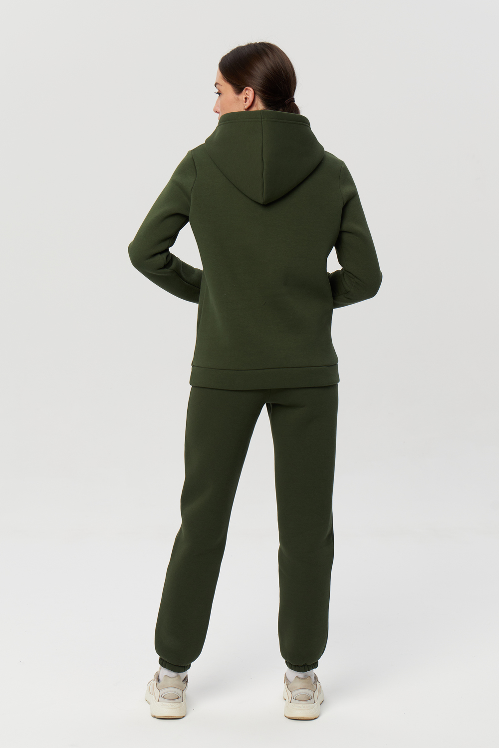 Костюм с начёсом -прекрасный вариант повседневной одежды для осени и зимы. Толстовка прямого кроя, имеет классическую пройму с втачным рукавом с притачными манжетами и поясом из ткани верха. На полочке расположен карман –кенгуру. Капюшон однослойный, он прекрасно защитит голову в прохладную погоду. Брюки на резинке, с боковыми наклонными карманами, по низу штанины вшита внутрь резинка.