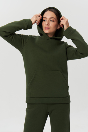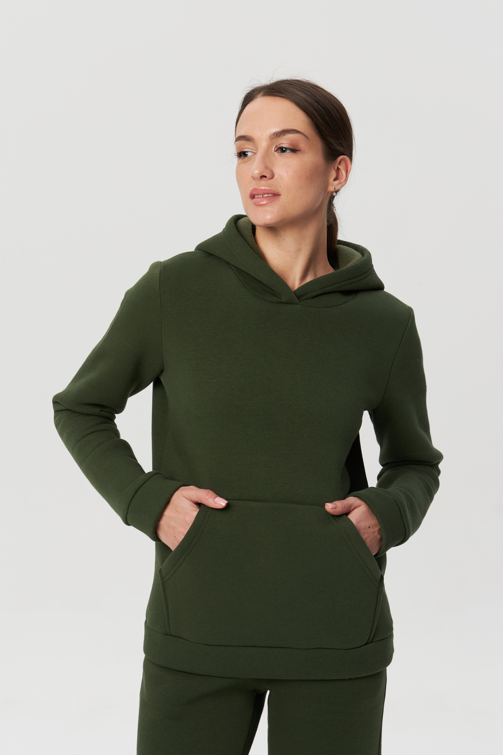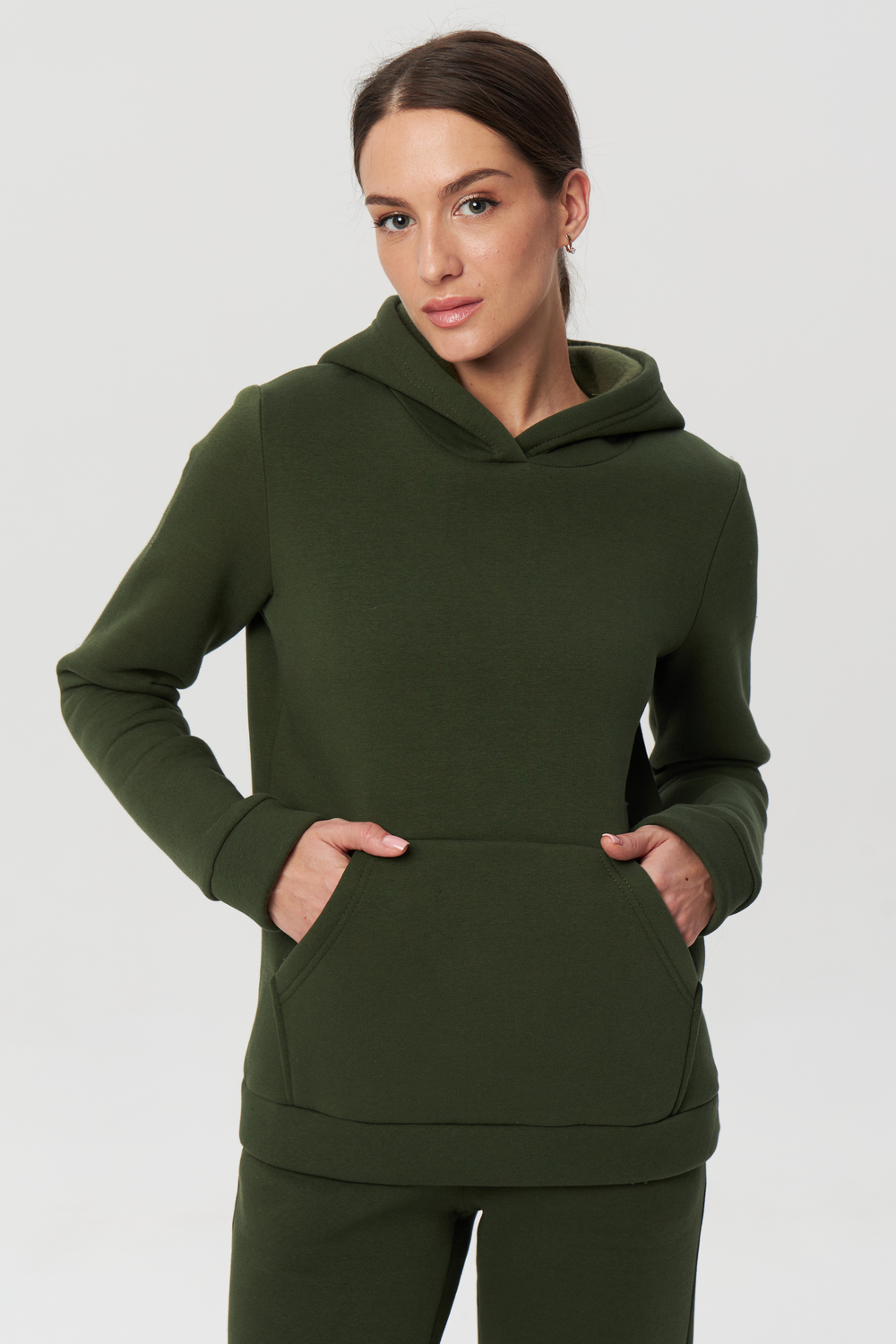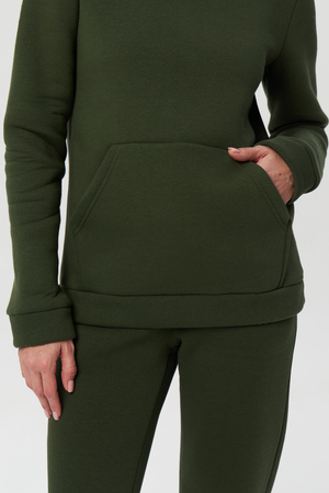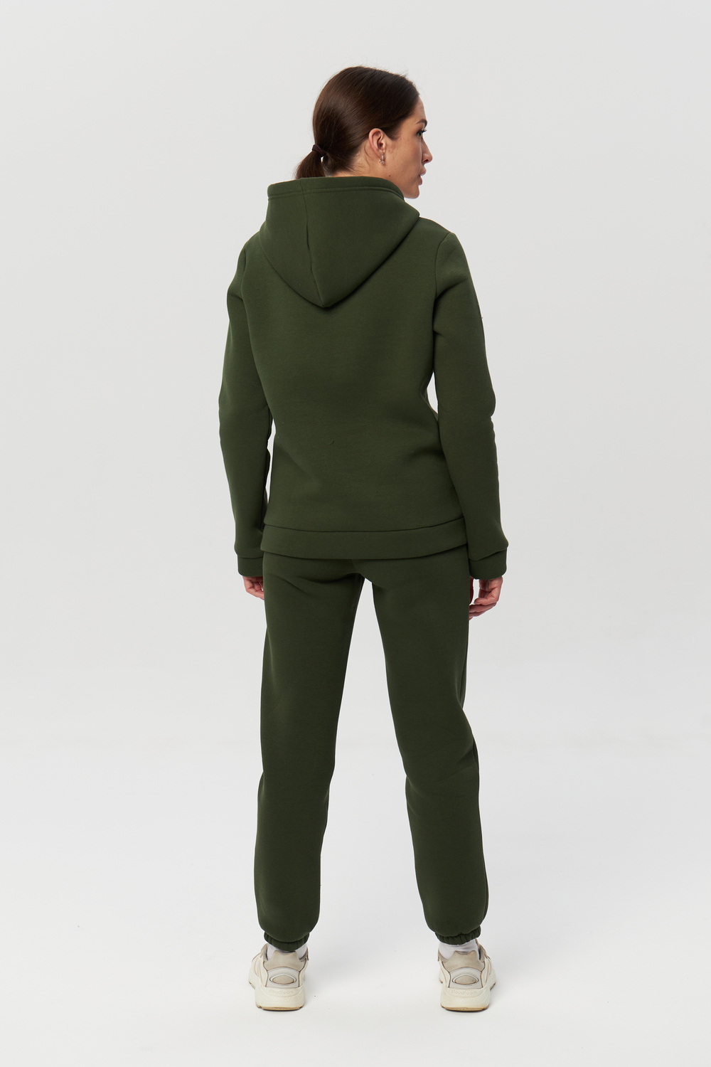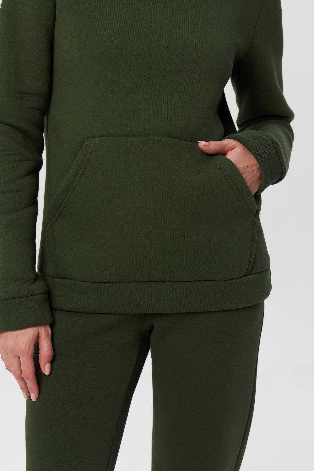 Костюм с начёсом -прекрасный вариант повседневной одежды для осени и зимы. Толстовка прямого кроя, имеет классическую пройму с втачным рукавом с притачными манжетами и поясом из ткани верха. На полочке расположен карман –кенгуру. Капюшон однослойный, он прекрасно защитит голову в прохладную погоду. Брюки на резинке, с боковыми наклонными карманами, по низу штанины вшита внутрь резинка.