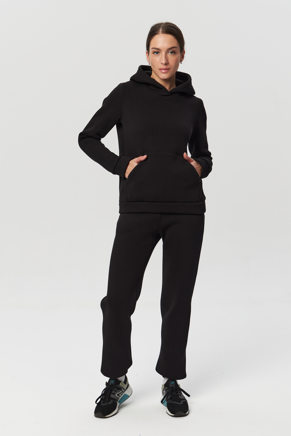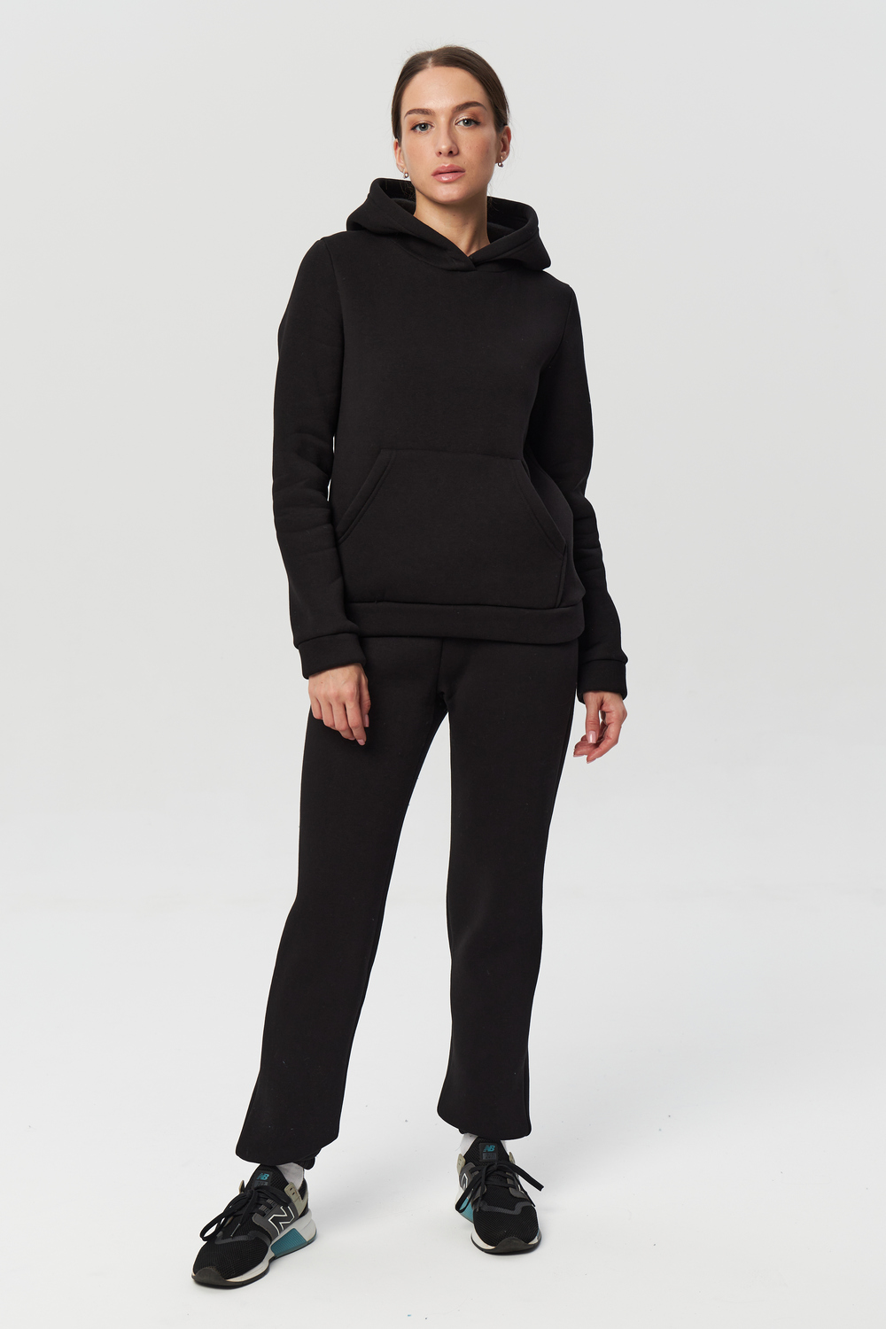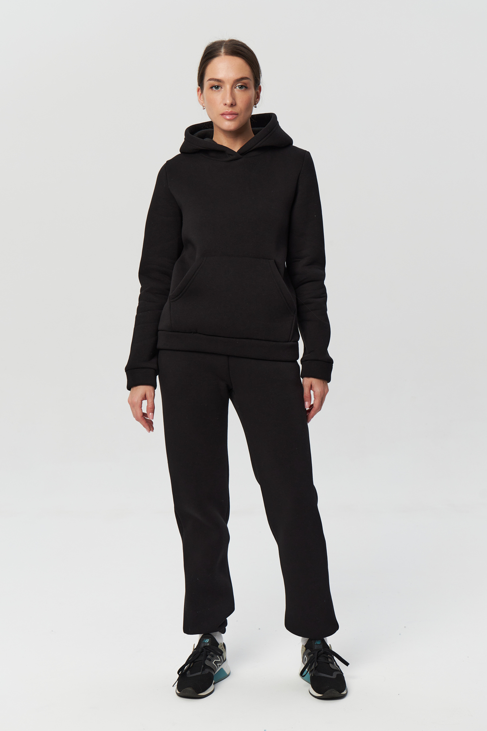 Костюм с начёсом -прекрасный вариант повседневной одежды для осени и зимы. Толстовка прямого кроя, имеет классическую пройму с втачным рукавом  с притачными манжетами и поясом из ткани верха. На  полочке расположен карман –кенгуру. Капюшон однослойный, он прекрасно защитит голову в прохладную погоду. Брюки на резинке, с боковыми наклонными карманами, по низу штанины вшита внутрь резинка.