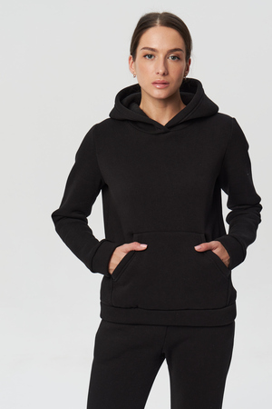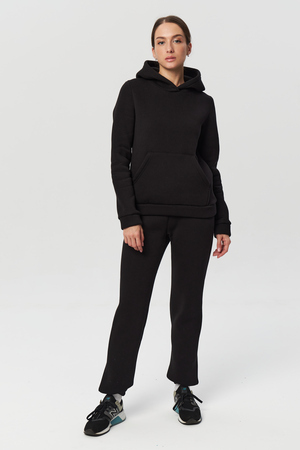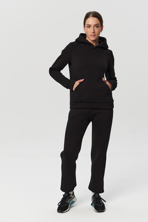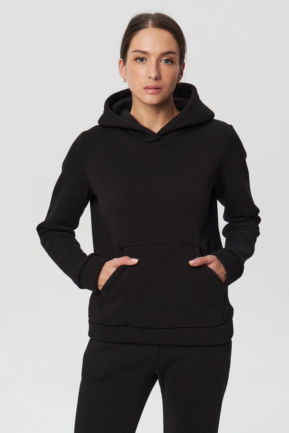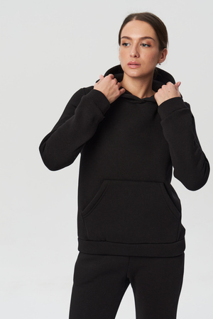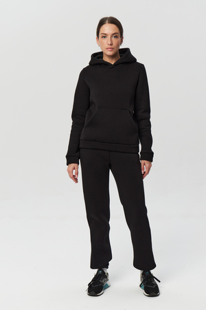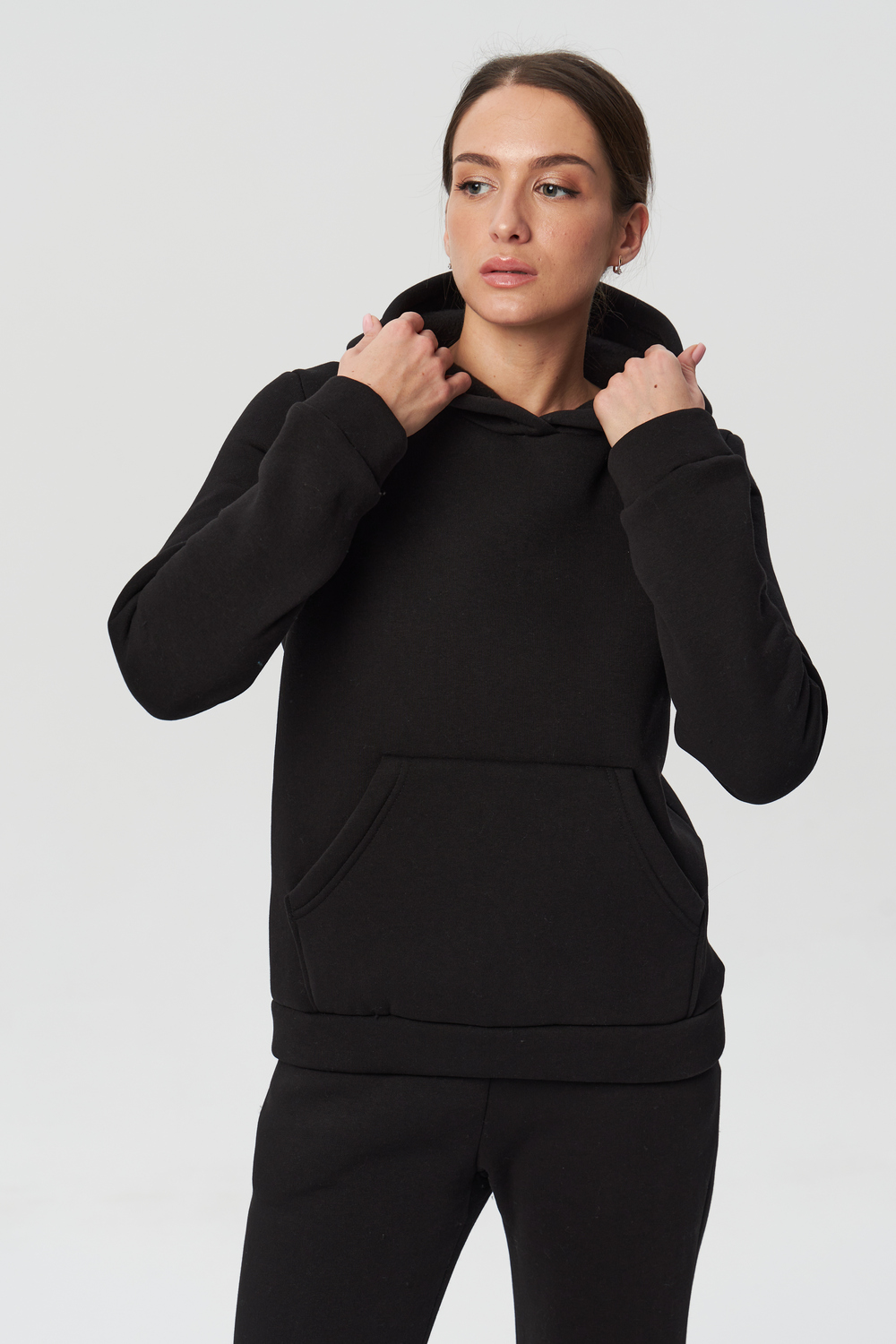 Костюм с начёсом -прекрасный вариант повседневной одежды для осени и зимы. Толстовка прямого кроя, имеет классическую пройму с втачным рукавом  с притачными манжетами и поясом из ткани верха. На  полочке расположен карман –кенгуру. Капюшон однослойный, он прекрасно защитит голову в прохладную погоду. Брюки на резинке, с боковыми наклонными карманами, по низу штанины вшита внутрь резинка.