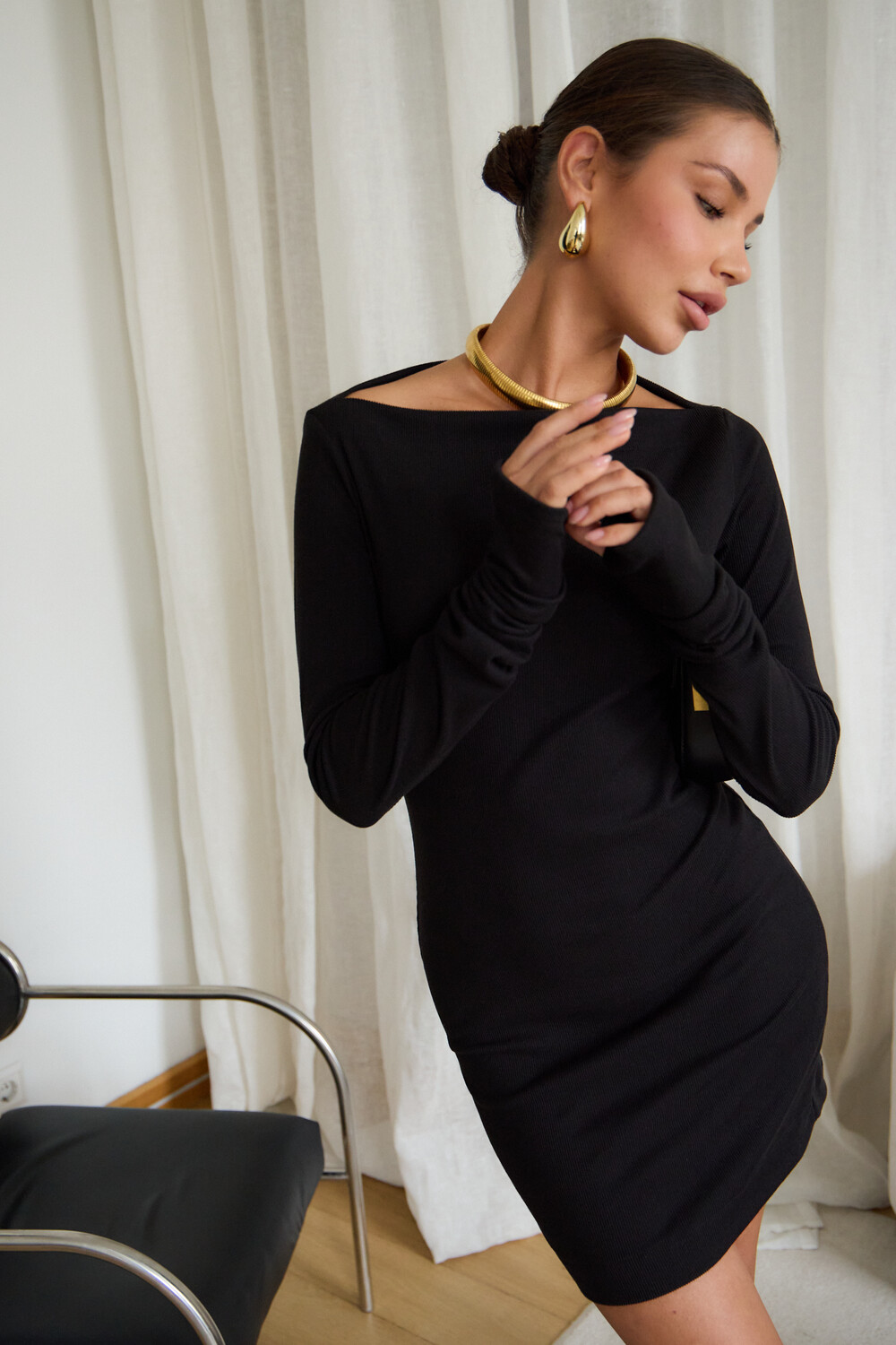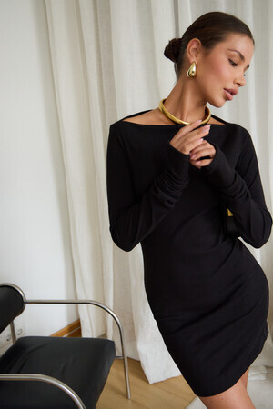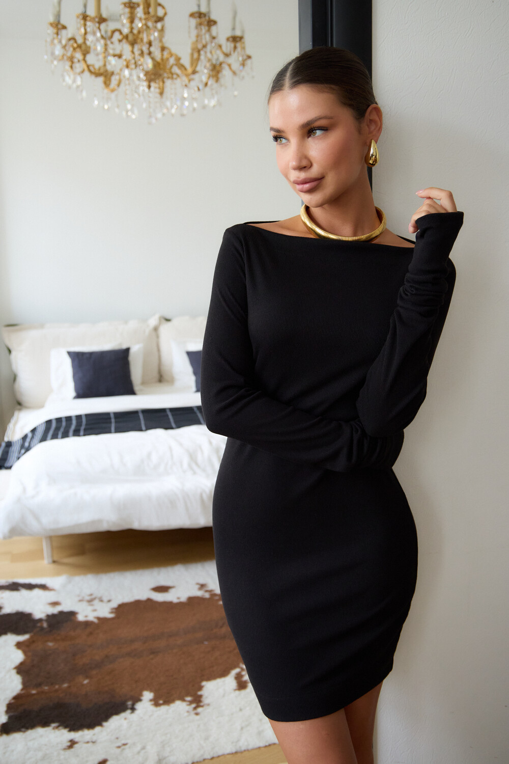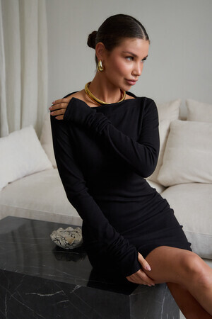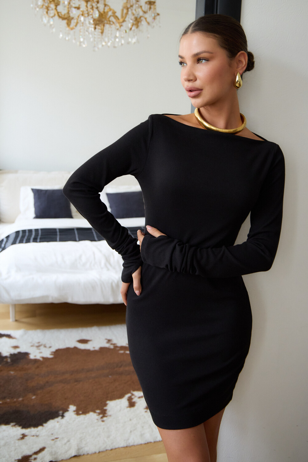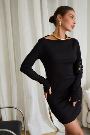 В поисках идеального вечернего наряда или платья для новогодней ночи, обратите внимание на эту модель. Прилегающий крой, кокетливая длина мини и удлиненные рукава с чувственными прорезями для пальцев создают неповторимый образ, исполненный женственности. Главная изюминка – возможность трансформации. Одно движение, и платье превращается в соблазнительный наряд на одно плечо или с открытыми плечами.