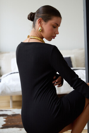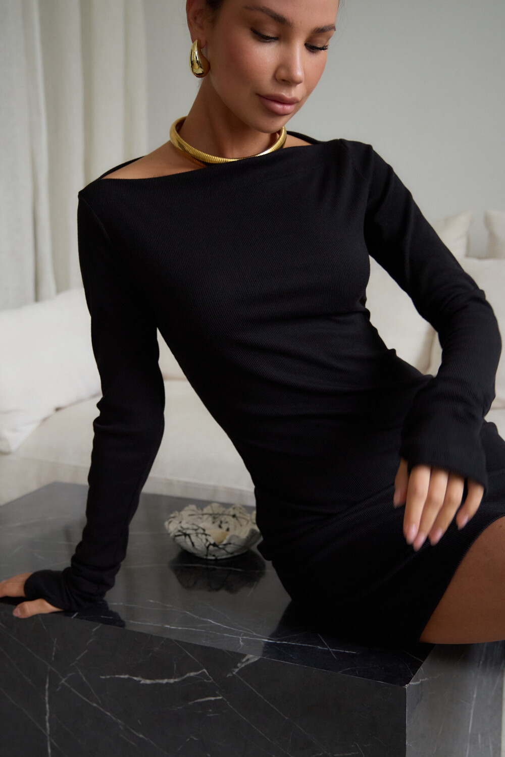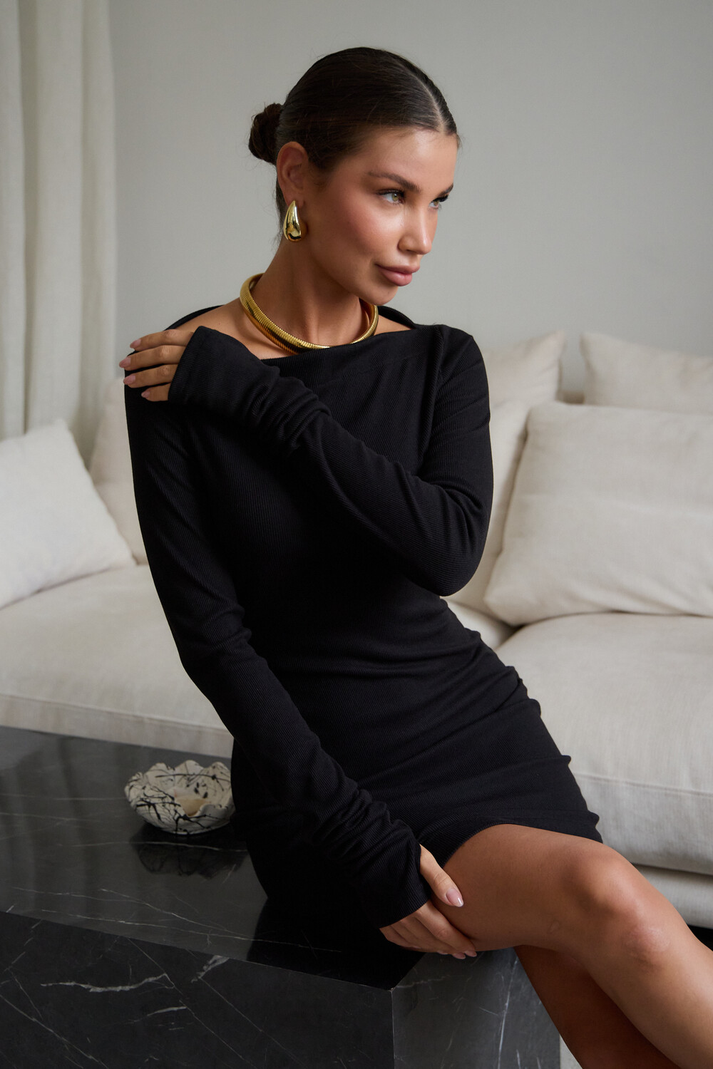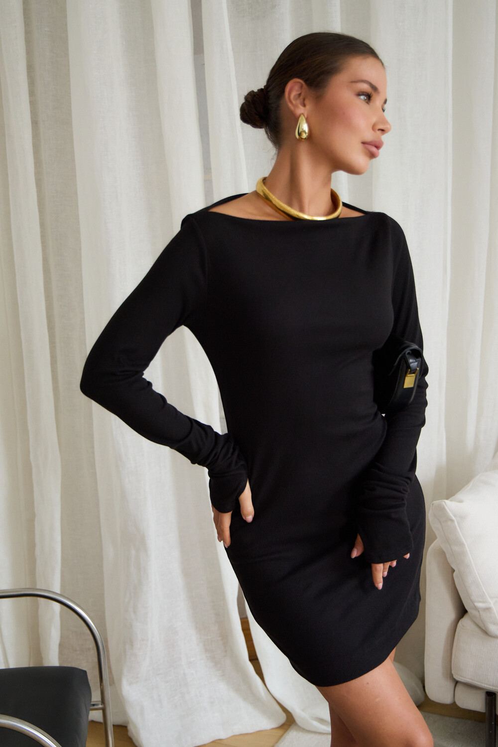 В поисках идеального вечернего наряда или платья для новогодней ночи, обратите внимание на эту модель. Прилегающий крой, кокетливая длина мини и удлиненные рукава с чувственными прорезями для пальцев создают неповторимый образ, исполненный женственности. Главная изюминка – возможность трансформации. Одно движение, и платье превращается в соблазнительный наряд на одно плечо или с открытыми плечами.