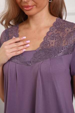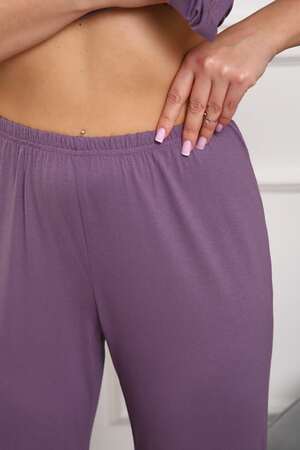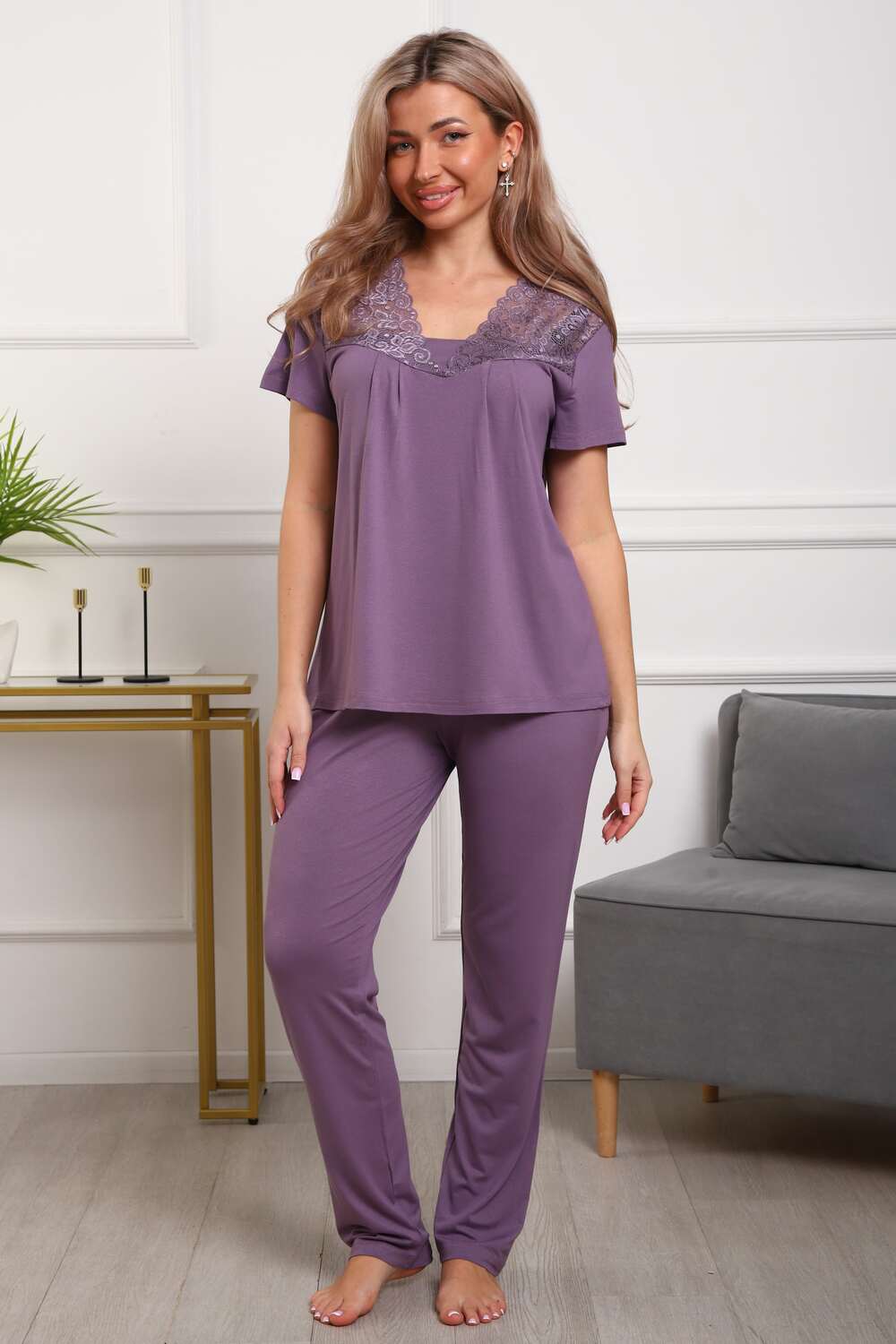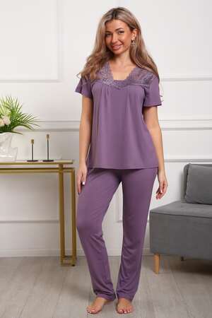 Пижама женская из вискозы. Состоит из туники и брюк. Верх прямого силуэта, чуть расклешённый к низу, ниже середины бедра. Рукав короткий. Горловина V-образной формы, отделана кружевом. Низ прямой.