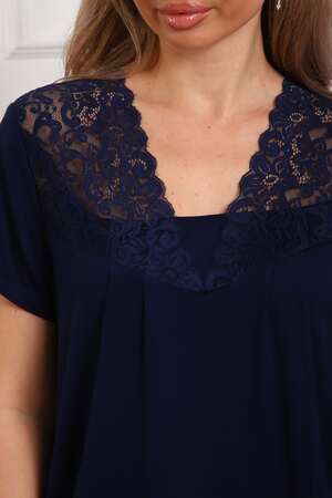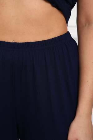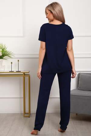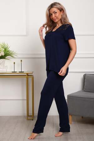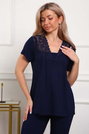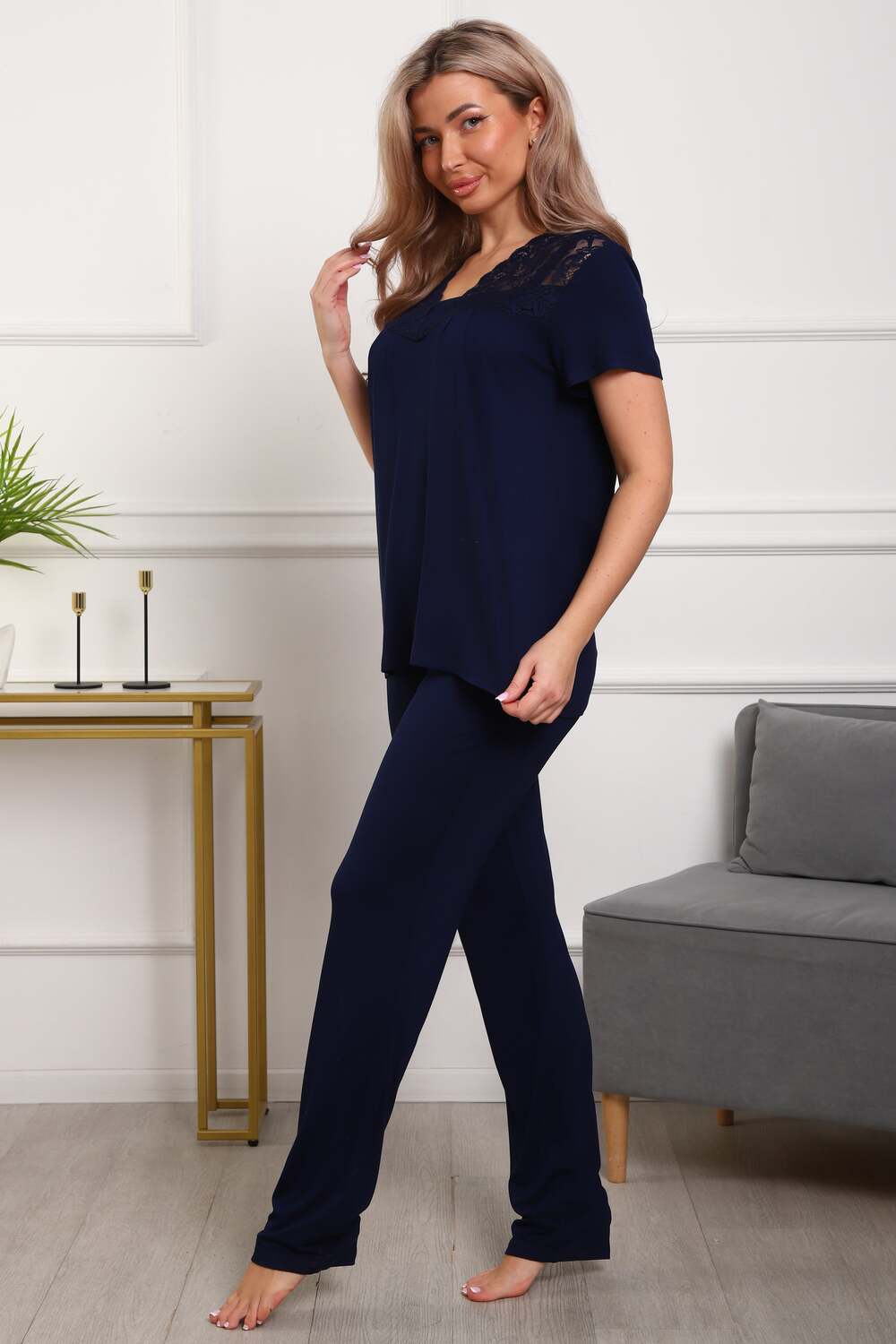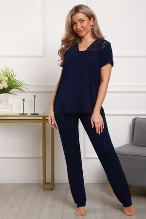 Пижама женская из вискозы. Состоит из туники и брюк. Верх прямого силуэта, чуть расклешённый к низу, ниже середины бедра. Рукав короткий. Горловина V-образной формы, отделана кружевом. Низ прямой.