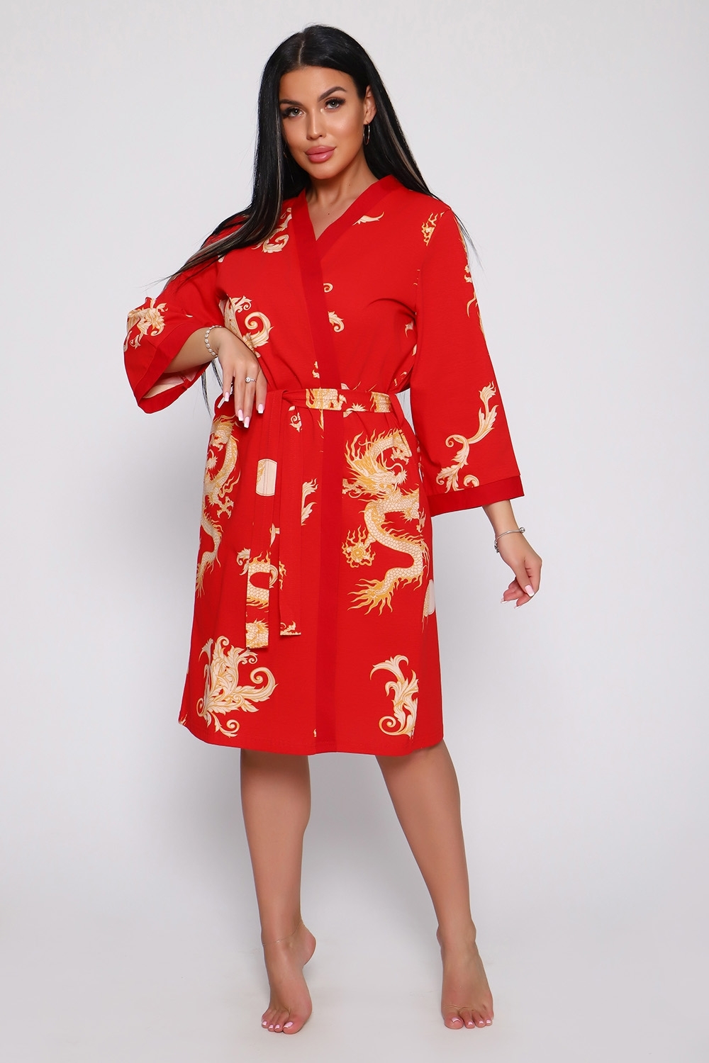 Халат свободного кроя с поясом, рукава 3/4, длина до колена — идеально для комфортных и стильных будней.