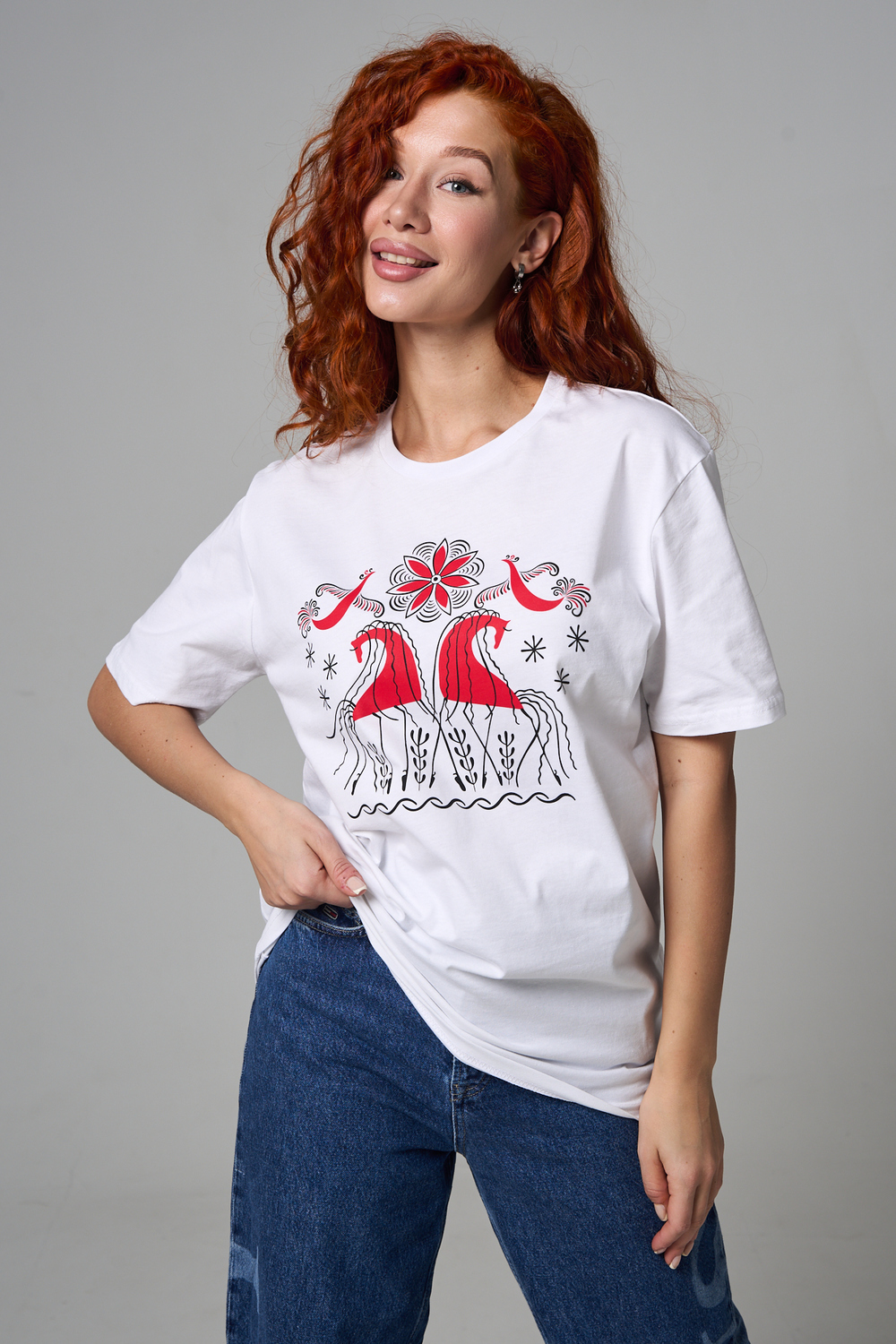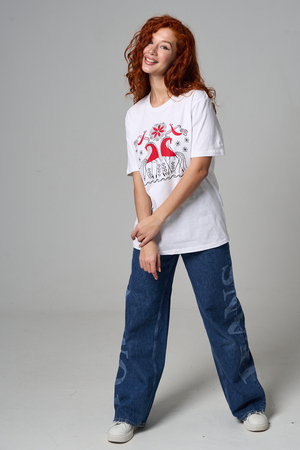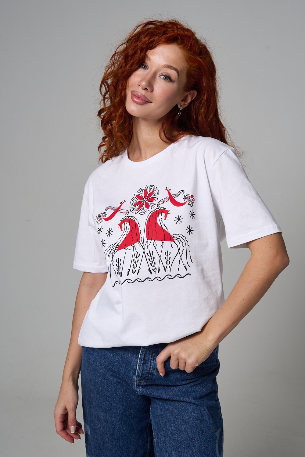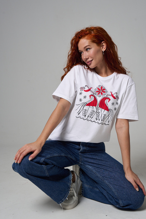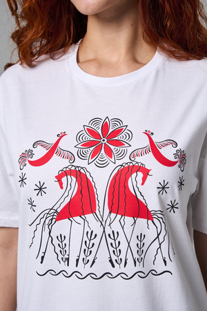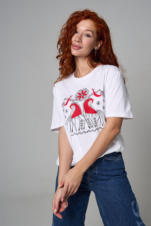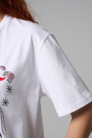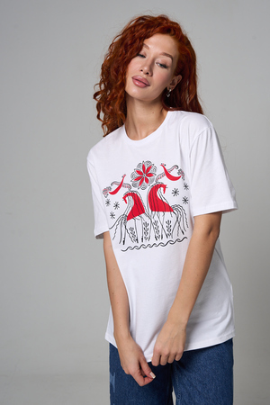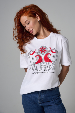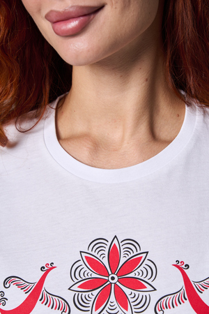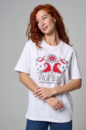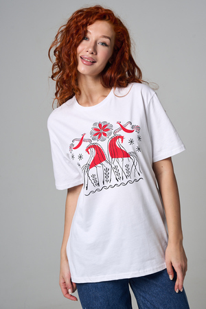 Хлопковая футболка с русским народным узором. Изготовлена из 100% высококачественного хлопка. Дышащая футболка гарантирует комфорт в течение всего дня, а прочный материал долго сохраняет форму и яркость принта.