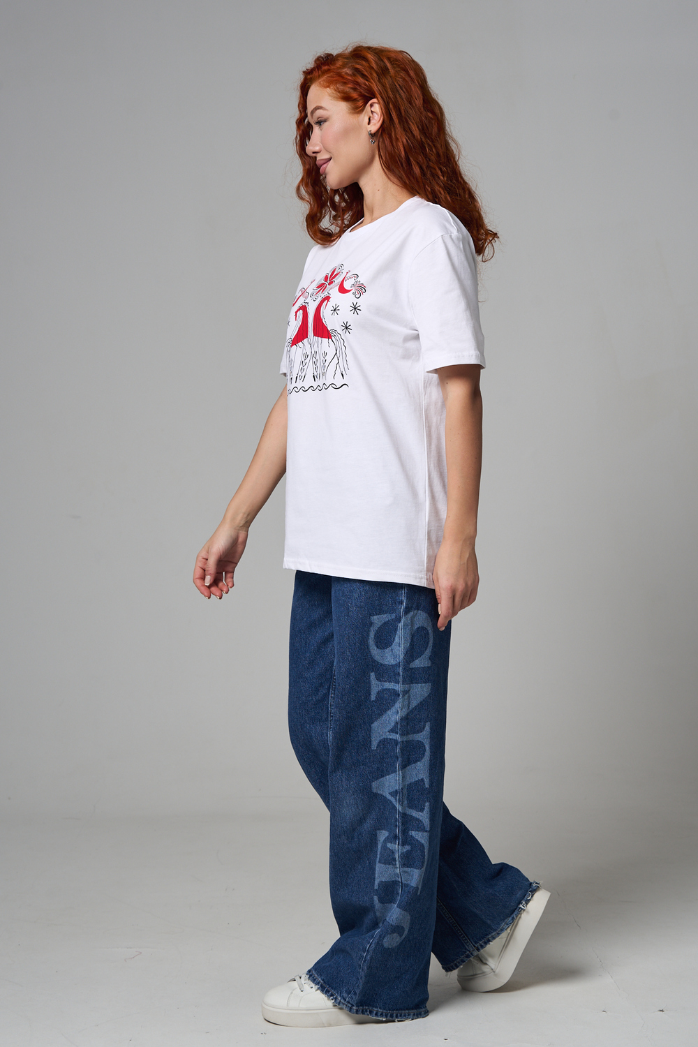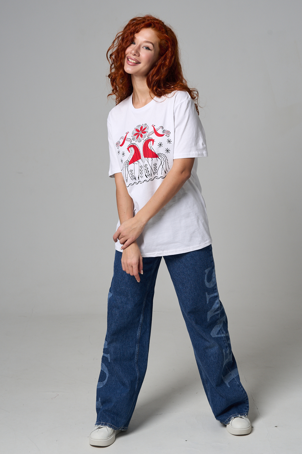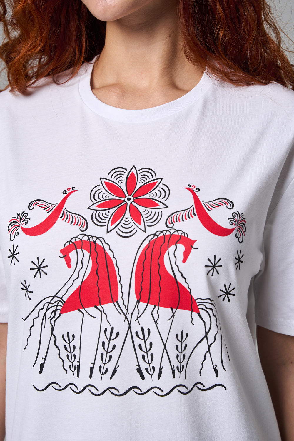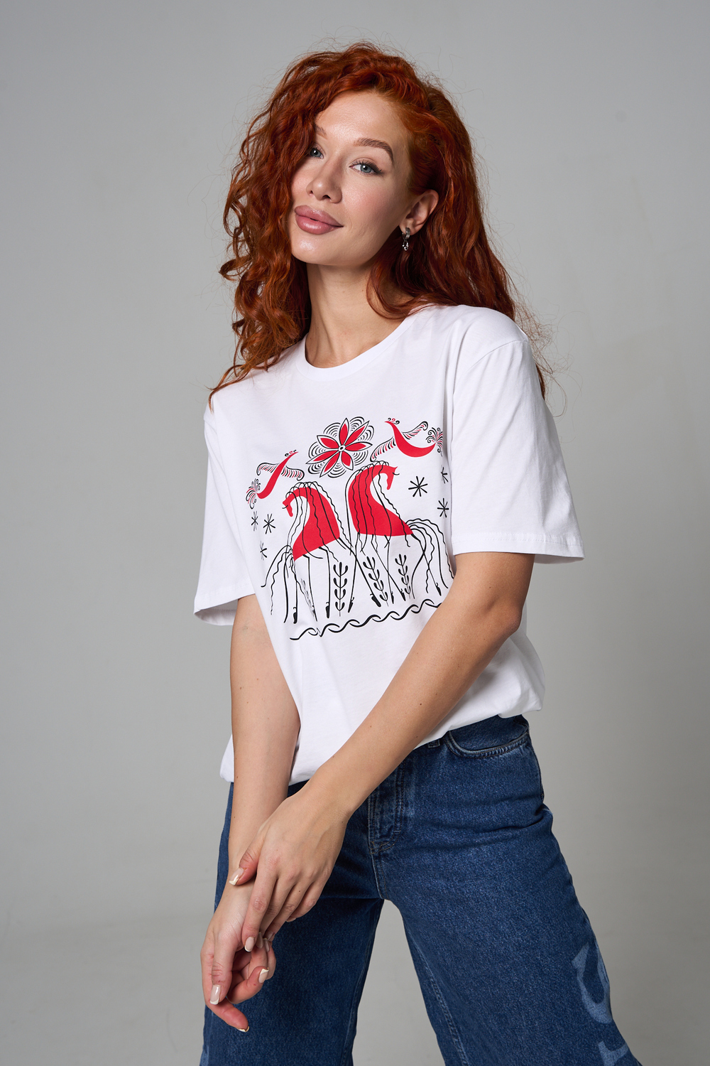 Хлопковая футболка с русским народным узором. Изготовлена из 100% высококачественного хлопка. Дышащая футболка гарантирует комфорт в течение всего дня, а прочный материал долго сохраняет форму и яркость принта.