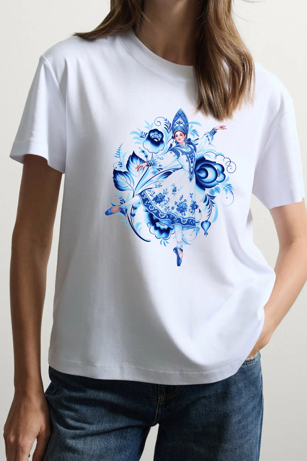 Хлопковая футболка с русским народным узором. Изготовлена из 100% высококачественного хлопка. Дышащая футболка гарантирует комфорт в течение всего дня, а прочный материал долго сохраняет форму и яркость принта.