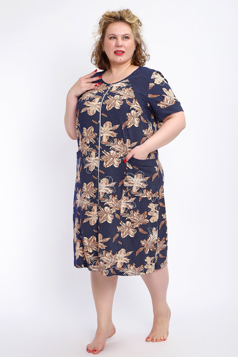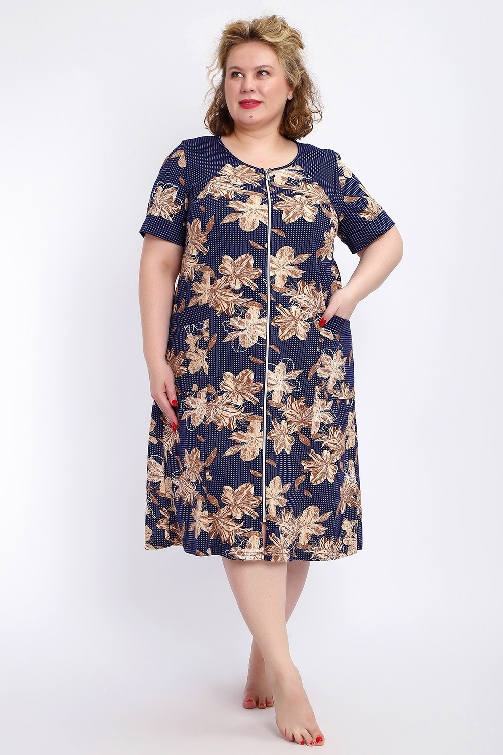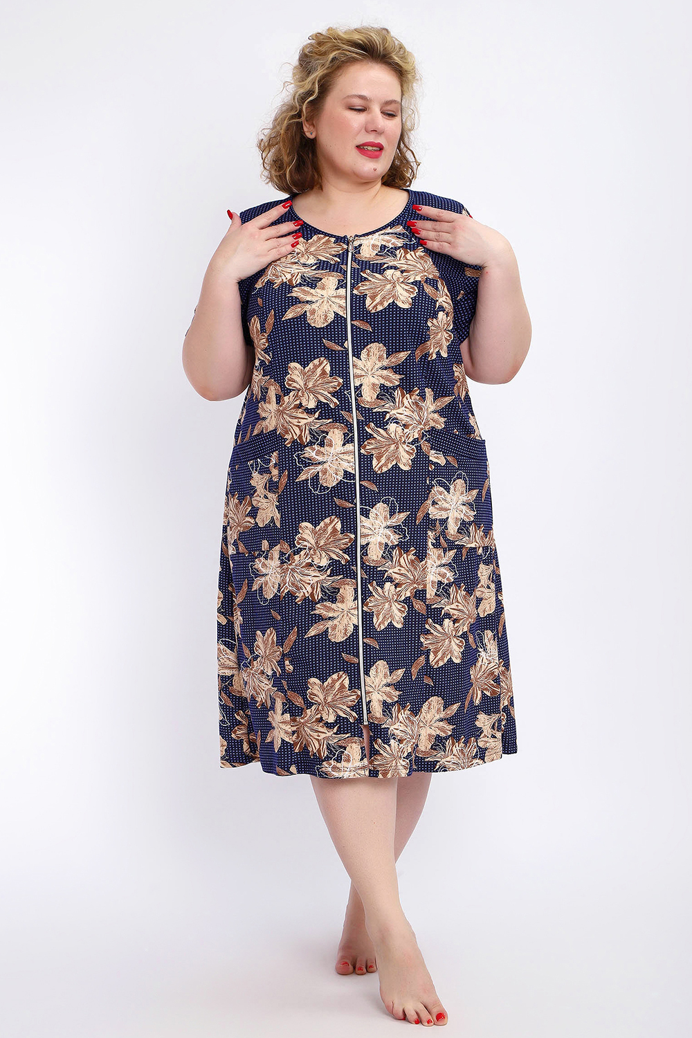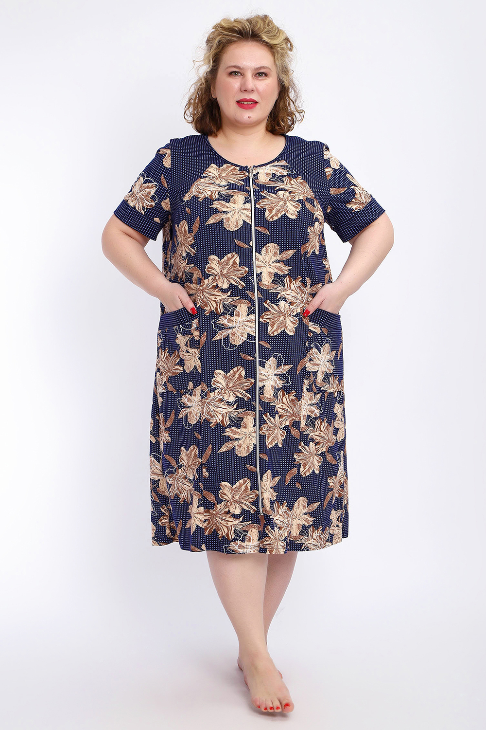 Ощутите домашний уют и комфорт - выбирайте халат женский домашний больших размеров  из мягкой хлопковой ткани с очаровательным принтом. Халат на молнии является самой популярной моделью, обеспечивает удобство во время носки, не сковывает движений. Прямой свободный крой платья позволяет скрыть недостатки фигуры и ощущать легкость во время домашнего отдыха. Халат домашний дополнен накладными карманами и стильной круглой горловиной, которая оформлена декоративными планками. Длина платья универсальная, за колено. В наличии есть большие размеры, поэтому выбирайте такой халат в роддом. Изделие выглядит стильно и привлекательно за счет нежных светлых бутонов цветов на контрастном темном фоне. Женская домашняя одежда российского производства имеет идеальную посадку, не линяет, не дает усадку после стирки и долго сохраняет первоначальный внешний вид.