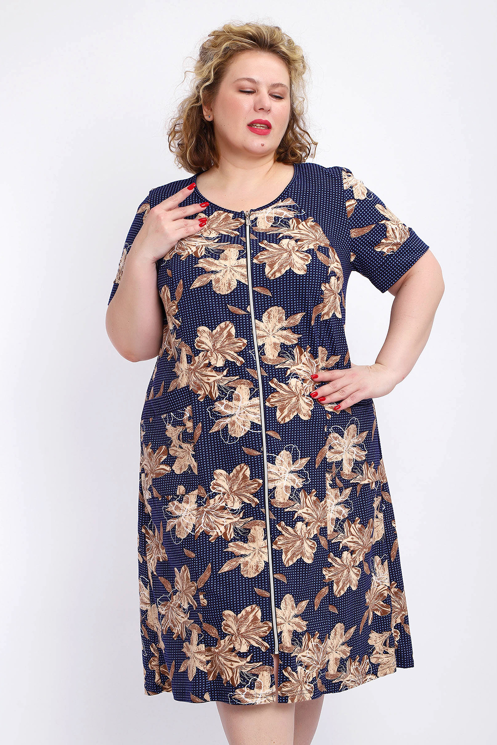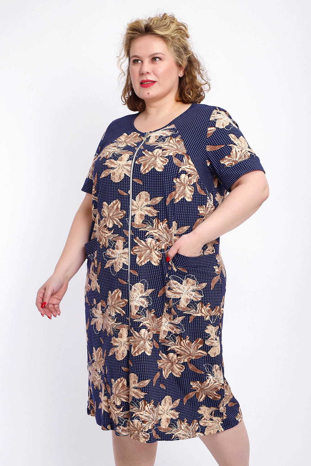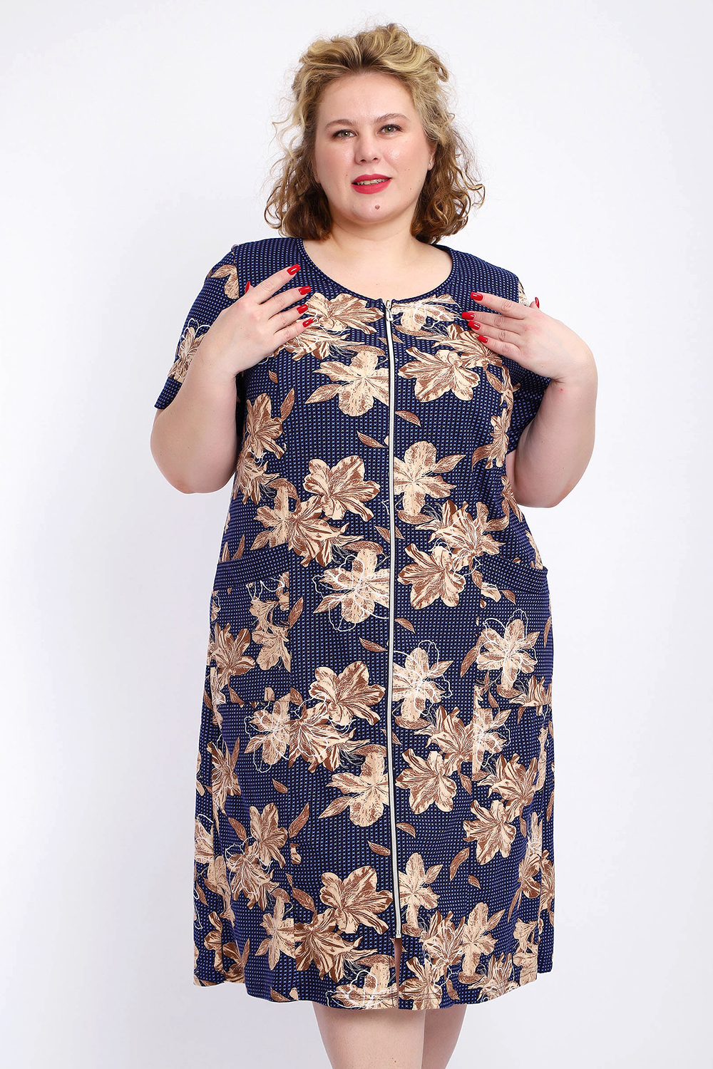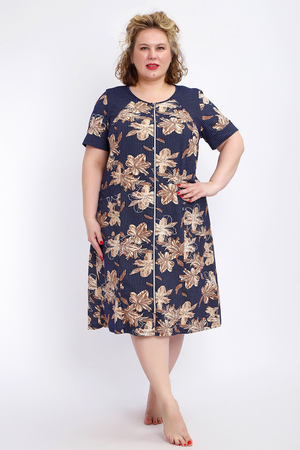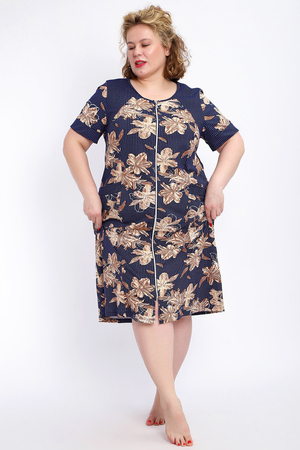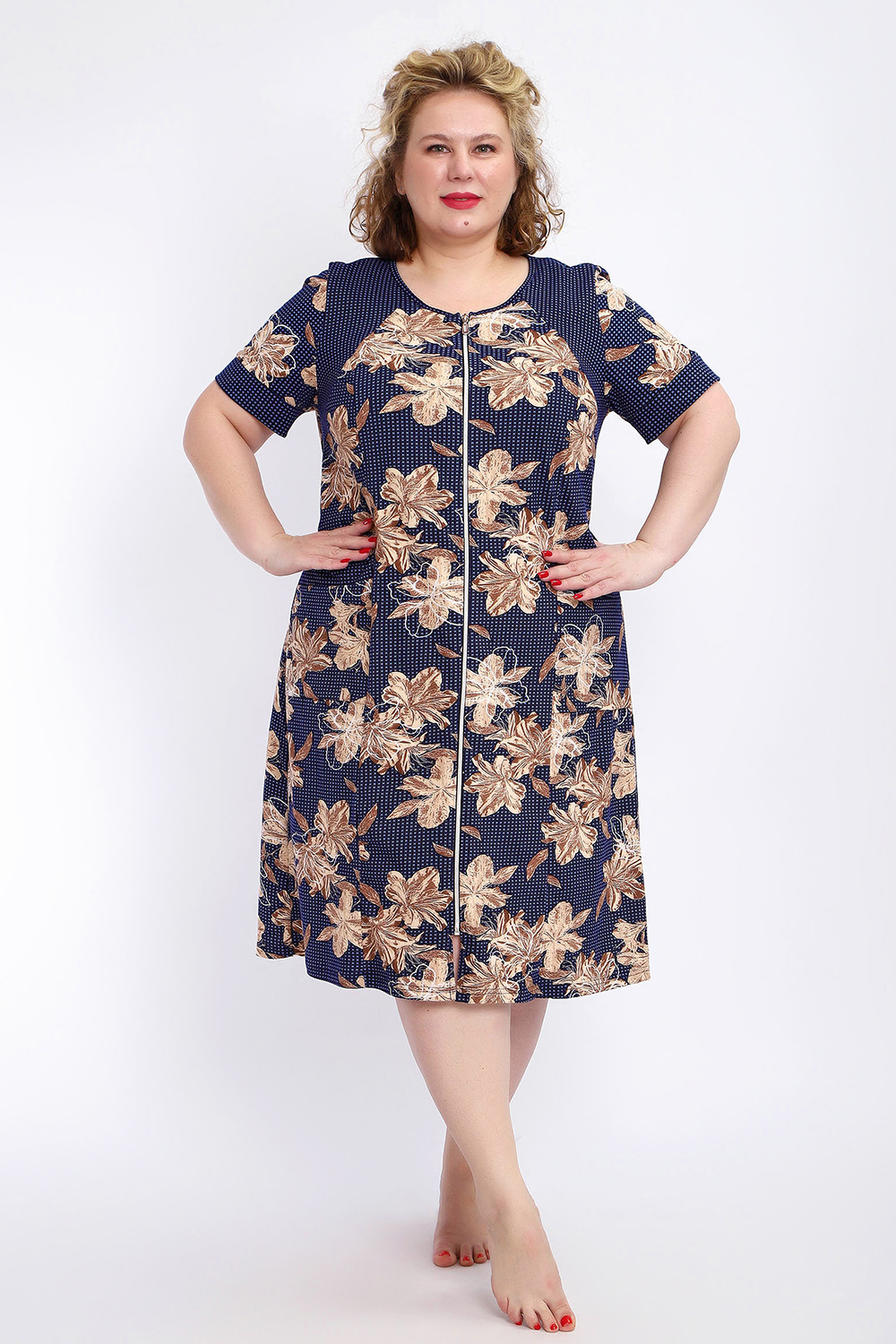 Ощутите домашний уют и комфорт - выбирайте халат женский домашний больших размеров  из мягкой хлопковой ткани с очаровательным принтом. Халат на молнии является самой популярной моделью, обеспечивает удобство во время носки, не сковывает движений. Прямой свободный крой платья позволяет скрыть недостатки фигуры и ощущать легкость во время домашнего отдыха. Халат домашний дополнен накладными карманами и стильной круглой горловиной, которая оформлена декоративными планками. Длина платья универсальная, за колено. В наличии есть большие размеры, поэтому выбирайте такой халат в роддом. Изделие выглядит стильно и привлекательно за счет нежных светлых бутонов цветов на контрастном темном фоне. Женская домашняя одежда российского производства имеет идеальную посадку, не линяет, не дает усадку после стирки и долго сохраняет первоначальный внешний вид.