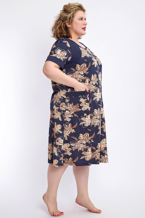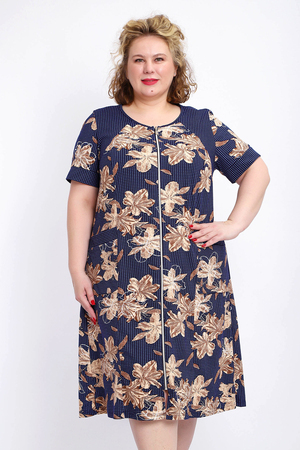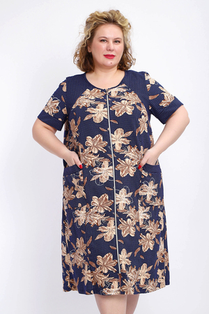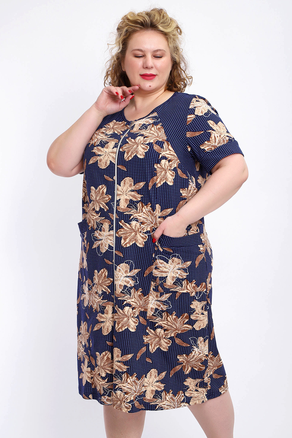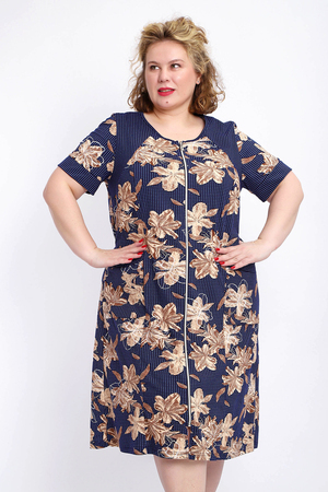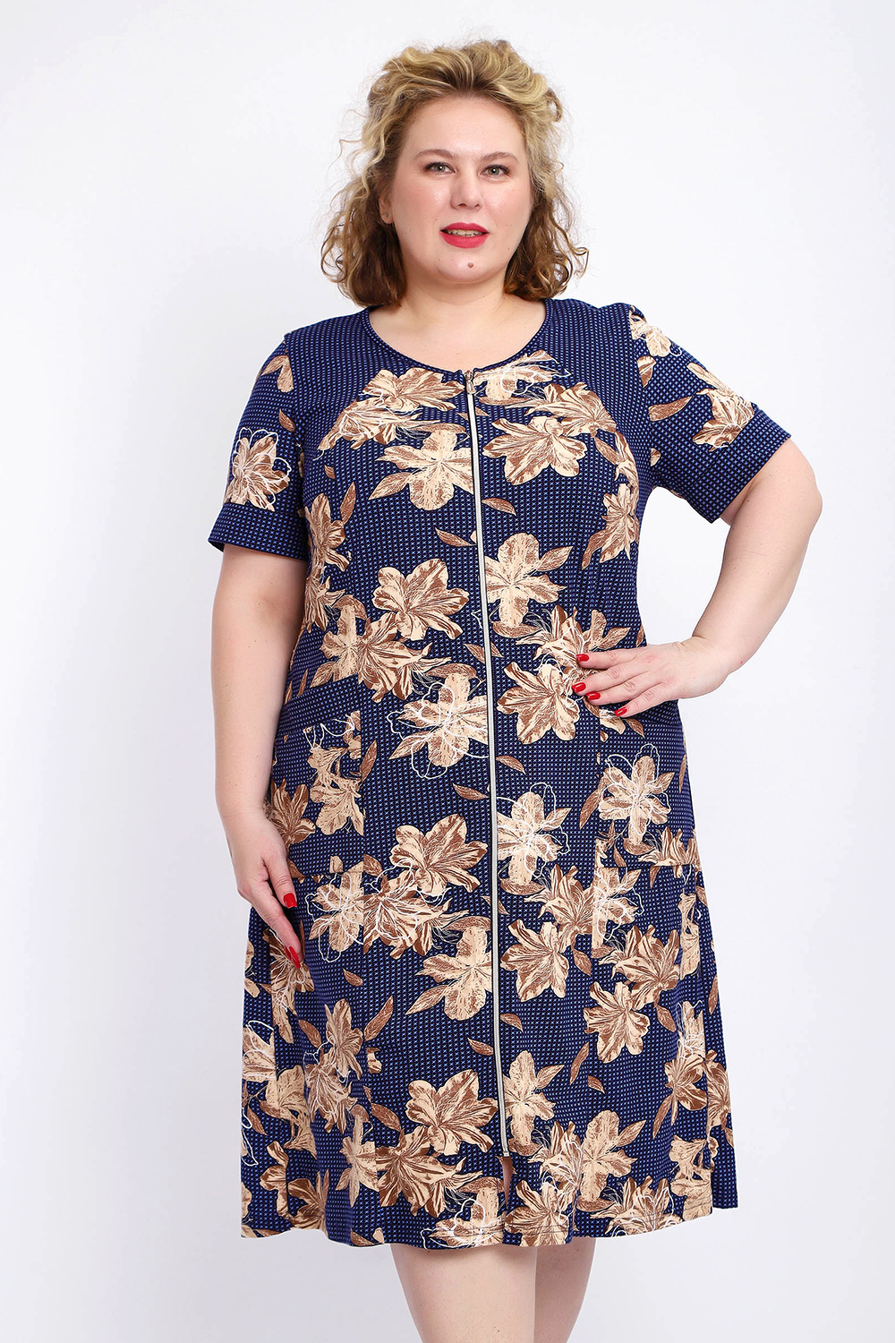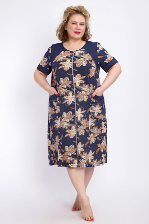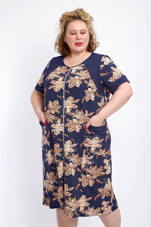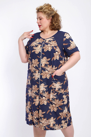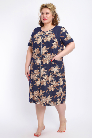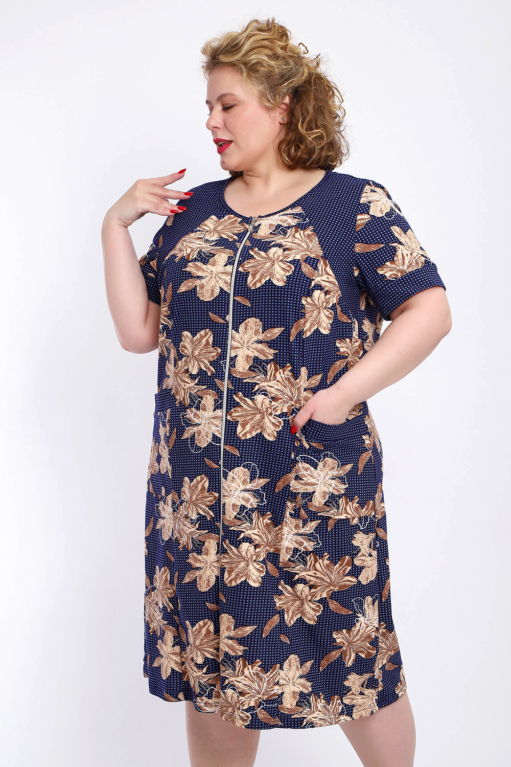 Ощутите домашний уют и комфорт - выбирайте халат женский домашний больших размеров  из мягкой хлопковой ткани с очаровательным принтом. Халат на молнии является самой популярной моделью, обеспечивает удобство во время носки, не сковывает движений. Прямой свободный крой платья позволяет скрыть недостатки фигуры и ощущать легкость во время домашнего отдыха. Халат домашний дополнен накладными карманами и стильной круглой горловиной, которая оформлена декоративными планками. Длина платья универсальная, за колено. В наличии есть большие размеры, поэтому выбирайте такой халат в роддом. Изделие выглядит стильно и привлекательно за счет нежных светлых бутонов цветов на контрастном темном фоне. Женская домашняя одежда российского производства имеет идеальную посадку, не линяет, не дает усадку после стирки и долго сохраняет первоначальный внешний вид.