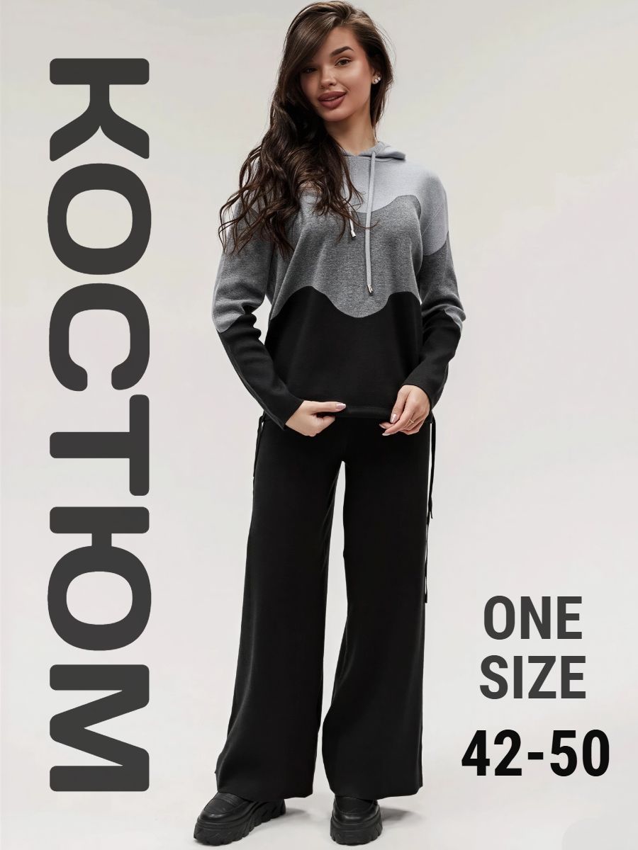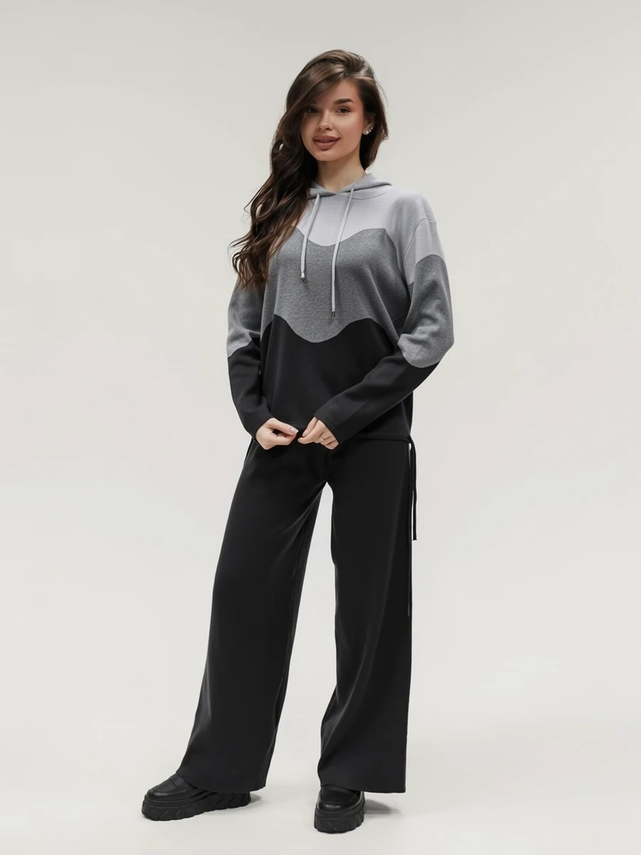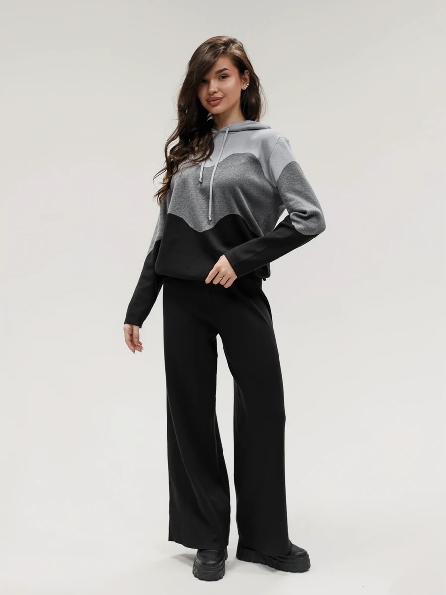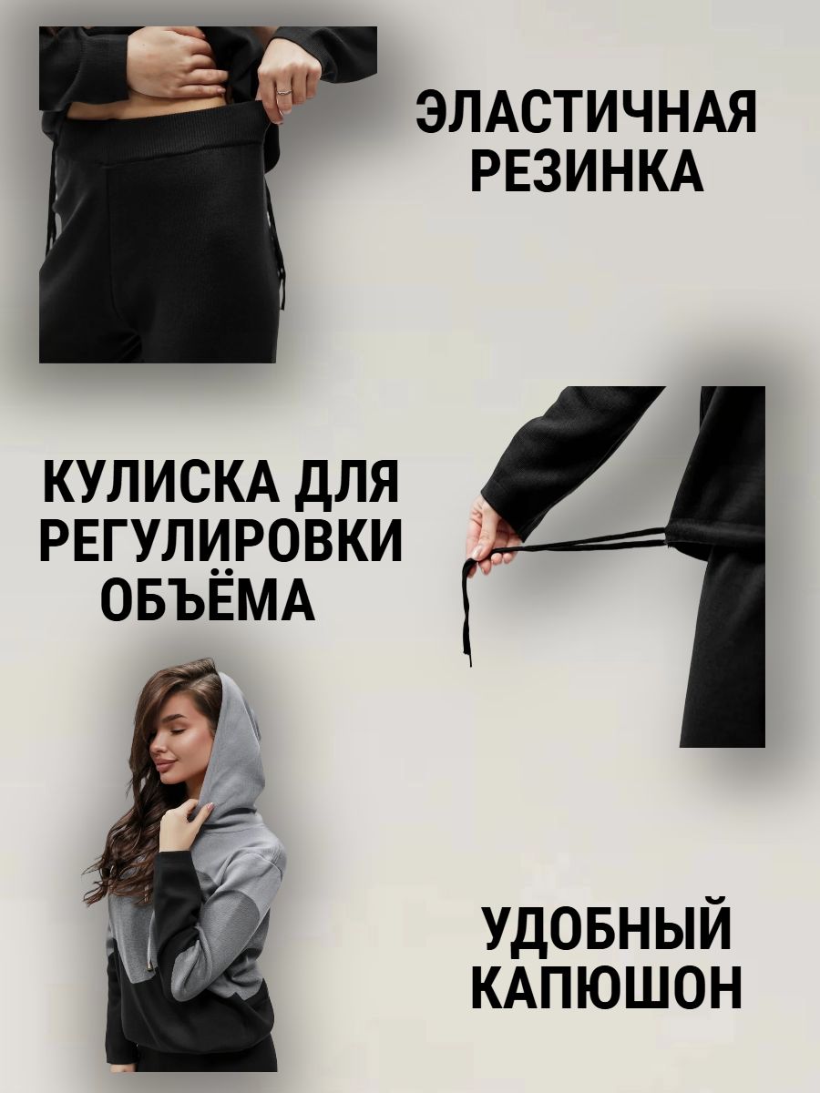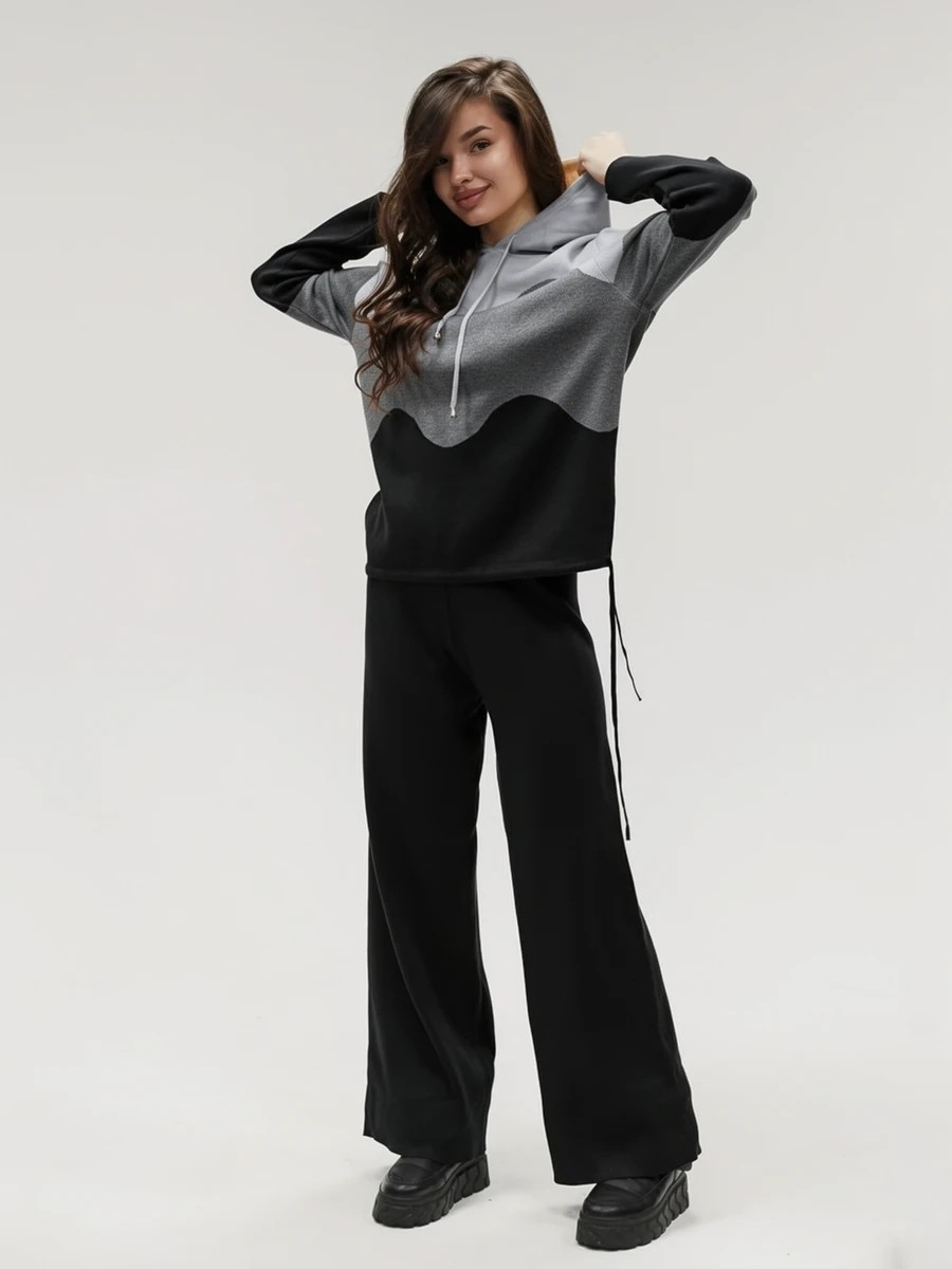 Крой кофты свободный, с капюшоном, кулиской по нижнему краю и эластичными манжетами; крой брюк прямой силуэт, средняя посадка, эластичный пояс. Особенности: кофта с регулируемым капюшоном и кулиской, брюки без карманов. Уход: деликатная стирка при температуре не выше 30∘C, сушка в расправленном виде на горизонтальной поверхности, не отбеливать, при необходимости бережная химчистка. Благодаря эластичному материалу костюм адаптируется под параметры фигуры и комфортно сидит,а лаконичный дизайн делает его универсальным он легко вписывается в разные образы и сочетается с любой обувью, от кроссовок до ботинок. Минималистичный крой и отсутствие лишних деталей подчёркивают сдержанный стиль и делают костюм практичным решением на каждый день