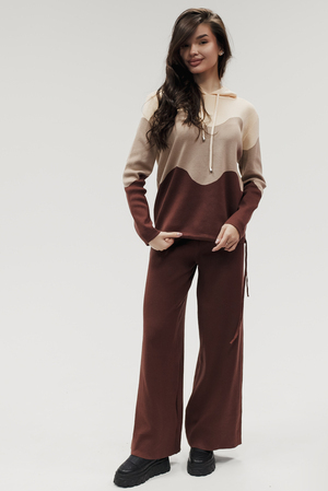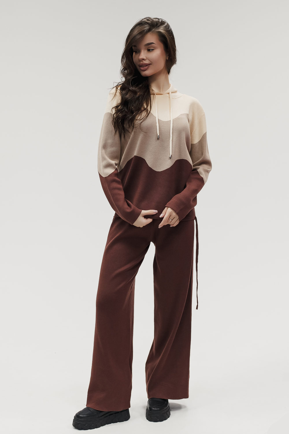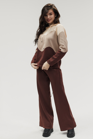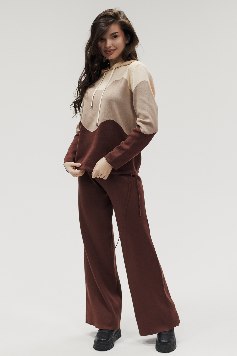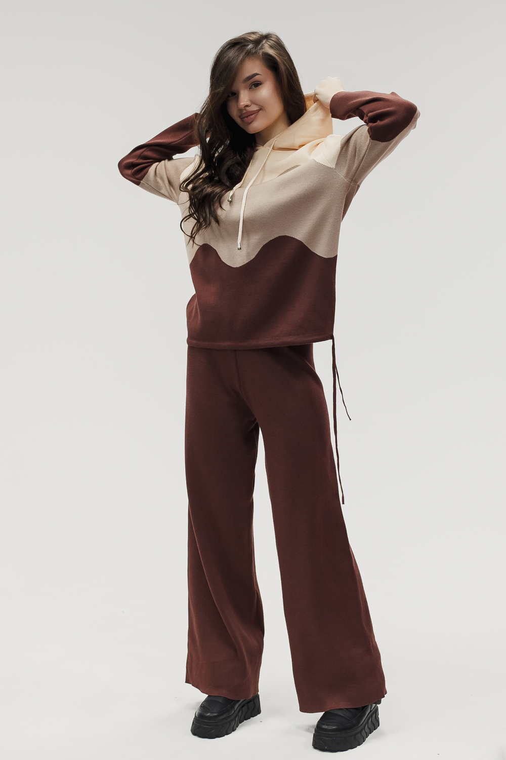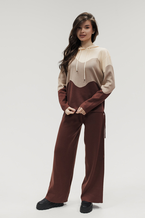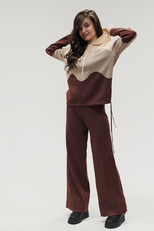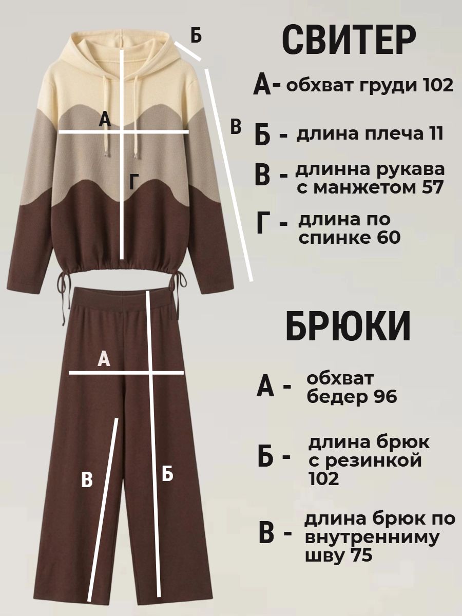 Крой кофты свободный, с капюшоном, кулиской по нижнему краю и эластичными манжетами; крой брюк прямой силуэт, средняя посадка, эластичный пояс. Особенности: кофта с регулируемым капюшоном и кулиской, брюки без карманов. Уход: деликатная стирка при температуре не выше 30∘C, сушка в расправленном виде на горизонтальной поверхности, не отбеливать, при необходимости бережная химчистка. Благодаря эластичному материалу костюм адаптируется под параметры фигуры и комфортно сидит,а лаконичный дизайн делает его универсальным он легко вписывается в разные образы и сочетается с любой обувью, от кроссовок до ботинок. Минималистичный крой и отсутствие лишних деталей подчёркивают сдержанный стиль и делают костюм практичным решением на каждый день