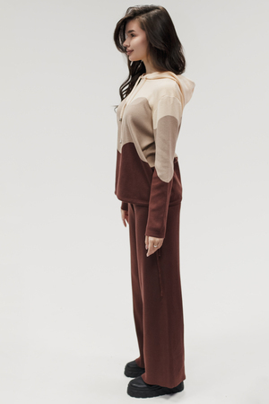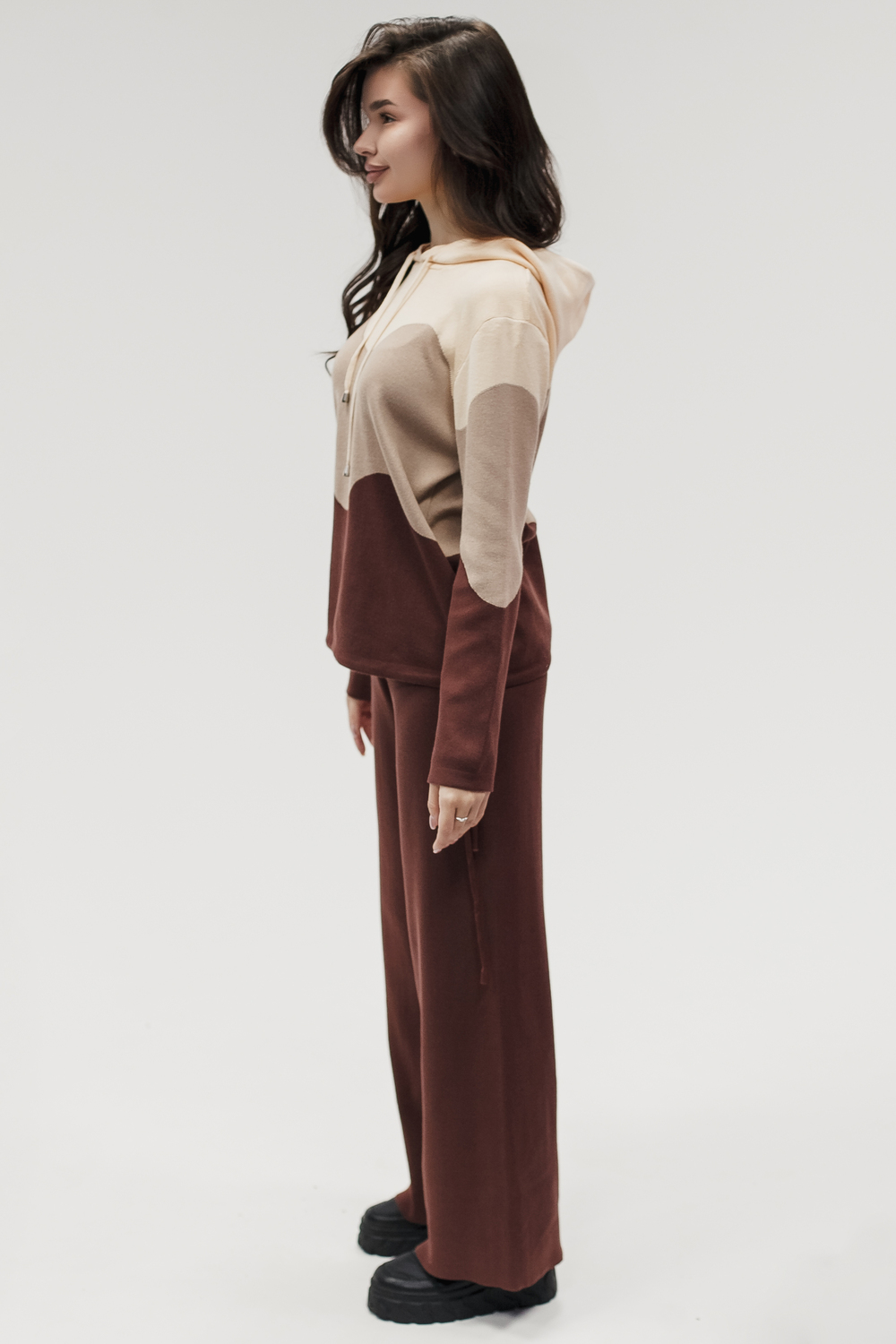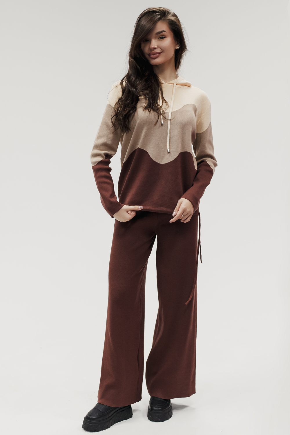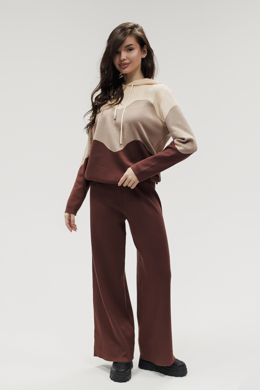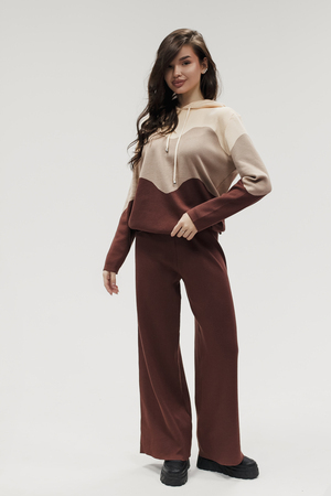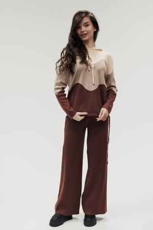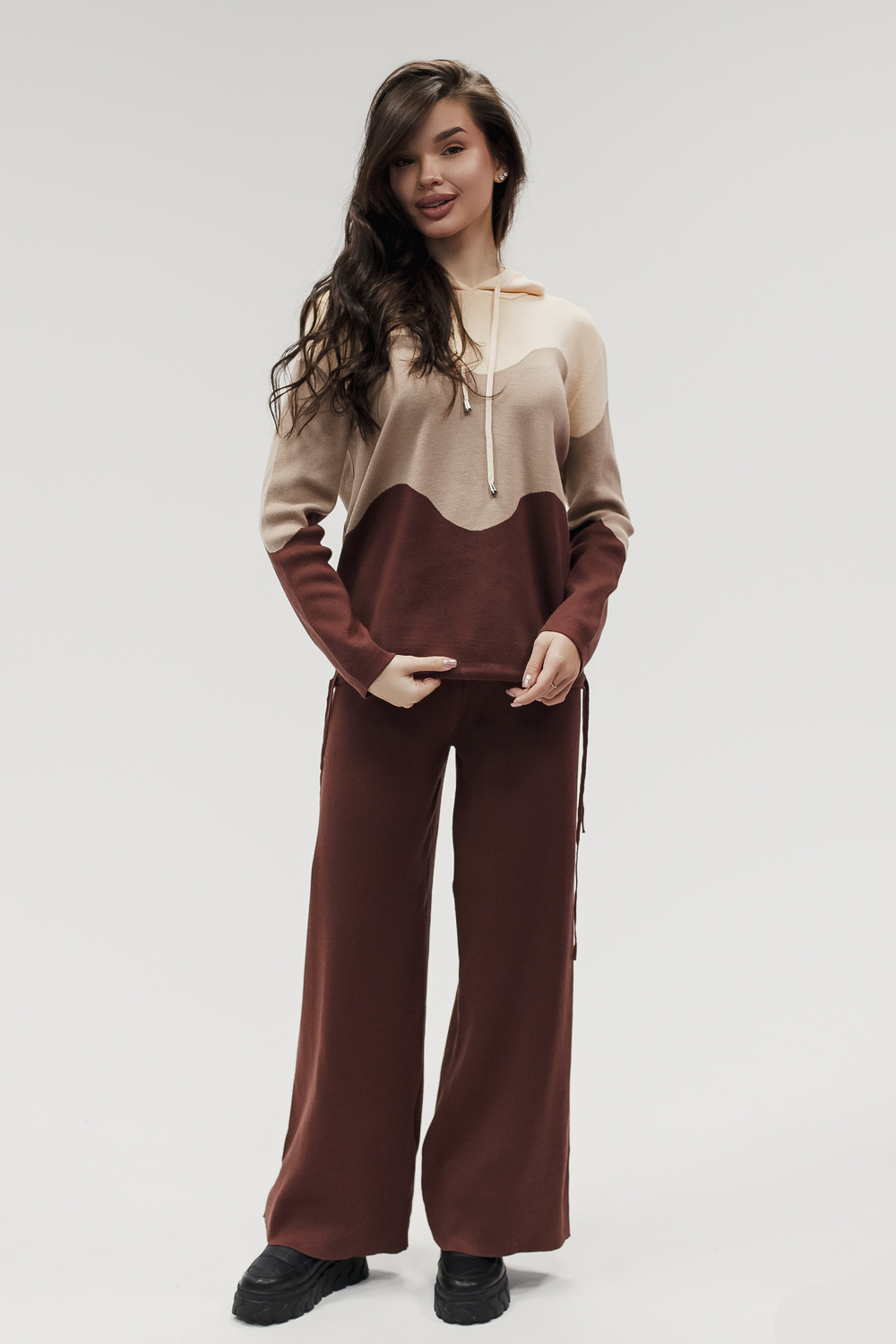 Крой кофты свободный, с капюшоном, кулиской по нижнему краю и эластичными манжетами; крой брюк прямой силуэт, средняя посадка, эластичный пояс. Особенности: кофта с регулируемым капюшоном и кулиской, брюки без карманов. Уход: деликатная стирка при температуре не выше 30∘C, сушка в расправленном виде на горизонтальной поверхности, не отбеливать, при необходимости бережная химчистка. Благодаря эластичному материалу костюм адаптируется под параметры фигуры и комфортно сидит,а лаконичный дизайн делает его универсальным он легко вписывается в разные образы и сочетается с любой обувью, от кроссовок до ботинок. Минималистичный крой и отсутствие лишних деталей подчёркивают сдержанный стиль и делают костюм практичным решением на каждый день