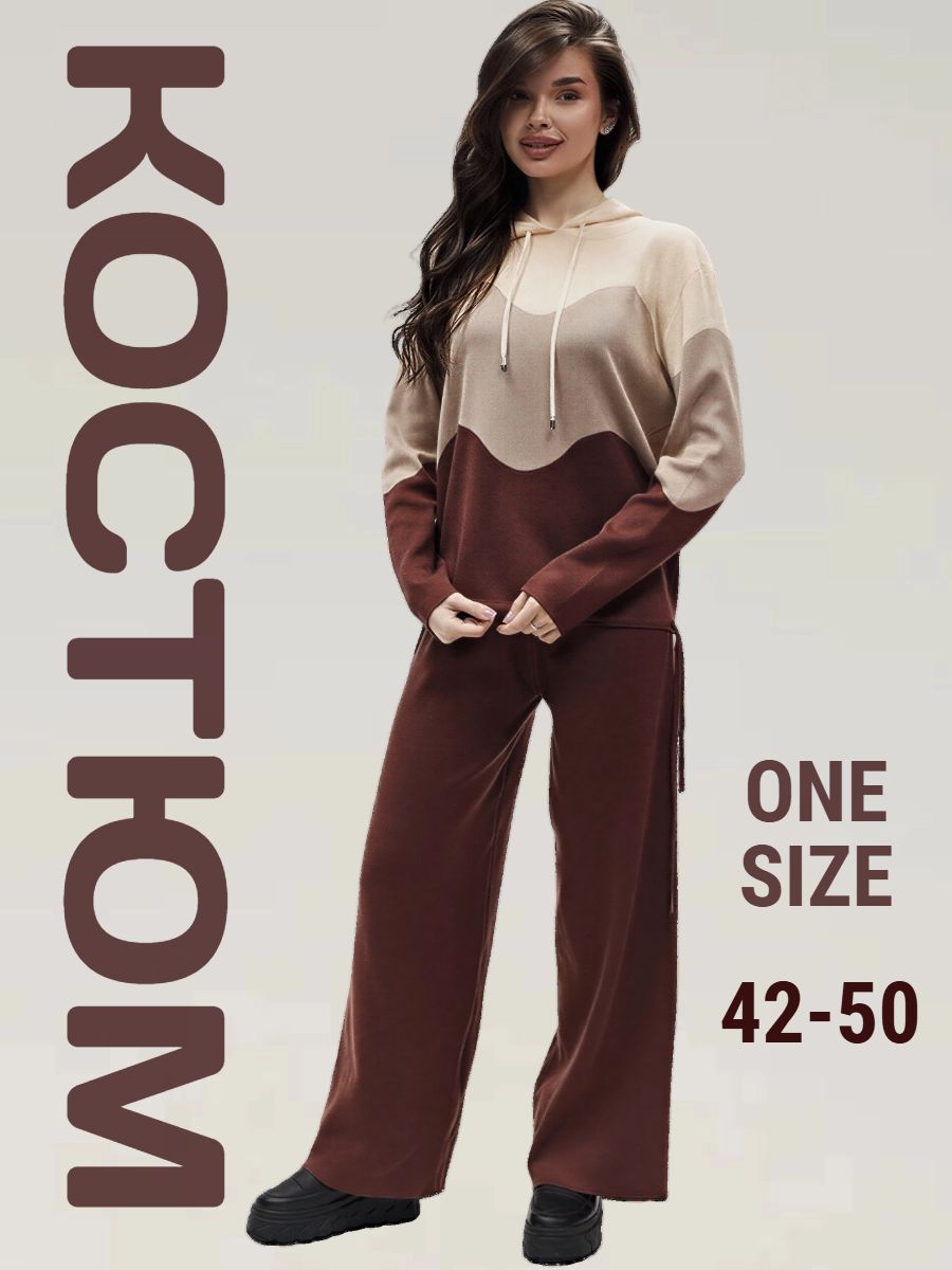 Женский костюм — кофта с капюшоном и прямыми брюками без карманов это уютный и стильный комплект, который станет вашим фаворитом для прохладных дней. Практичный костюм с лаконичным дизайном выбор тех, кто ценит минимализм, свободу движений и продуманные детали. Комплект состоит из удобной кофты с капюшоном и прямых брюк: он подойдёт для прогулок, отдыха дома и повседневных дел в прохладную погоду. Комфорт и тепло обеспечены за счёт мягкой, эластичной и плотной ткани, которая сохраняет тепло и не сковывает движения. Капюшон кофты защитит от ветра и лёгкого дождя, а кулиска по нижнему краю позволяет регулировать объём и дополнительно уберечься от сквозняков. Универсальная посадка гарантирует удобство: свободный крой кофты и прямой силуэт брюк обеспечивают комфорт для разных типов фигуры, а эластичный пояс на брюках гарантирует удобную посадку и не передавливает. Минималистичный дизайн без карманов на брюках придаёт комплекту лаконичность и позволяет легко комбинировать его с разной верхней одеждой — от пуховика до пальто. Костюм подойдёт для повседневных прогулок в городе, поездок и путешествий, активного отдыха на природе, домашних дел и уютного отдыха дома, а также для образов в стиле кэжуал для учёбы или неформальной работы. Состав ткани: 30 % хлопок, 40 % вискоза, 30 % полиэстер. Сезонность: осень, зима, весна прохладное лето. Размеры: 42–50.