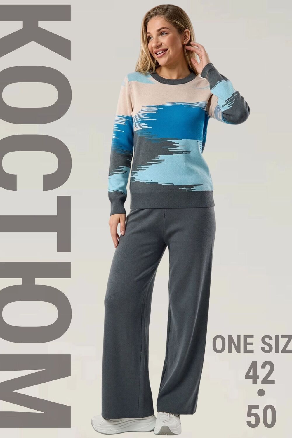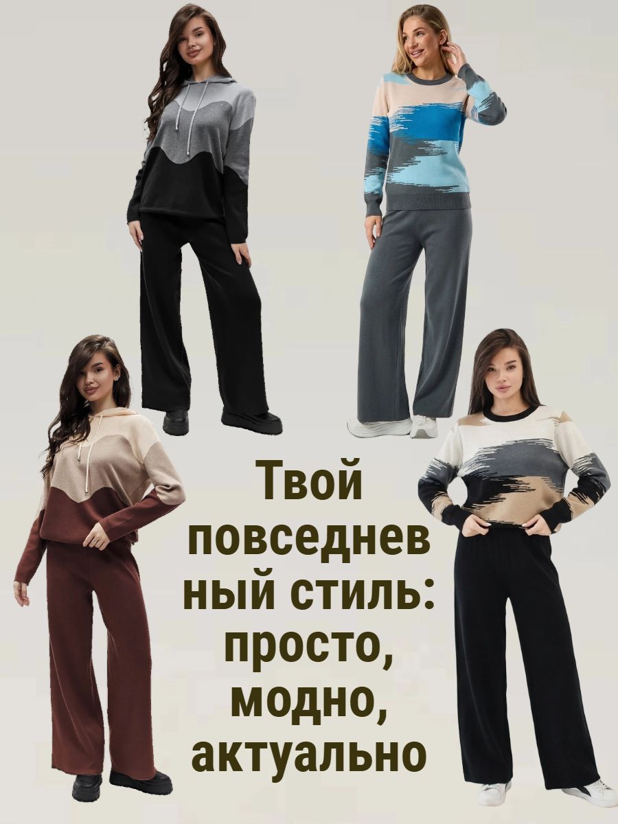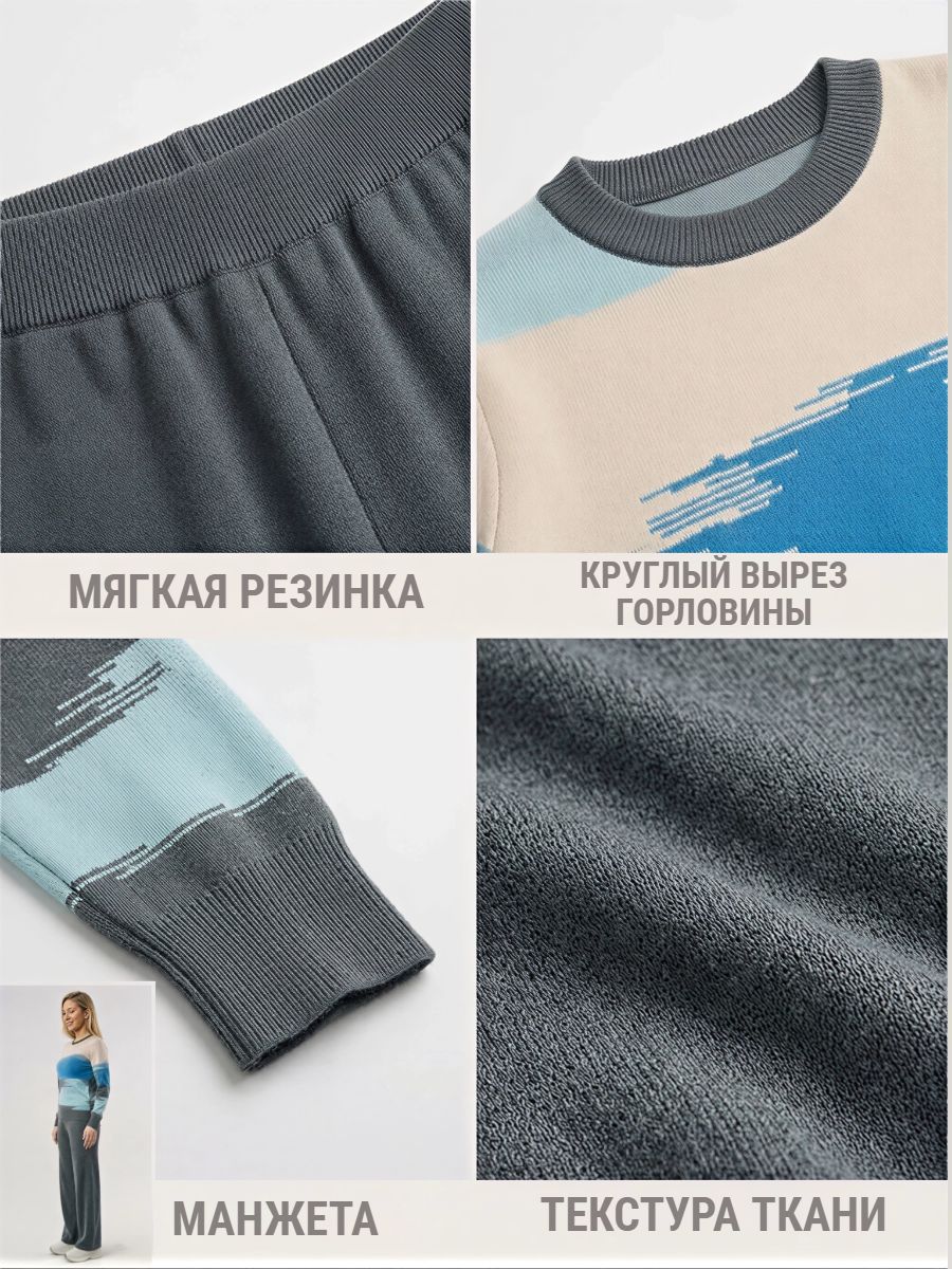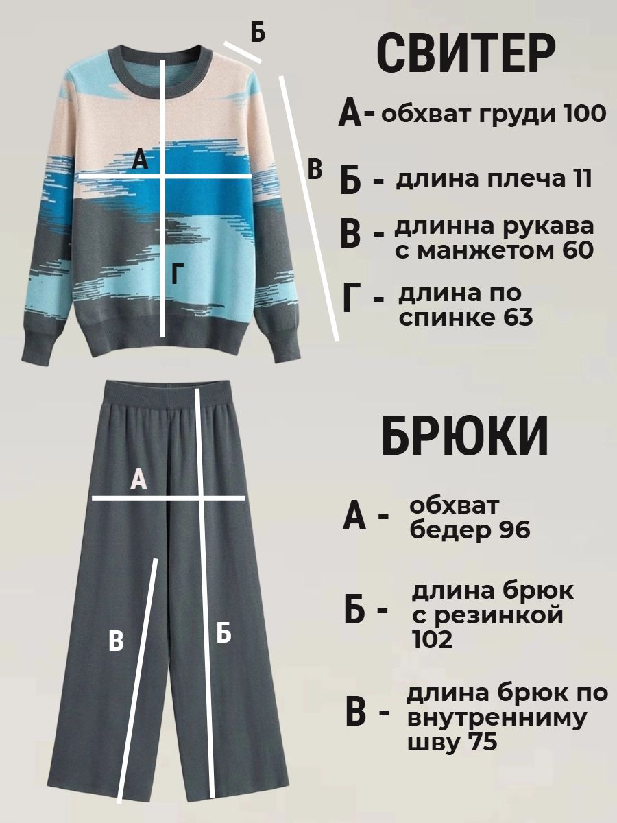 Этот тёплый женский вязаный костюм — гармоничный комплект из свитера и брюк, выполненный из плотной, мягкой и эластичной пряжи (состав: 30% хлопок, 40% вискоза, 30% полиэстер), который надёжно сохраняет тепло и при этом приятно прилегает к телу. Свитер свободного кроя визуально стройнит, манжеты и нижняя кромка обработаны резинкой для лучшей посадки и сохранения формы. Плечи оформлены со скосом или лёгким «полупритёком» для комфортной посадки на фигуры разных типов; брюки средней посадки с эластичным поясом и внутренней мягкой тесьмой или шнурком обеспечивают индивидуальную регулировку, прямой силуэт свободно сидит, благодаря эластичности материала изделие «тянется» и адаптируется под параметры от 42 до 50 размера. Аккуратные декоративные швы,  узорная вязка, легко сочетаются с верхней одеждой и аксессуарами; материал и плотная вязка делают костюм универсальным для осенне-зимнего периода, весны  и прохладного лета— он отлично подойдёт как для прогулок и поездок, так и для уютных домашних вечеров или неофициальных встреч; уход: рекомендована деликатная стирка руками или в машине на щадящем режиме при температуре не выше 30°C, сушить в расправленном виде на горизонтальной поверхности, не отбеливать, при необходимости возможна бережная химчистка; благодаря продуманной посадке и использованию качественной пряжи комплект сохраняет форму и внешний вид даже при регулярной носке, подчёркивает женственность без лишней вычурности и станет практичным элементом гардероба тех, кто ценит комфорт, тепло и стиль.
