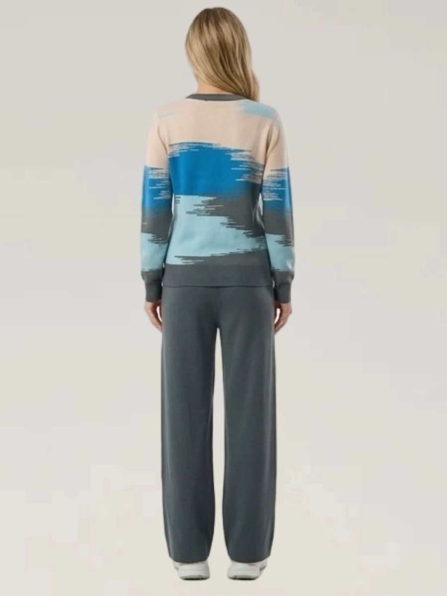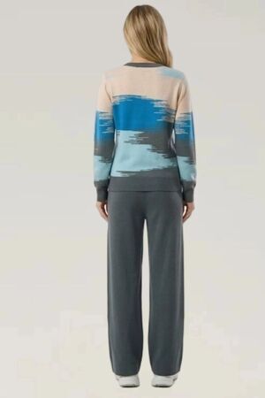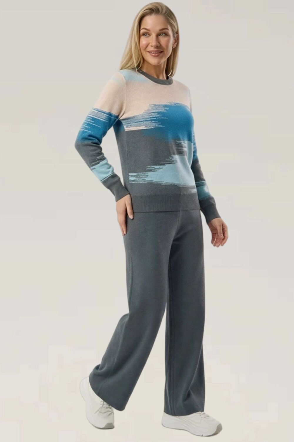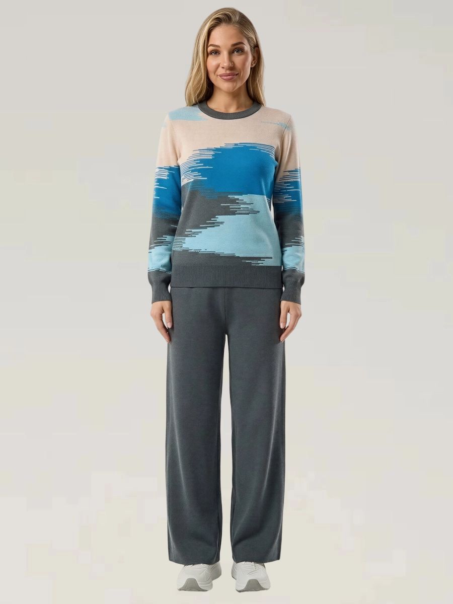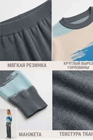 Этот тёплый женский вязаный костюм — гармоничный комплект из свитера и брюк, выполненный из плотной, мягкой и эластичной пряжи (состав: 30% хлопок, 40% вискоза, 30% полиэстер), который надёжно сохраняет тепло и при этом приятно прилегает к телу. Свитер свободного кроя визуально стройнит, манжеты и нижняя кромка обработаны резинкой для лучшей посадки и сохранения формы. Плечи оформлены со скосом или лёгким «полупритёком» для комфортной посадки на фигуры разных типов; брюки средней посадки с эластичным поясом и внутренней мягкой тесьмой или шнурком обеспечивают индивидуальную регулировку, прямой силуэт свободно сидит, благодаря эластичности материала изделие «тянется» и адаптируется под параметры от 42 до 50 размера. Аккуратные декоративные швы,  узорная вязка, легко сочетаются с верхней одеждой и аксессуарами; материал и плотная вязка делают костюм универсальным для осенне-зимнего периода, весны  и прохладного лета— он отлично подойдёт как для прогулок и поездок, так и для уютных домашних вечеров или неофициальных встреч; уход: рекомендована деликатная стирка руками или в машине на щадящем режиме при температуре не выше 30°C, сушить в расправленном виде на горизонтальной поверхности, не отбеливать, при необходимости возможна бережная химчистка; благодаря продуманной посадке и использованию качественной пряжи комплект сохраняет форму и внешний вид даже при регулярной носке, подчёркивает женственность без лишней вычурности и станет практичным элементом гардероба тех, кто ценит комфорт, тепло и стиль.