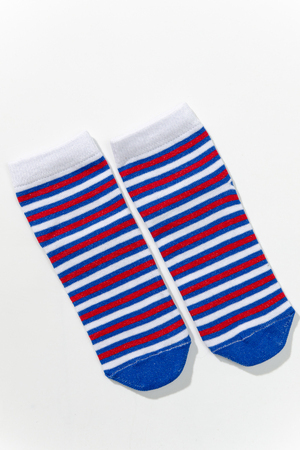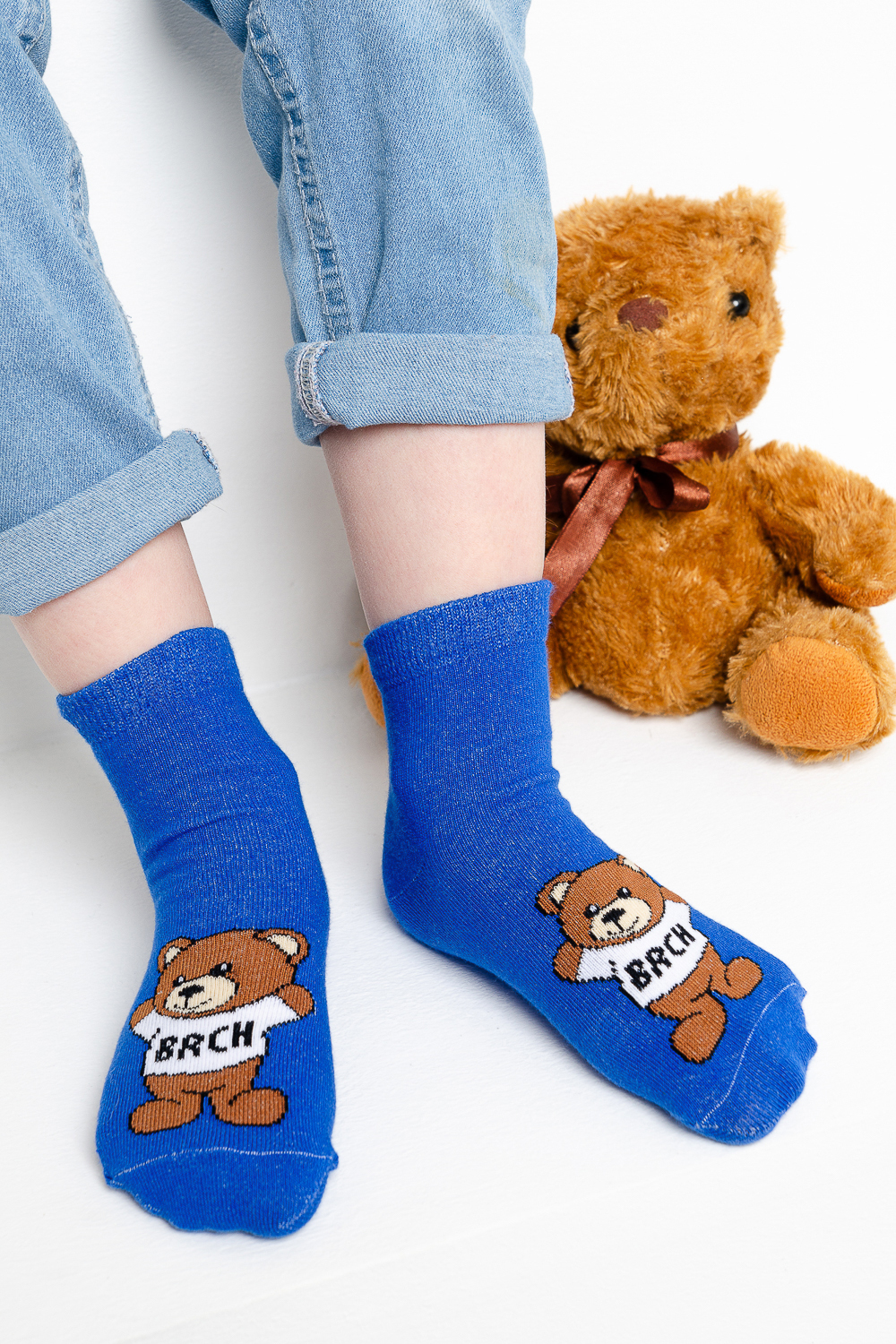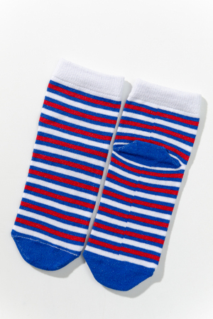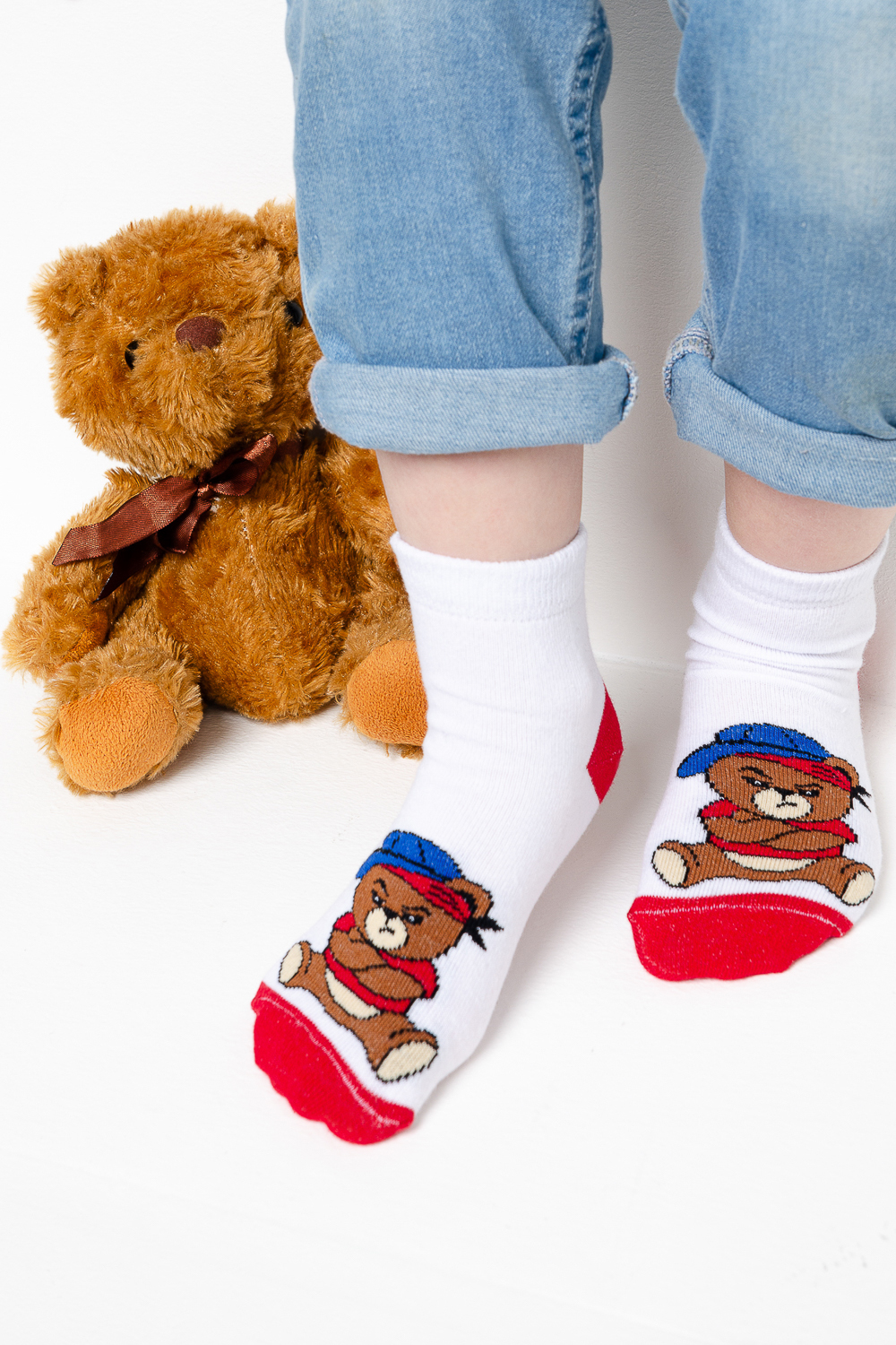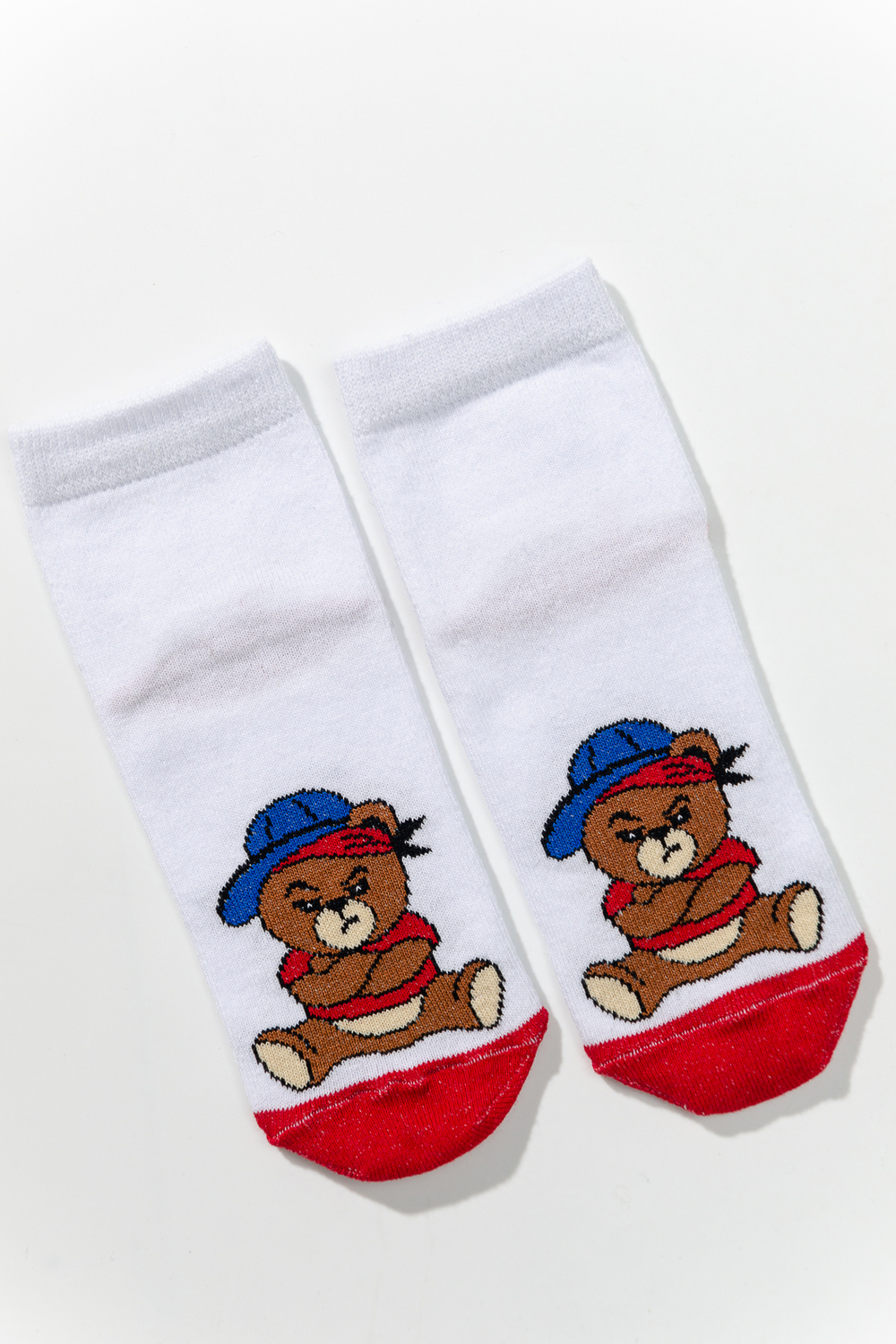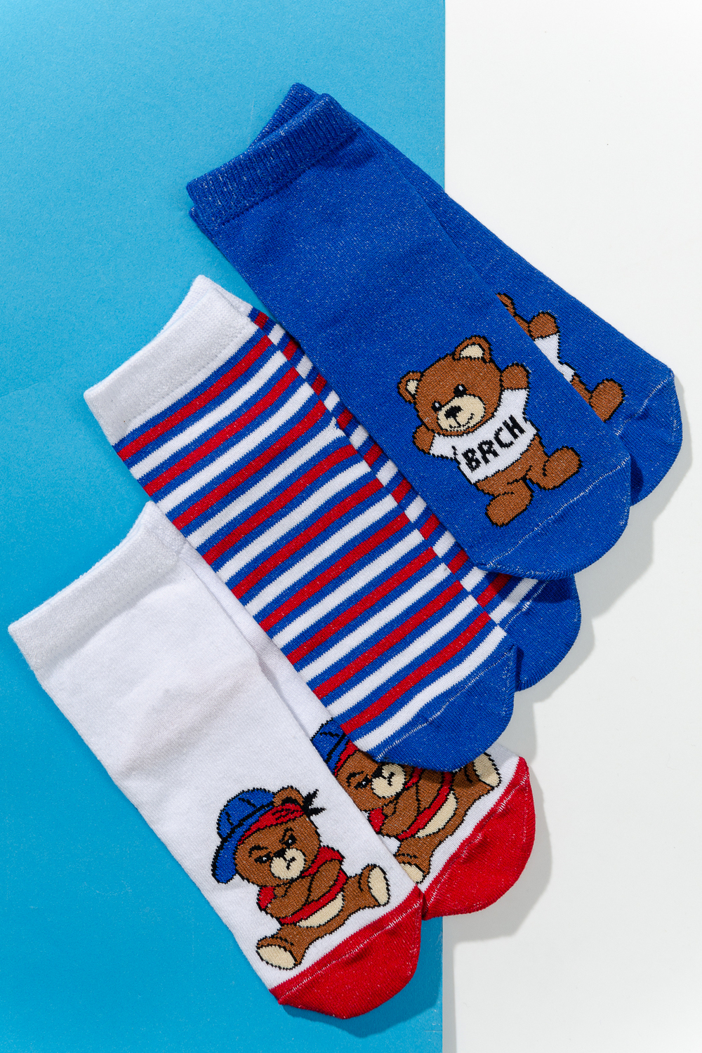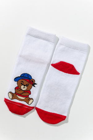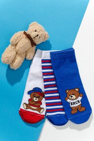 Набор детских носочков. Комплект из трех пар, две из которых с изображением мультяшного Мишки, третья пара в полоску.