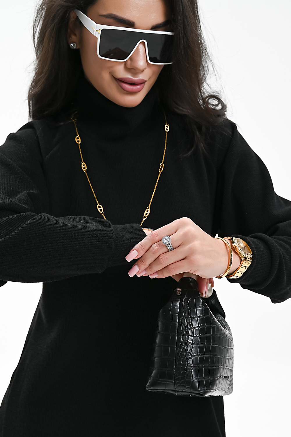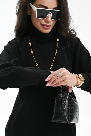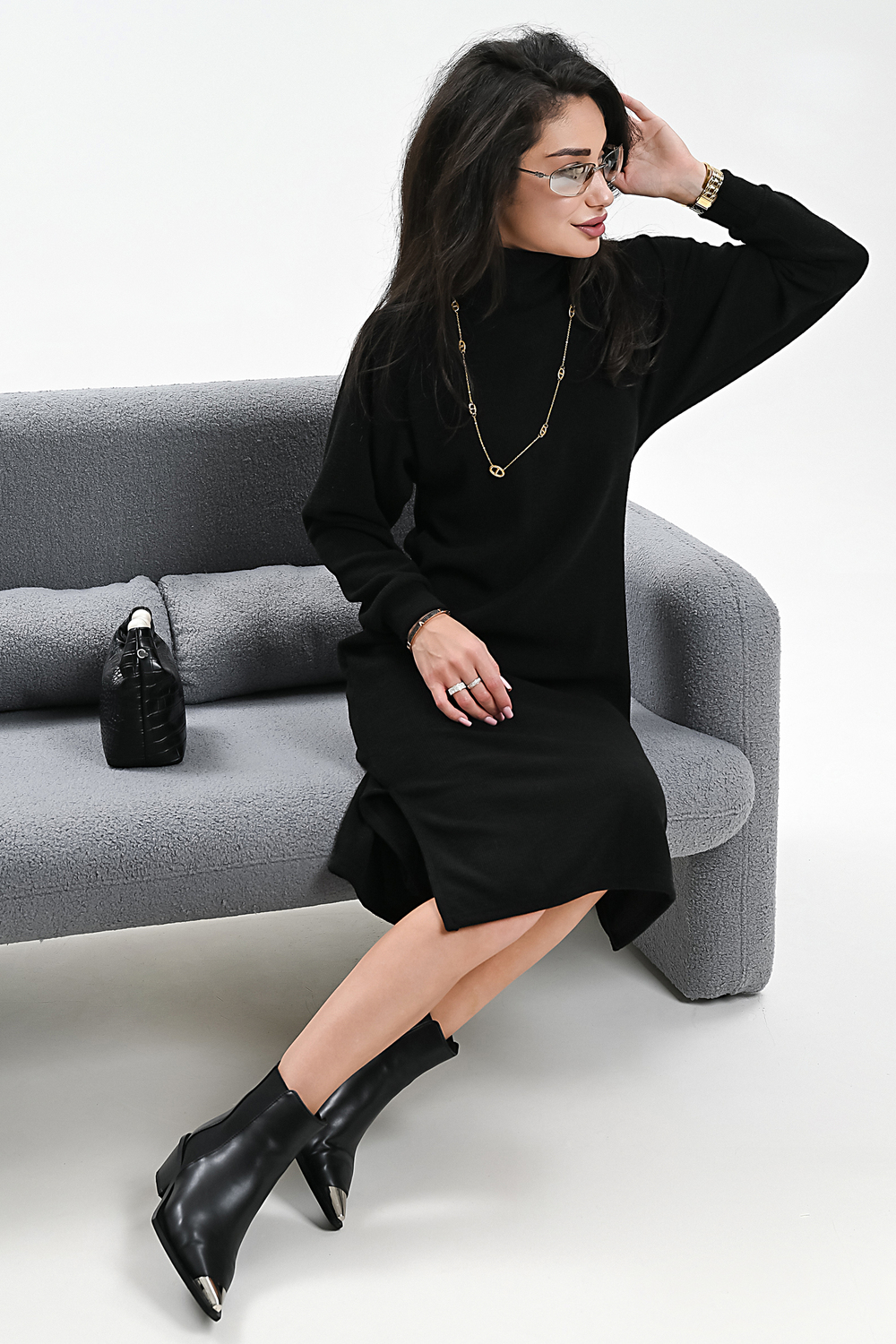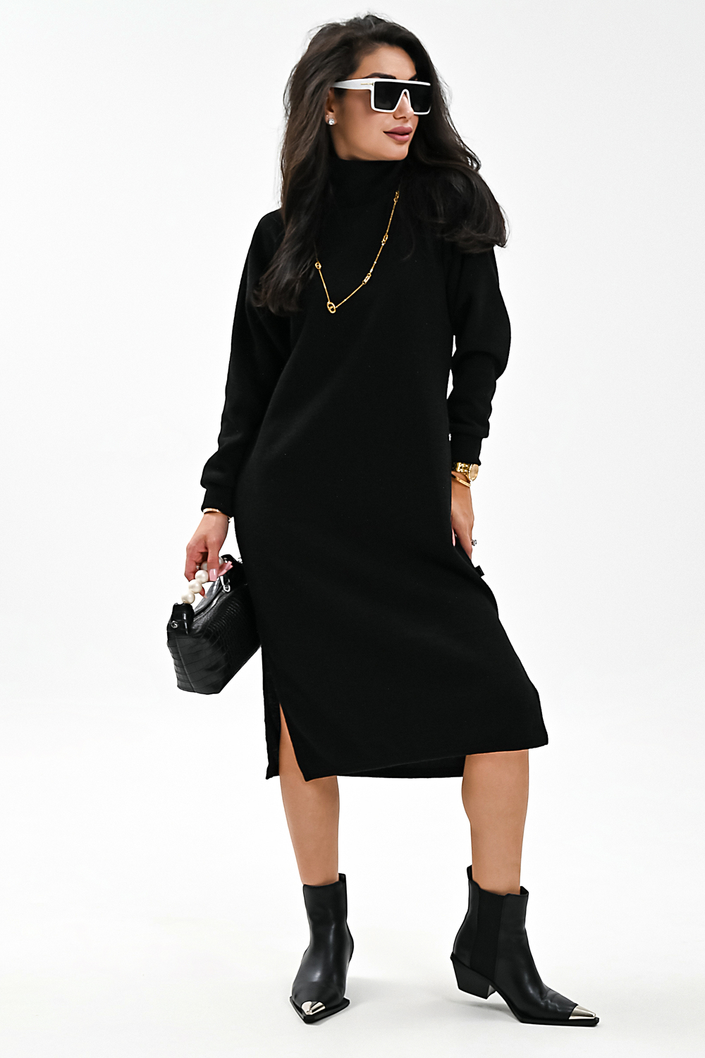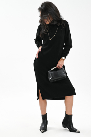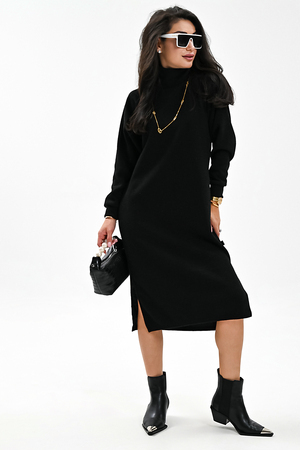 Это стильное вязаное платье черного, бежевого и белого цвета станет незаменимой вещью в вашем осенне-зимнем гардеробе. Модель прямого покроя с длинными рукавами и воротником-стойкой прекрасно подойдет для повседневной носки. Разрез на юбке добавляет образу изысканности и женственности. Платье выполнено из мягкого и приятного к телу материала с добавлением спандекса, что обеспечивает комфорт и свободу движений. Его универсальный черный цвет легко сочетается с различными аксессуарами и обувью.