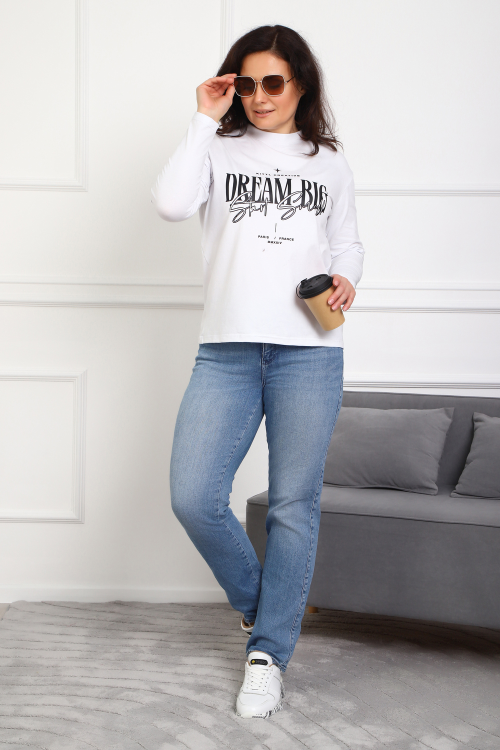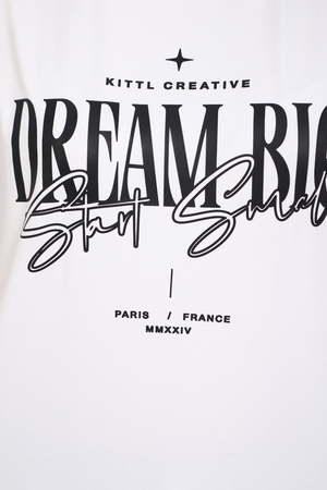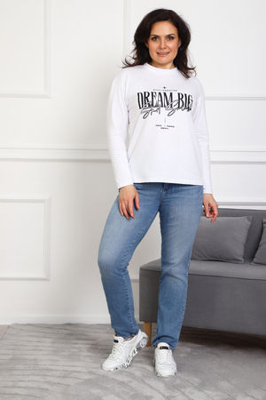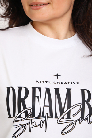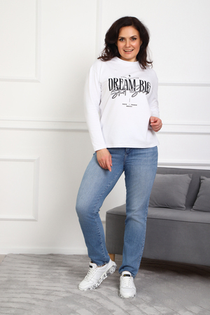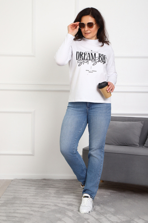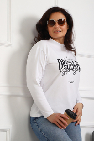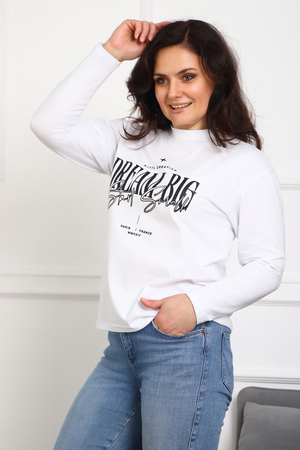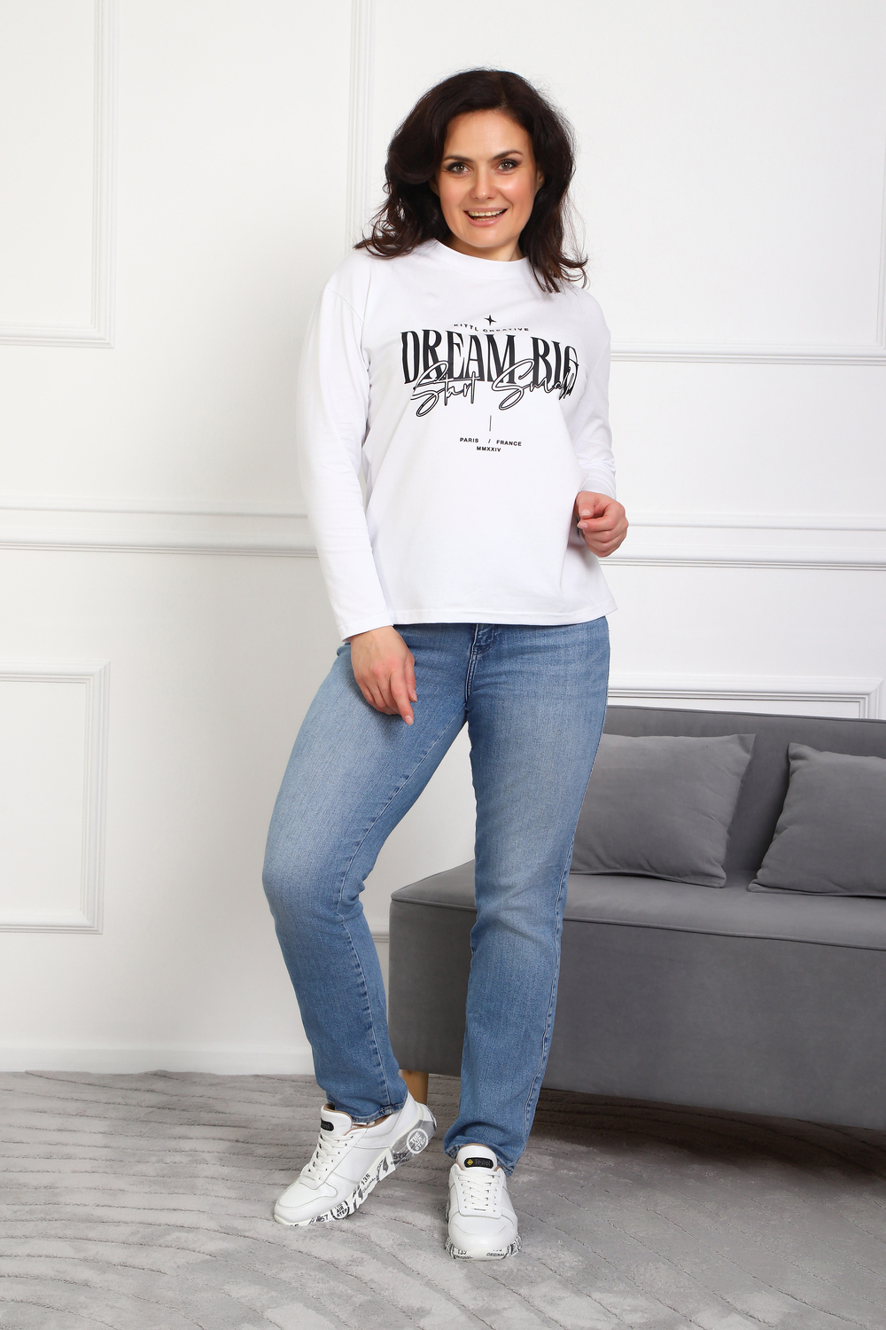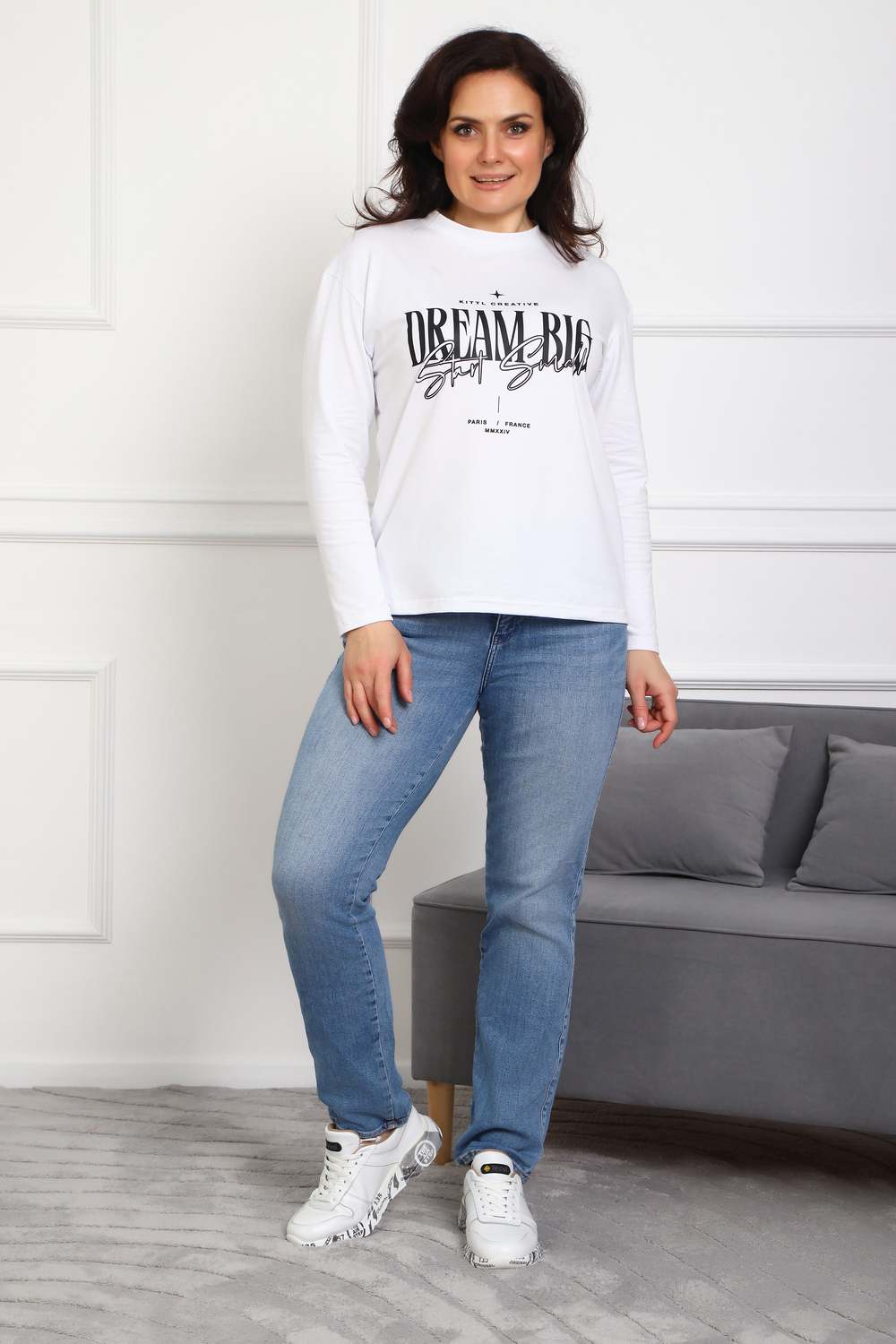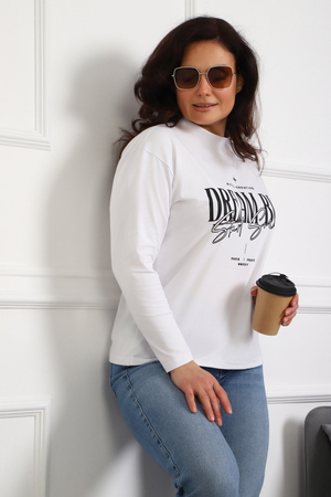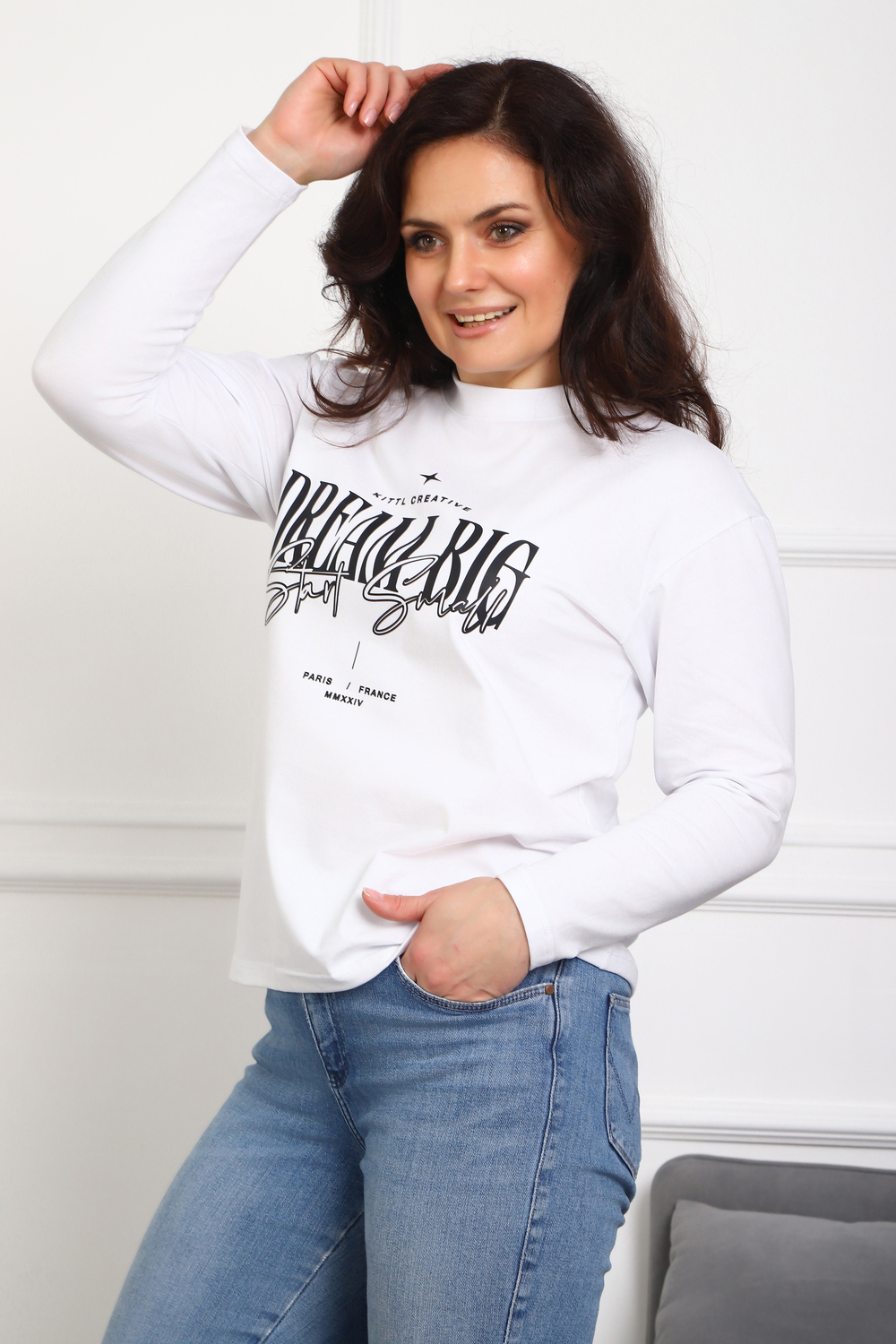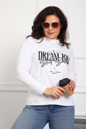(Лонгслив женский DREAM BIG) Женский лонгслив свободного кроя выполнен из натуральной кулирки, состоящей из качественного хлопка (95%) и эластичной лайкры (5%). Прямой удлинённый силуэт модели подчёркивает комфорт и свободу движений, а мягкие длинные рукава обеспечивают дополнительное тепло и уют. Округлый вырез горловины дополняет лаконичный дизайн изделия. Центральный элемент образа — оригинальный принт на груди с мотивирующей надписью "Dream Big Start Small", вдохновляющий мечтать масштабно и начинать уверенно даже с малого шага. Этот универсальный лонгслив станет отличным выбором для повседневного стиля, сочетаясь как с джинсами, так и спортивными брюками.