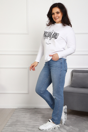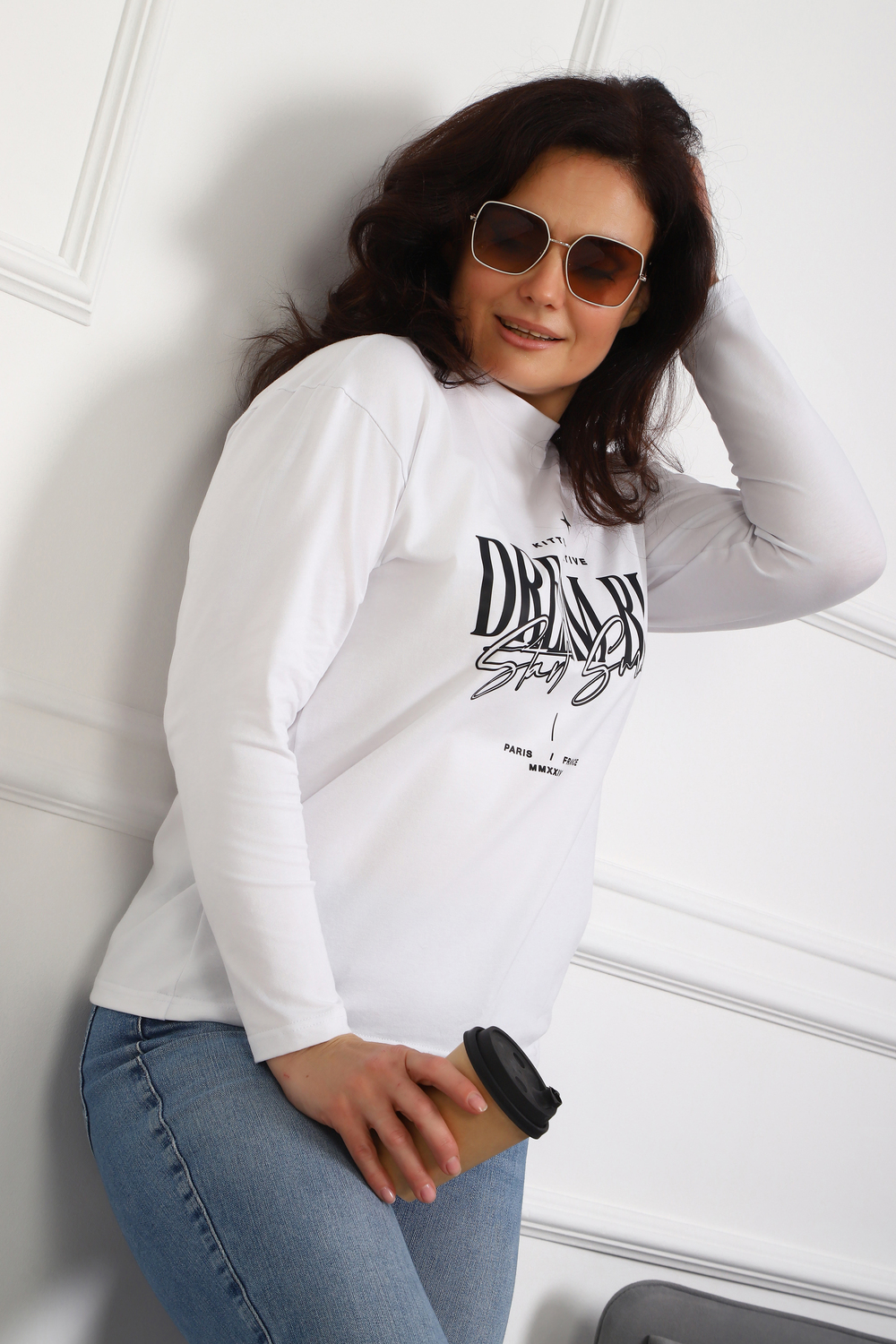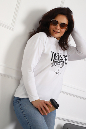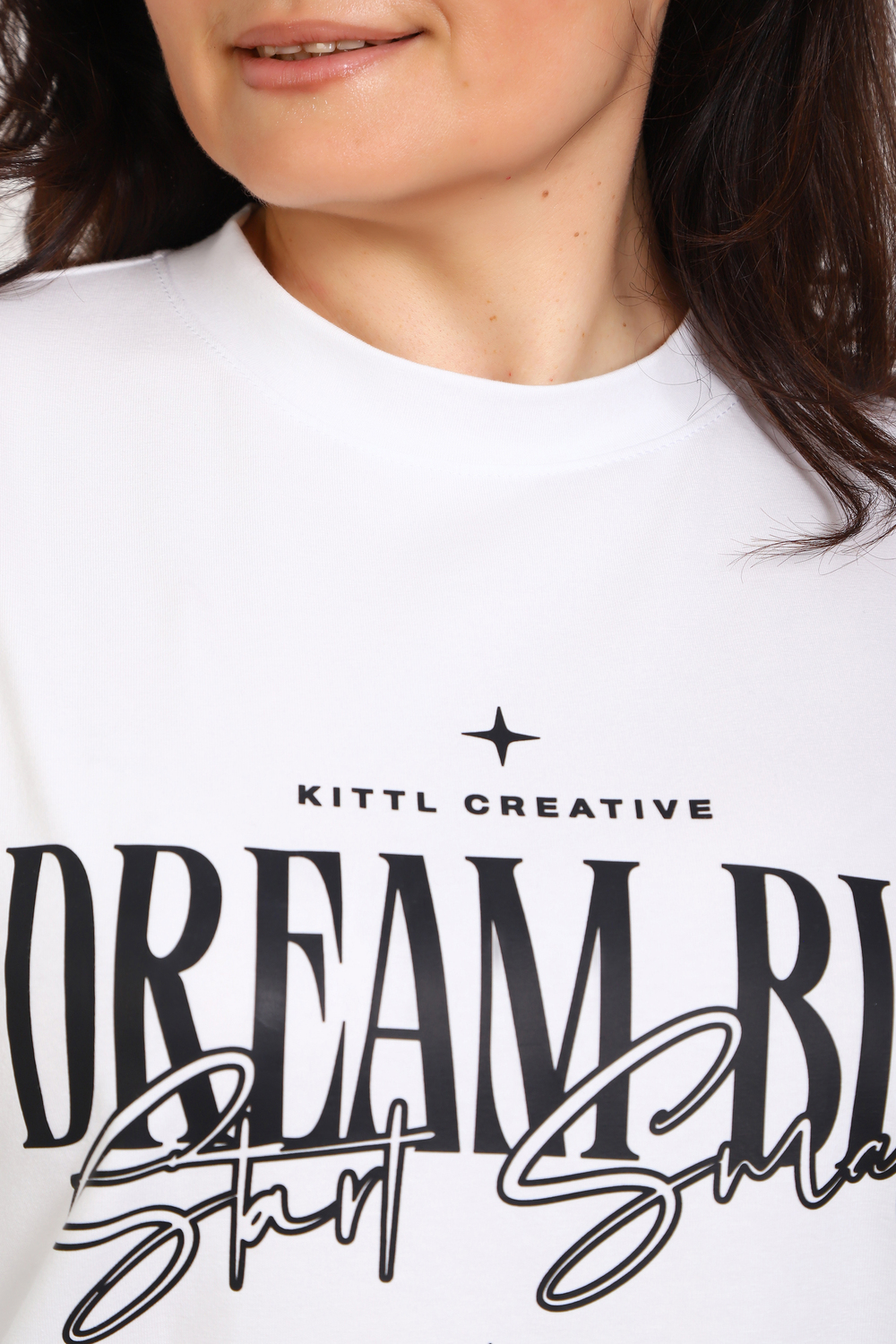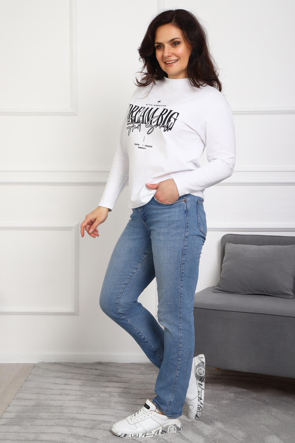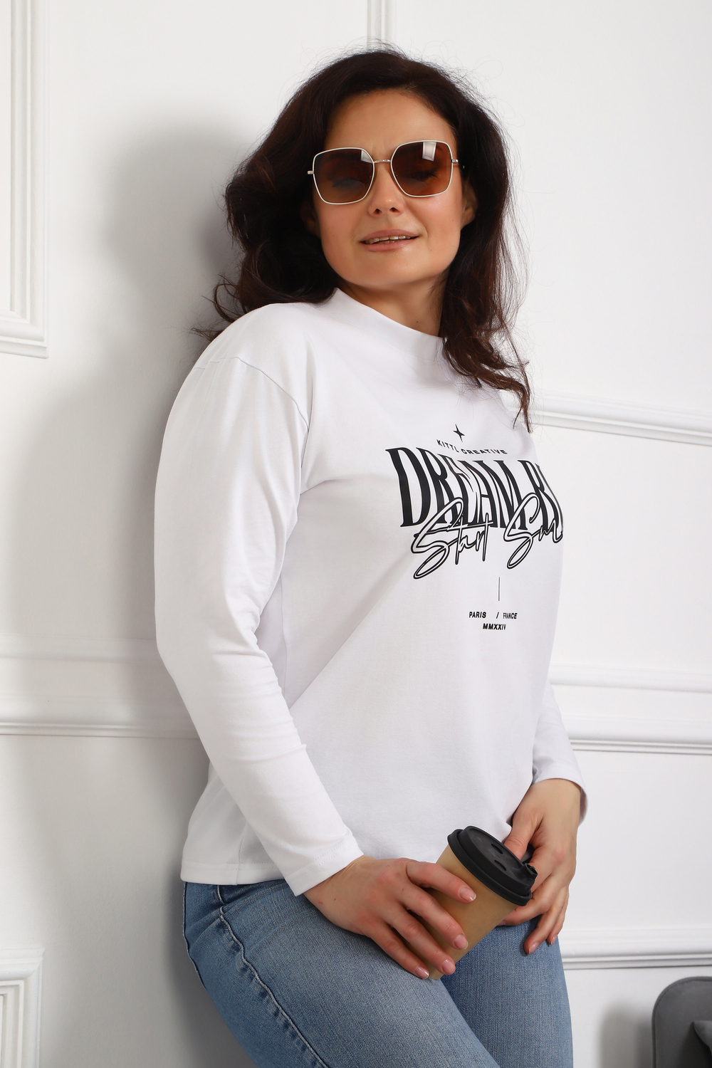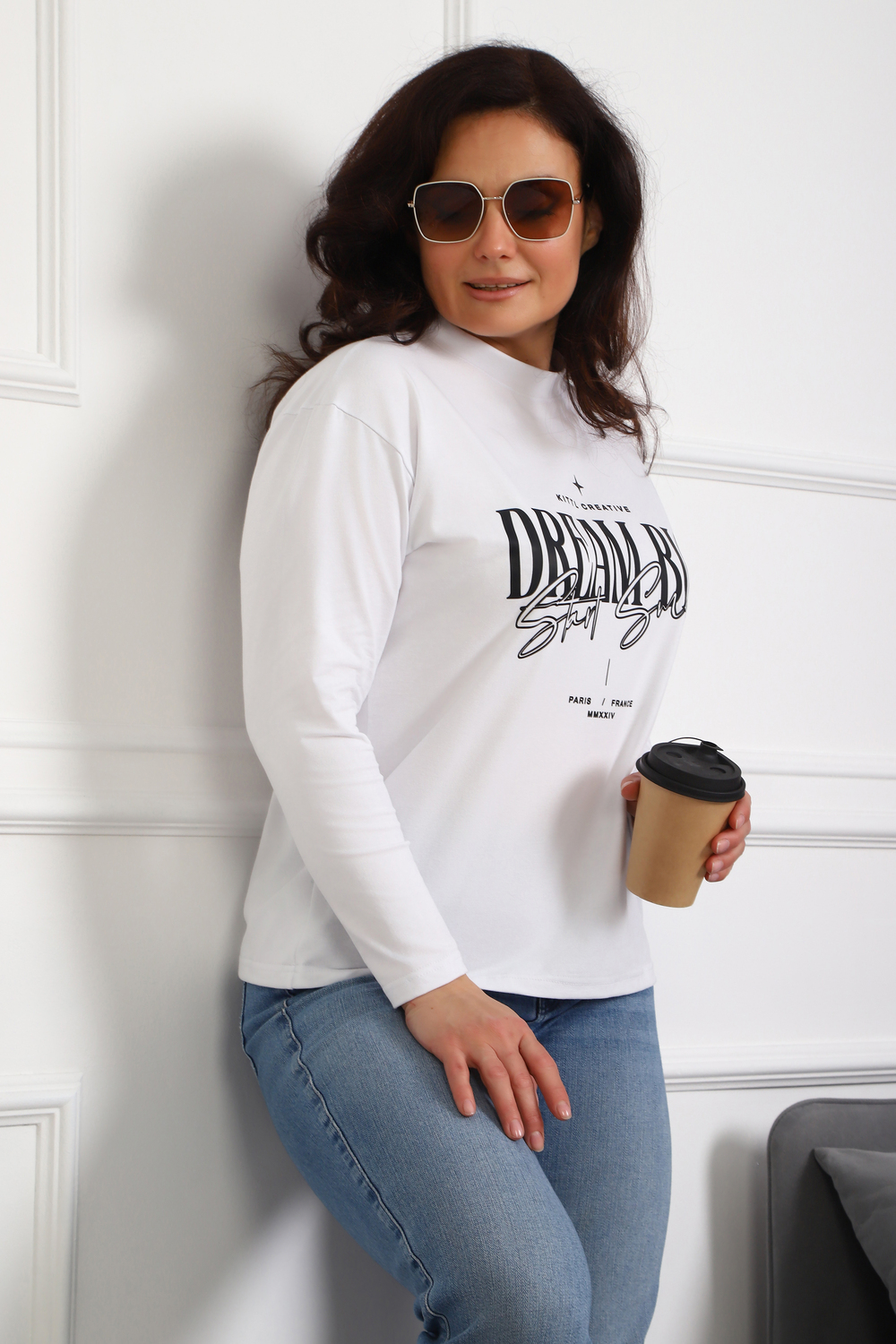 (Лонгслив женский DREAM BIG) Женский лонгслив свободного кроя выполнен из натуральной кулирки, состоящей из качественного хлопка (95%) и эластичной лайкры (5%). Прямой удлинённый силуэт модели подчёркивает комфорт и свободу движений, а мягкие длинные рукава обеспечивают дополнительное тепло и уют. Округлый вырез горловины дополняет лаконичный дизайн изделия. Центральный элемент образа — оригинальный принт на груди с мотивирующей надписью "Dream Big Start Small", вдохновляющий мечтать масштабно и начинать уверенно даже с малого шага. Этот универсальный лонгслив станет отличным выбором для повседневного стиля, сочетаясь как с джинсами, так и спортивными брюками.