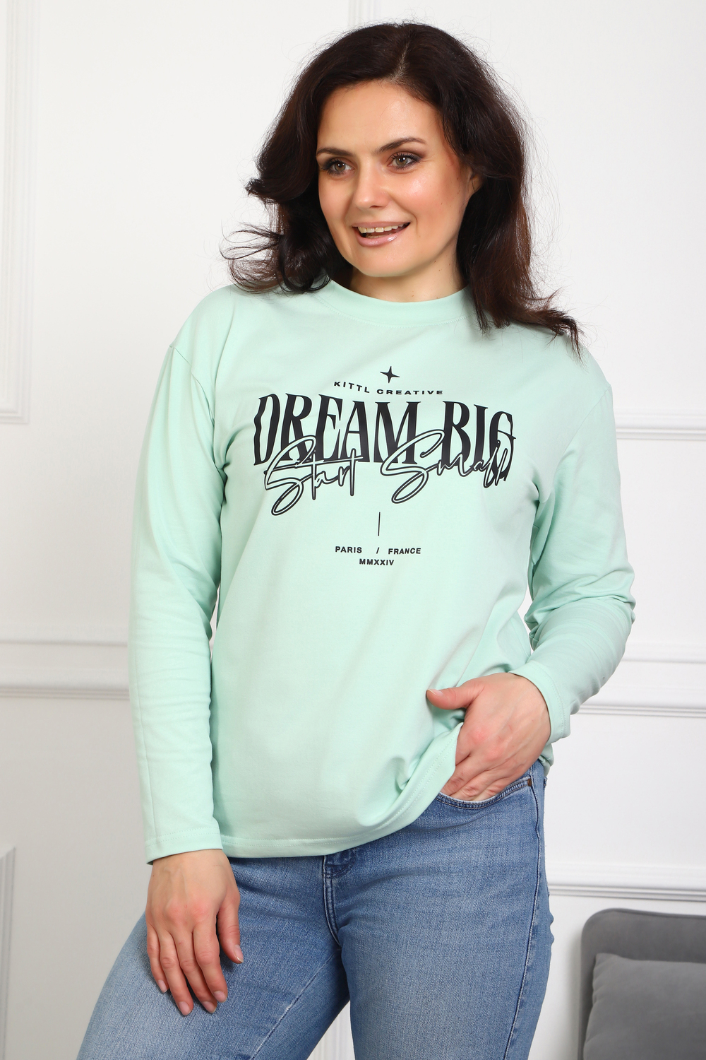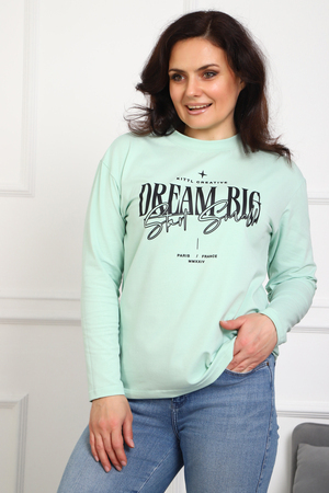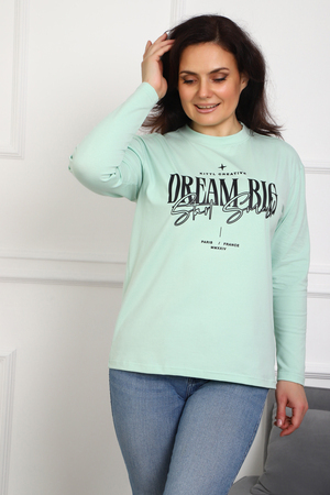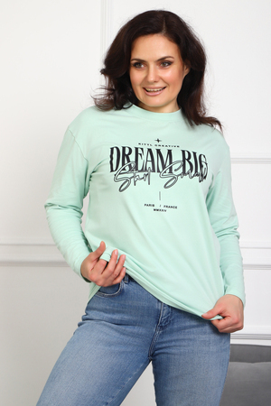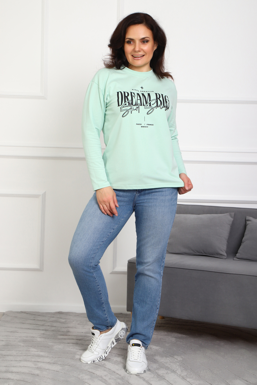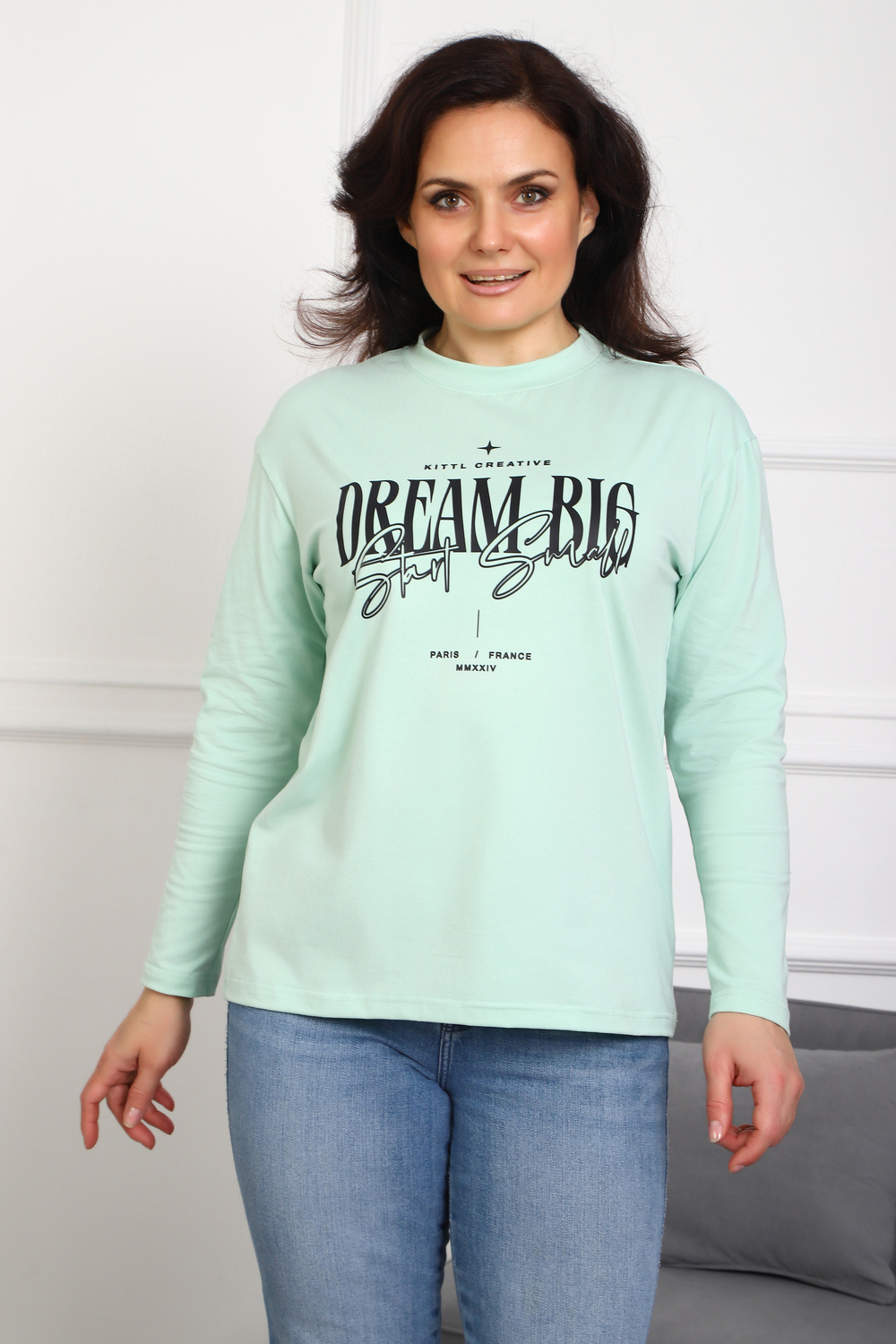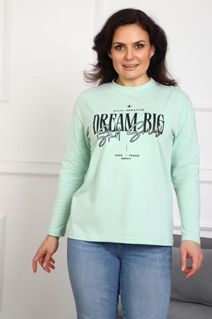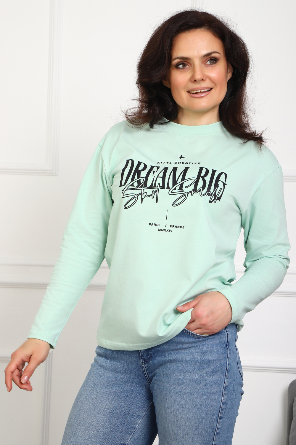 (Лонгслив женский DREAM BIG) Женский лонгслив свободного кроя выполнен из натуральной кулирки, состоящей из качественного хлопка (95%) и эластичной лайкры (5%). Прямой удлинённый силуэт модели подчёркивает комфорт и свободу движений, а мягкие длинные рукава обеспечивают дополнительное тепло и уют. Округлый вырез горловины дополняет лаконичный дизайн изделия. Центральный элемент образа — оригинальный принт на груди с мотивирующей надписью "Dream Big Start Small", вдохновляющий мечтать масштабно и начинать уверенно даже с малого шага. Этот универсальный лонгслив станет отличным выбором для повседневного стиля, сочетаясь как с джинсами, так и спортивными брюками.