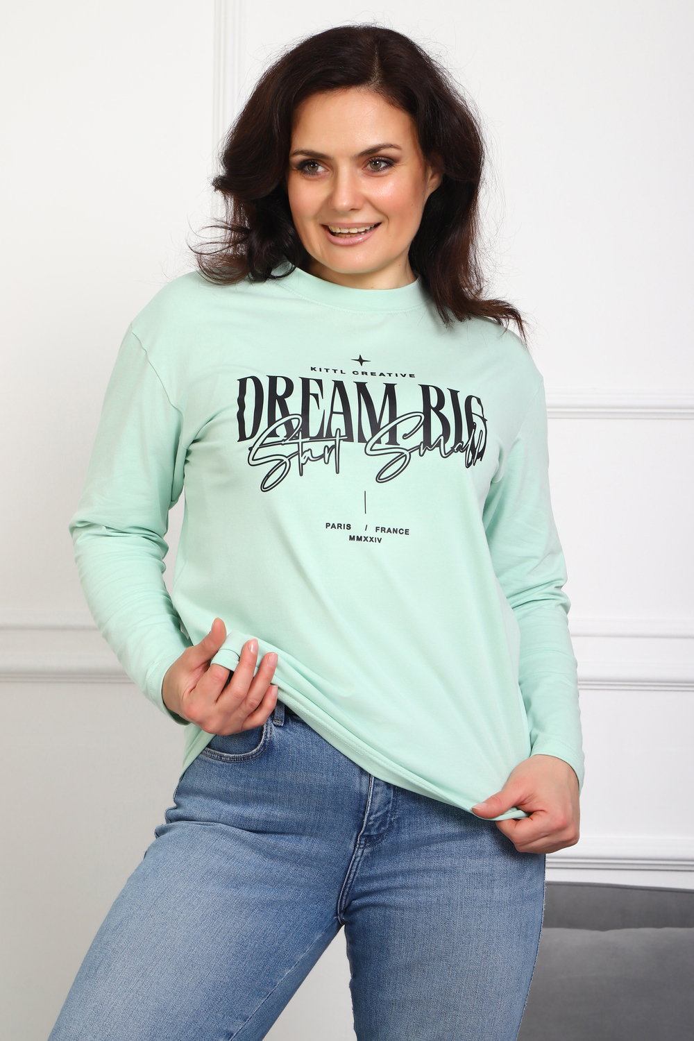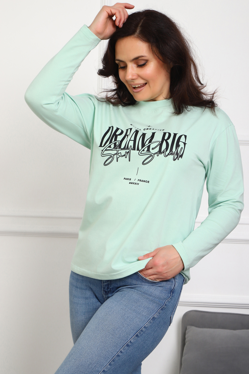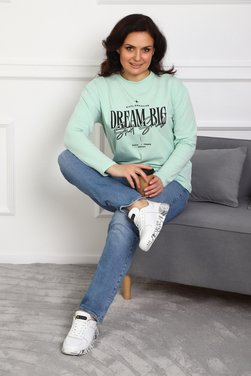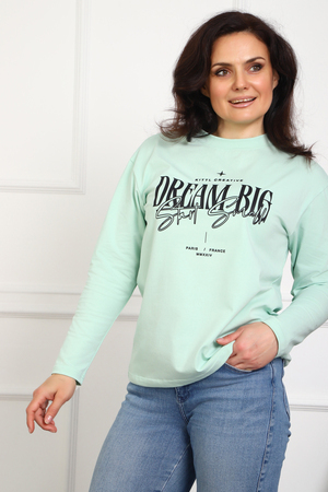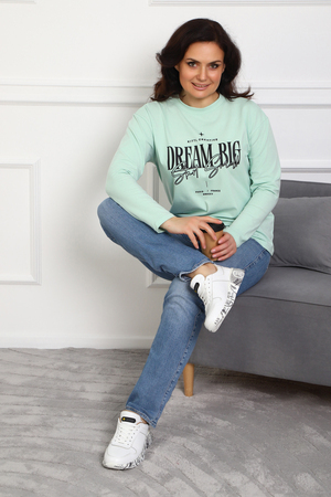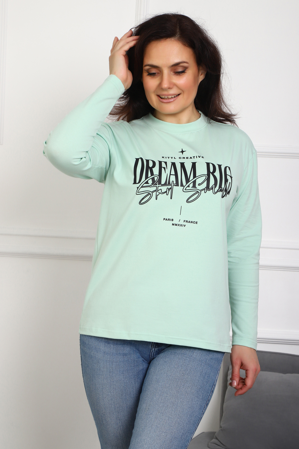 (Лонгслив женский DREAM BIG) Женский лонгслив свободного кроя выполнен из натуральной кулирки, состоящей из качественного хлопка (95%) и эластичной лайкры (5%). Прямой удлинённый силуэт модели подчёркивает комфорт и свободу движений, а мягкие длинные рукава обеспечивают дополнительное тепло и уют. Округлый вырез горловины дополняет лаконичный дизайн изделия. Центральный элемент образа — оригинальный принт на груди с мотивирующей надписью "Dream Big Start Small", вдохновляющий мечтать масштабно и начинать уверенно даже с малого шага. Этот универсальный лонгслив станет отличным выбором для повседневного стиля, сочетаясь как с джинсами, так и спортивными брюками.